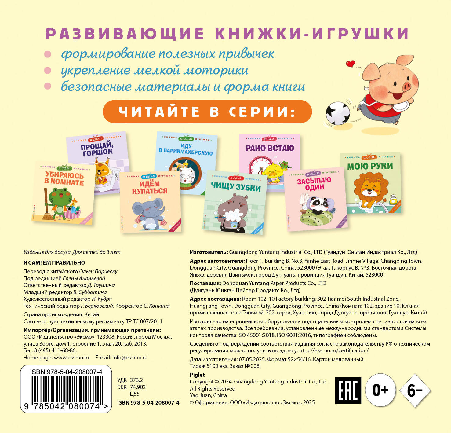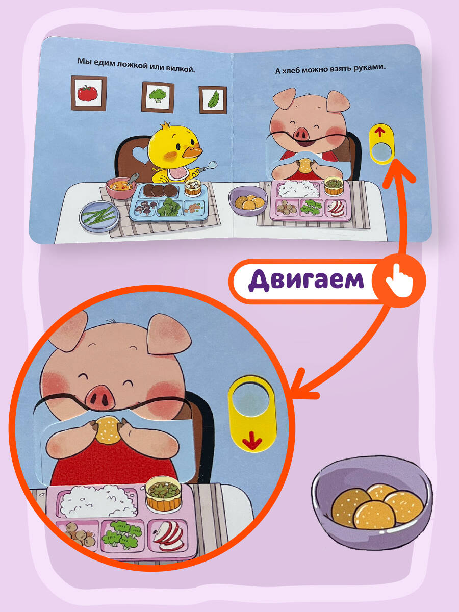 Интерактивные книги-игрушки про полезные привычки - то, что нужно всем родителям для веселого и эффективного воспитания малыша! Осваивать правила поведения с помощью книжек-игрушек - легко и интересно! На каждой странице подвижные элементы: окошки, крутилки, тянучки, которые развивают мелкую моторику и вовлекают ребенка в процесс обучения. Как правильно вести себя за столом? Какие продукты самые полезные? Почему нельзя торопиться во время еды? Вместе с веселым Поросенком малыш узнает простые и важные правила, которые помогут ему вырасти здоровым и воспитанным. Яркие иллюстрации привлекают внимание ребенка и дарят положительные эмоции. Прочные страницы и скругленные углы безопасны для маленьких ручек и долговечны. Компактный формат книги позволяет не только читать ее дома, но и брать с собой на прогулку или в путешествие. Издание предназначено для детей до 3-х лет. Выучите все полезные привычки в других книгах серии «Веселые деньки. Книги-игрушки о полезных привычках для малышей»: «Я сам! Засыпаю один», «Я сам! Идем купаться», «Я сам! Иду в парикмахерскую», «Я сам! Мою руки», «Я сам! Прощай, горшок», «Я сам! Рано встаю», «Я сам! Убираюсь в комнате», «Я сам! Чищу зубки».| Издательство | ООО "Издательство "Эксмо" |