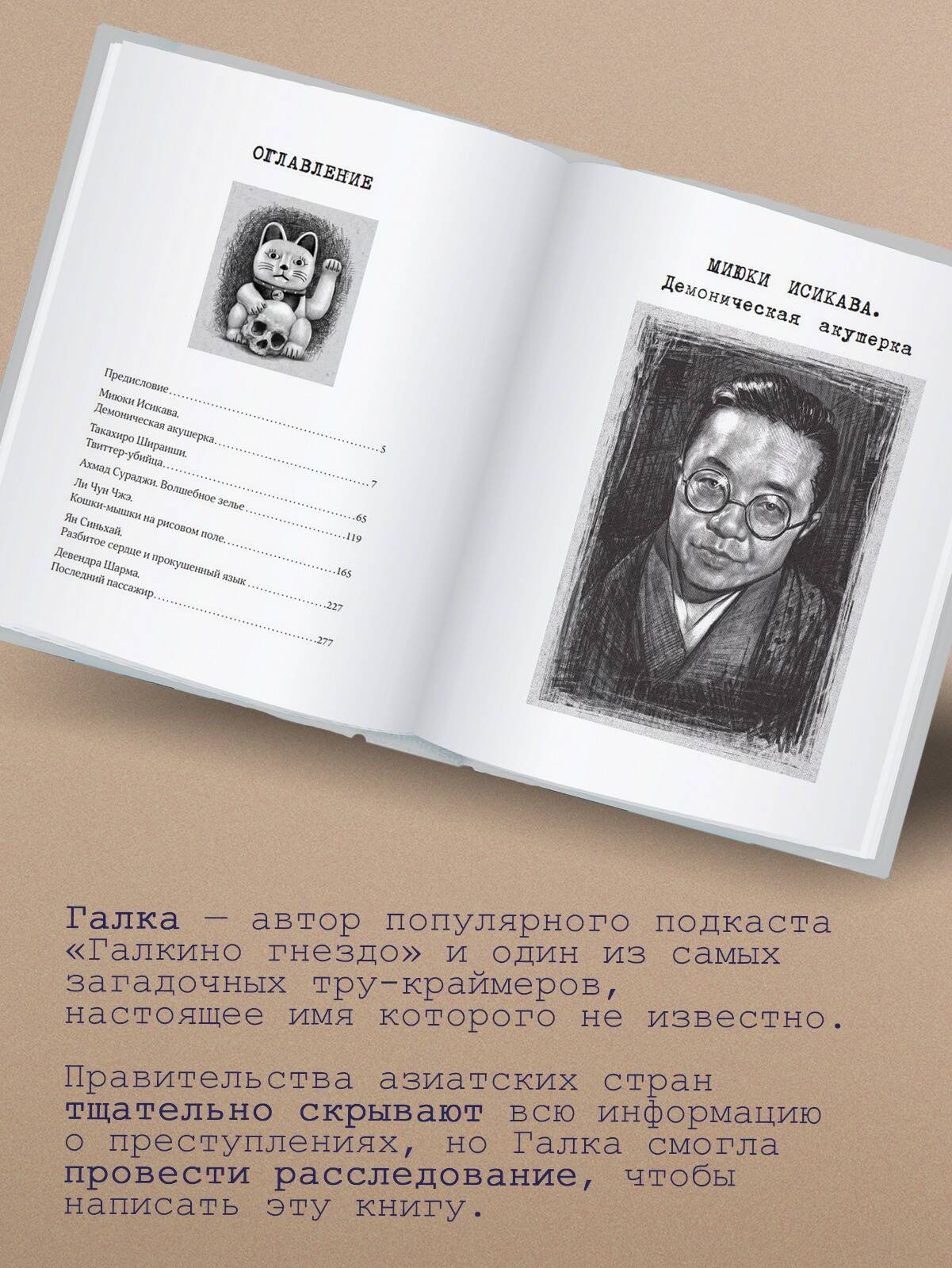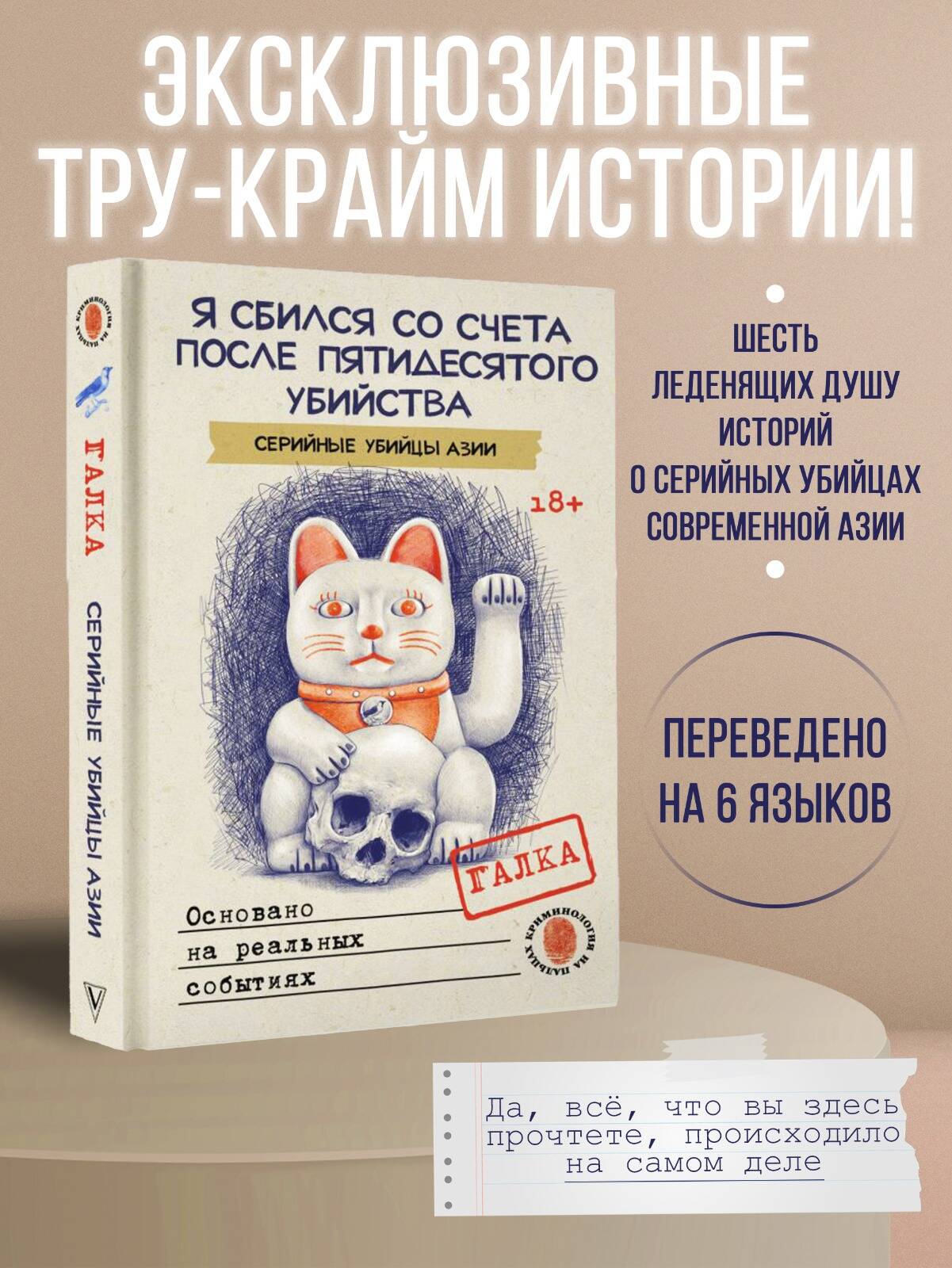 "Я сбился со счета после пятидесятого убийства" - цикл криминальных историй о самых известных серийных маньяках современной Азии. Каждый рассказ содержит подробное описание жизни и личности преступника - его культурного, экономического и социального происхождения. Автор внимательно изучает преступления, чтобы понять: что движет человеком, который не может остановиться и прекратить убивать? Правительства азиатских стран тщательно скрывают всю информацию о подобных кровавых происшествиях, поэтому автору пришлось провести настоящее расследование, чтобы написать эту книгу. Шесть глав - шесть леденящих душу историй о серийных убийцах современной Азии. Книга уже переведена на шесть языков. Галка - один из самых загадочных тру-крайм авторов. Больше четырех лет она выпускает подкаст "Галкино гнездо", который любят десятки тысяч слушателей в России и за рубежом. Истории о смерти, после которых хочется жить, - так говорят о выпусках подписчики Галки. И даже в сложные моменты жизни слушатели находят вдохновение и свет в том, как она говорит… о смерти.| Издательство | Издательство "АСТ" |