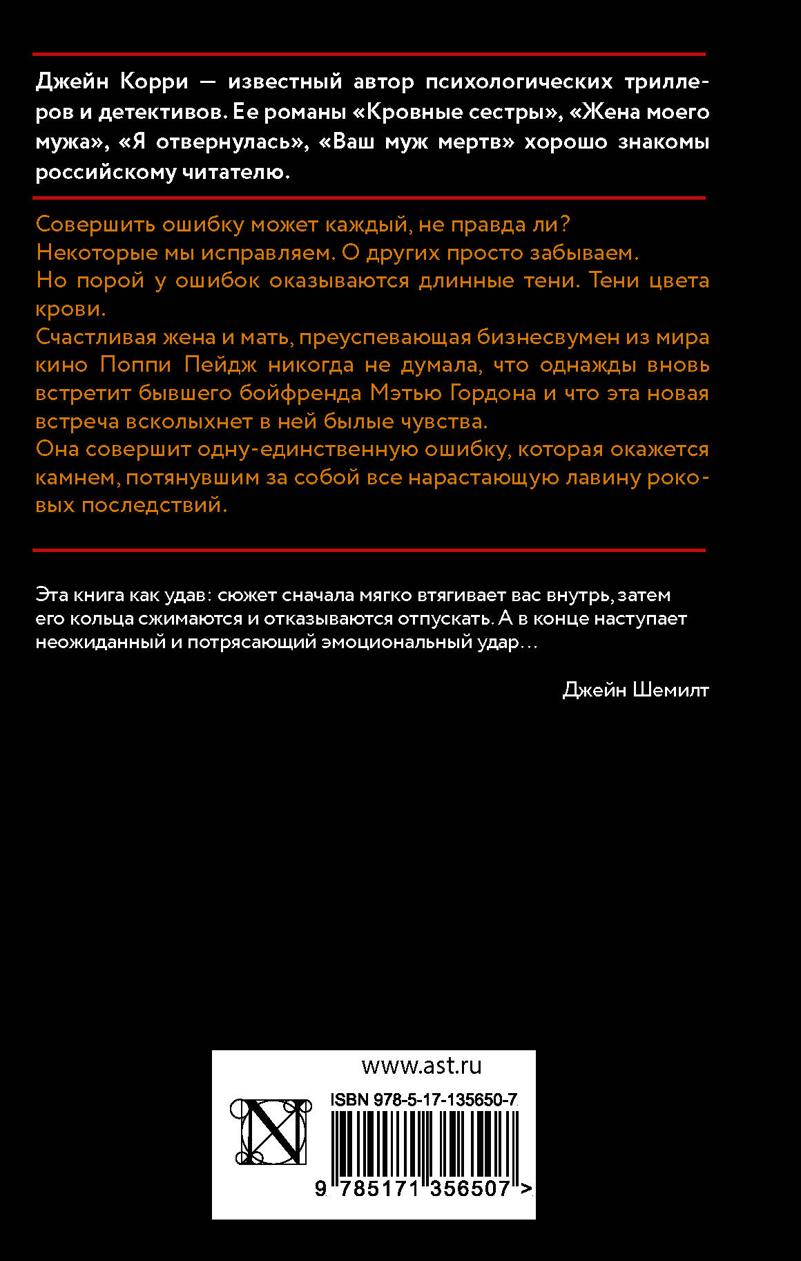 Совершить ошибку может каждый, не правда ли? Некоторые мы исправляем. О других просто забываем. Но порой у ошибок оказываются длинные тени. Тени цвета крови. Счастливая жена и мать, преуспевающая бизнесвумен из мира кино Поппи Пейдж никогда не думала, что однажды вновь встретит бывшего бойфренда Мэтью Гордона и что эта новая встреча всколыхнет в ней былые чувства. Она совершит одну-единственную ошибку, которая окажется камнем, потянувшим за собой все нарастающую лавину роковых последствий.| Издательство | ИЗДАТЕЛЬСТВО "АСТ" |