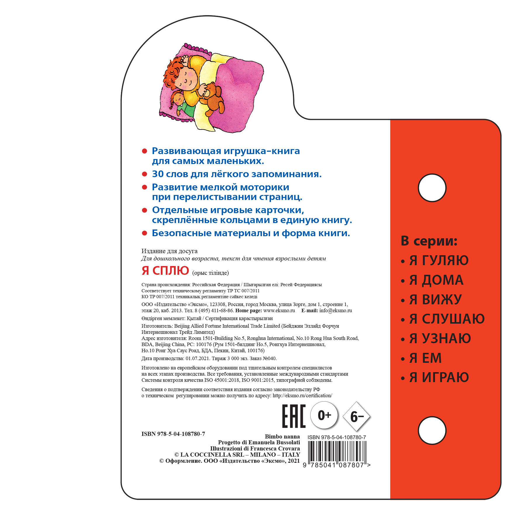 Каждая книга серии «Книжка-игрушка для дома и прогулки» - это целый комплект развивающих игровых карточек, скреплённых кольцами. Она станет отличным спутником вашего малыша в любое время дня! На карточках представлены 30 слов, которые легко запомнить благодаря красочным рисункам. Перебирая странички и играя с кольцами, малыш разовьёт мелкую моторику рук и пальчиков. Эти лёгкие и весёлые книжки можно брать с собой на прогулку: кольца легко и надёжно крепятся к коляске. Книга «Я сплю» расскажет малышу о том, как называются предметы для купания, одежда для сна, а также вещи и игрушки, которые находятся рядом с ним во время сна.| Издательство | ООО "Издательство "Эксмо" |