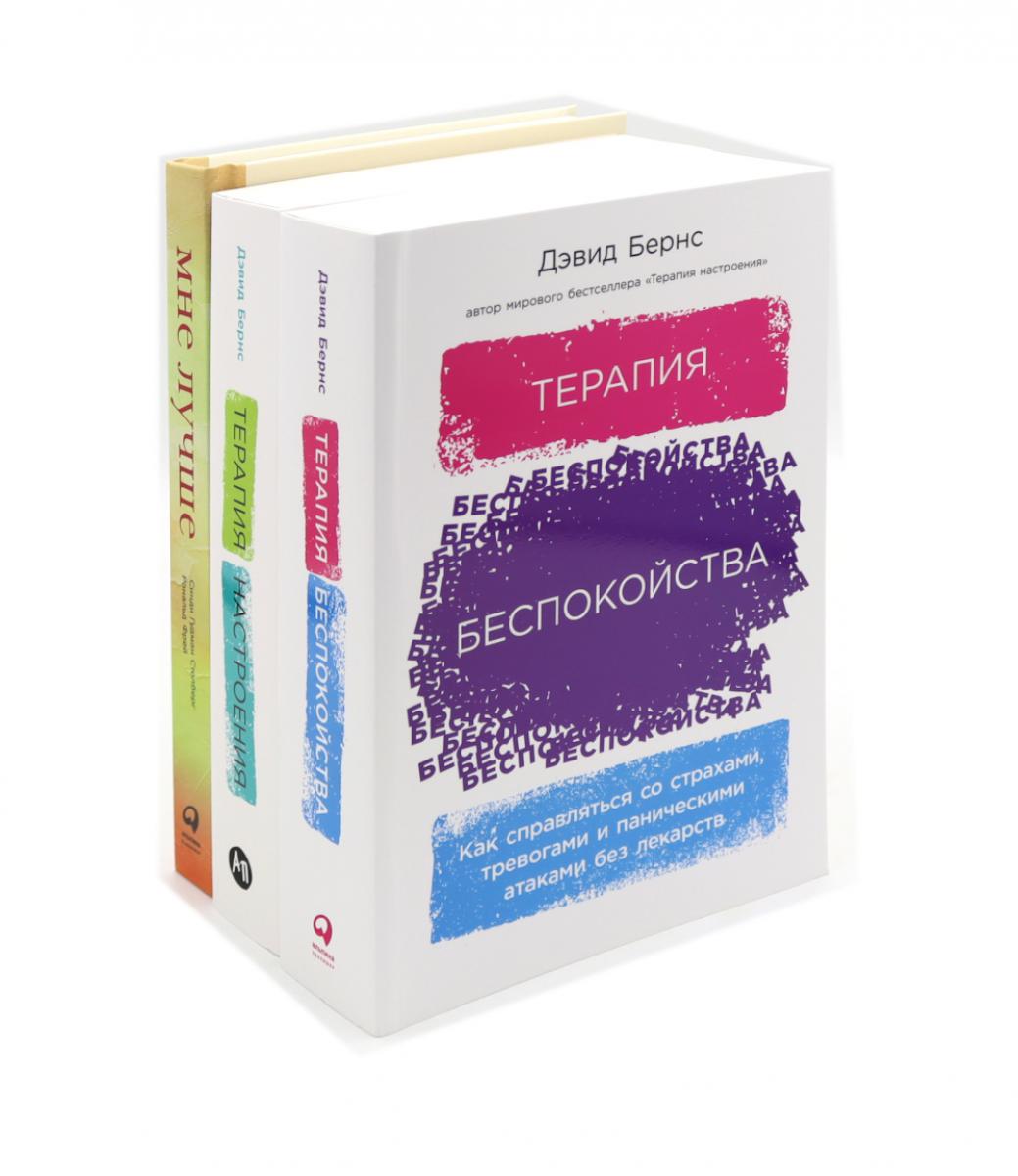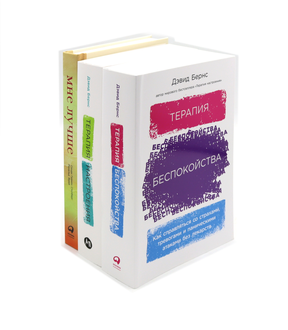 Комплект из 3 книг: «Терапия беспокойства: Как справляться со страхами, тревогами и паническими атаками без лекарств» Вы переживаете, что излишне застенчивы или постоянно во всем сомневаетесь? Вы не можете нормально спать, беспокоясь о своей работе, здоровье или отношениях? Вас мучает страх высоты или начинается паническая атака, когда садитесь за руль автомобиля? Дело в том, что в основе тревожных состояний лежат иррациональные убеждения, которые делают вас уязвимым и способны привести к депрессии, утверждает психотерапевт Дэвид Бернс, автор международного бестселлера «Терапия настроения» и один из основоположников когнитивно-поведенческой терапии. В своей новой книге он предлагает 40 простых и эффективных техник, которые помогут вам разобраться в причинах ваших тревог, справиться с негативными мыслями и преодолеть свои страхи. Доктор Бернс также делится результатами исследований лекарств, обычно назначаемых при депрессии, и объясняет, почему они иногда могут принести больше вреда, чем пользы. «Терапия настроения: Клинически доказанный способ победить депрессию без таблеток» Книга доктора медицинских наук Дэвида Бернса - мировой бестселлер. В ней он объяснил, как наши мысли определяют чувства и как с помощью когнитивно-поведенческой терапии справиться с беспокойством, чувством вины, низкой самооценкой и другими «черными дырами» депрессии. Перед вами новое, дополненное издание этой классической работы. Книга поможет разобраться в себе, выявить первые симптомы депрессии и победить негативные мысли. Автор не призывает отказаться от антидепрессантов. Наоборот, он говорит, что в зависимости от степени депрессии в некоторых случаях без консультации врача и назначения медикаментов не обойтись. Разработанный доктором Бернсом опросник для измерения настроения поможет определить наличие депрессивного состояния и оценить степень его тяжести, а также понять, нужна ли вам профессиональная помощь. «Мне лучше: Межличностная терапия против депрессии» Можно ли справиться с депрессией без лекарств? А если антидепрессанты прописал врач, как поддержать их эффект? Клинические психологи Синди Столберг и Рональд Фрей уверены, что залог крепкого душевного здоровья - не дорогостоящие препараты, а здоровые взаимоотношения с окружающими, от друзей и родственников до коллег и знакомого парикмахера. Больше 20 лет они практикуют интерперсональную (межличностную) психотерапию, которая помогает извлечь максимум из поддерживающих отношений, улучшить проблемные и, если необходимо, завершить вредные и разрушающие. Эта книга - пошаговое руководство с упражнениями и тестами, которое за 8-12 недель поможет почувствовать себя лучше и справиться со сложными жизненными обстоятельствами: предотвратить развод, пережить расставание, найти подход к подростку, выйти из зависимых отношений.