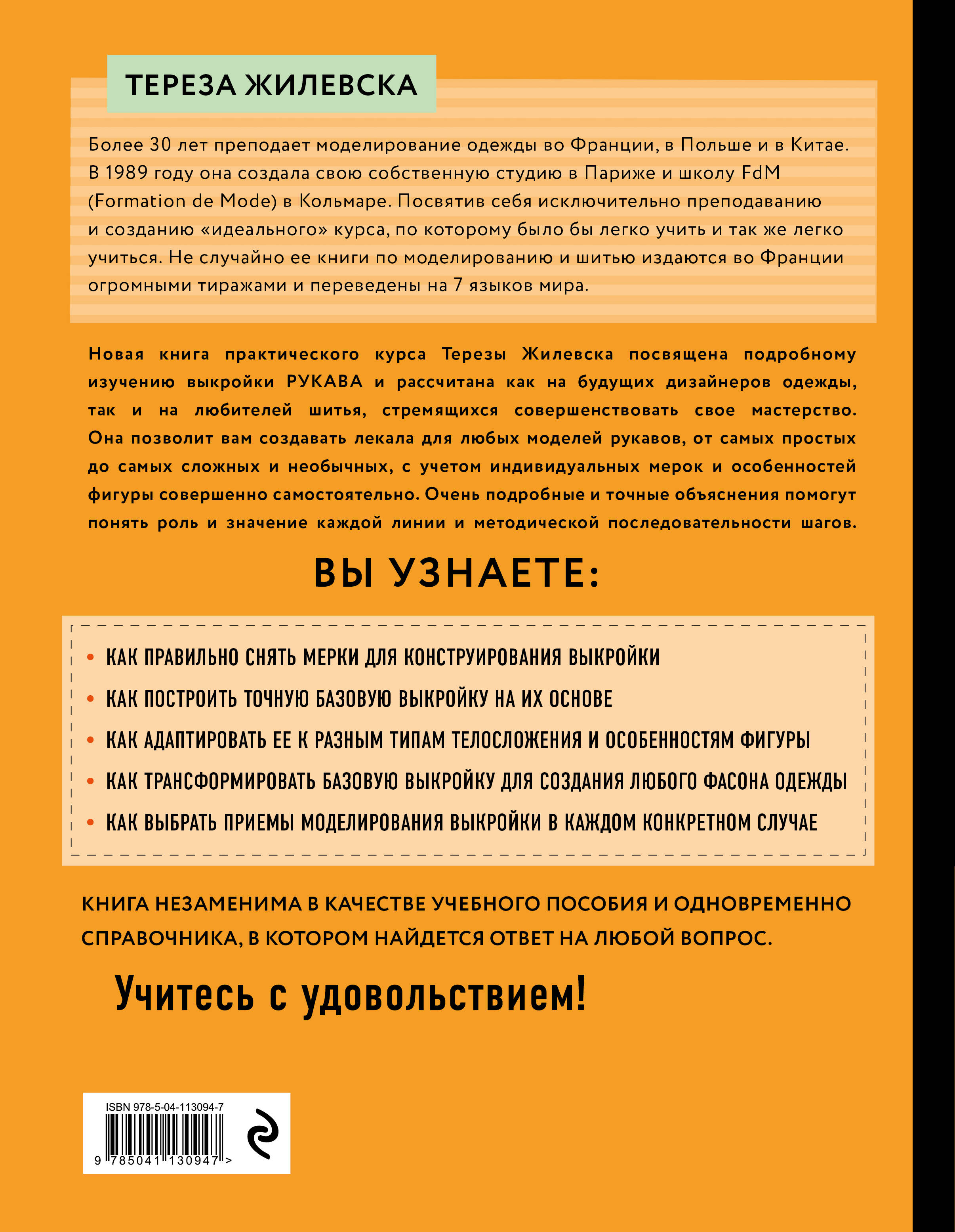 Новая книга уникального курса знаменитого французского дизайнера и педагога по кройке и шитью, чьи бестселлеры выходят во Франции огромными тиражами и переведены на семь языков мира, Терезы Жилевска, посвящена построению базовой выкройки и моделированию такой образующей детали модной одежды, как рукава. На основе конкретных современных моделей автор не только учит строить и преобразовывать базовую выкройку на любой размер и фасон, но, самое главное, подбирать подходящий метод преобразования выкройки под каждый конкретный случай! Благодаря этому уникальному материалу книги Терезы Жилески по-настоящему ценятся любителями и профессионалами шитья во всем мире! Просто, понятно, подробно, на практических примерах вы научитесь шить легко и непринужденно и станете настоящими мастерами своего дела.| Издательство | ООО "Издательство "Эксмо" |