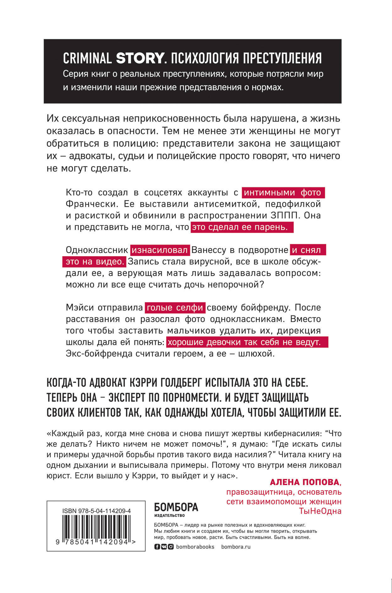КНИГА ОТ КОНСУЛЬТАНТА СЕРИАЛА «13 ПРИЧИН ПОЧЕМУ»! Их сексуальная неприкосновенность была нарушена, а жизнь оказалась в опасности. Тем не менее, эти женщины не могут обратиться в полицию: представители закона не защищают их - адвокаты, судьи и полицейские просто говорят, что ничего не могут сделать. Кто-то создал в соцсетях аккаунты с интимными фото Франчески. Ее выставили антисемиткой, педофилкой и расисткой и обвинили в распространении ЗППП. Она и представить не могла, что это сделал ее парень. Одноклассник изнасиловал Ванессу в подворотне и снял это на видео. Запись стала вирусной, все в школе обсуждали ее, а верующая мать лишь задавалась вопросом: можно ли все еще считать дочь непорочной? Мэйси отправила голые селфи своему бойфренду. После расставания он разослал фото одноклассникам. Вместо того чтобы заставить мальчиков удалить их, дирекция школы дала ей понять: хорошие девочки так себя не ведут. Экс-бойфренда считали героем, а ее - шлюхой. Когда-то адвокат Кэрри Голдберг испытала это на себе. Теперь она - эксперт по порномести. И будет защищать своих клиентов так, как однажды хотела, чтобы защитили ее. В предисловии правозащитница Алена Попова рассказывает, что делать, если подобное случилось с вами: куда обращаться, в каком порядке действовать и как защитить себя, когда кажется, что жить дальше невозможно. ОТЗЫВЫ: «Эти мемуары как призыв к справедливости в отношении частной жизни… Голдберг в "Пришли мне голое селфи" описывает свою борьбу одновременно непринужденно и с теплом… Случаи, о которых она рассказывает, выворачивают душу наизнанку, а манера изложения облегчает то, что, по большому счету, является невыносимо тяжелым грузом. В то же время это делает доступной сложную юридическую историю». - New York Times Book Review «В эпоху доксинга, порномести, троллей и женоненавистников книга Кэрри Голдберг, адвоката по правам тех, кто стал жертвой интернет-преследований, заслуживает внимания. Рассказывая эти душераздирающие истории, юрист дает голос тем, кто испытал немыслимое насилие». - Esquire, Best Nonfiction Books of 2019 «Важная книга, которая, будем надеяться, приведет к переменам». - Kirkus Reviews «Это большое окно в нынешнее состояние прав жертв и потенциально мощный ресурс для читателей, имеющих дело с жестоким обращением или преследованием». - Publishers Weekly «За 10 лет работы адвокатом по защите прав потерпевших Кэрри Голдберг видела все: человека, который грозился взорвать бомбу от имени своей бывшей девушки; 15-летнюю девушку, которую изнасиловали и отстранили от занятий в школе, когда та сообщила о преступлении; мужчину, который с помощью приложения для знакомств отправил 1200 мужчин в дом своей бывшей. "Пришли мне голое селфи" подробно рассказывает, как взять ситуацию под контроль и защитить себя». - Marie Claire «Каждый раз, когда мне снова и снова пишут жертвы кибернасилия: «Что же делать? Никто ничем не может помочь!», я думаю: «Где искать силы и примеры удачной борьбы против такого вида насилия?». Читала книгу на одном дыхании и выписывала примеры. Потому что внутри меня ликовал юрист. Если вышло у Кэрри, то выйдет и у нас». - Алена Попова, правозащитница, основатель сети взаимопомощи женщин «ТыНеОдна»| Издательство | ООО "Издательство "Эксмо" |