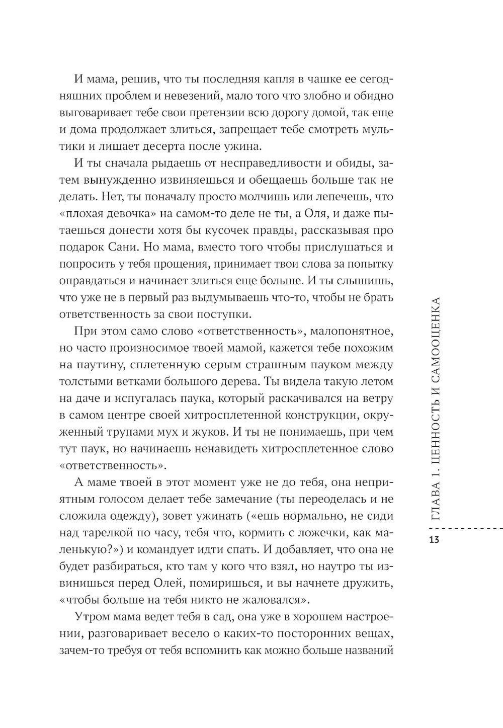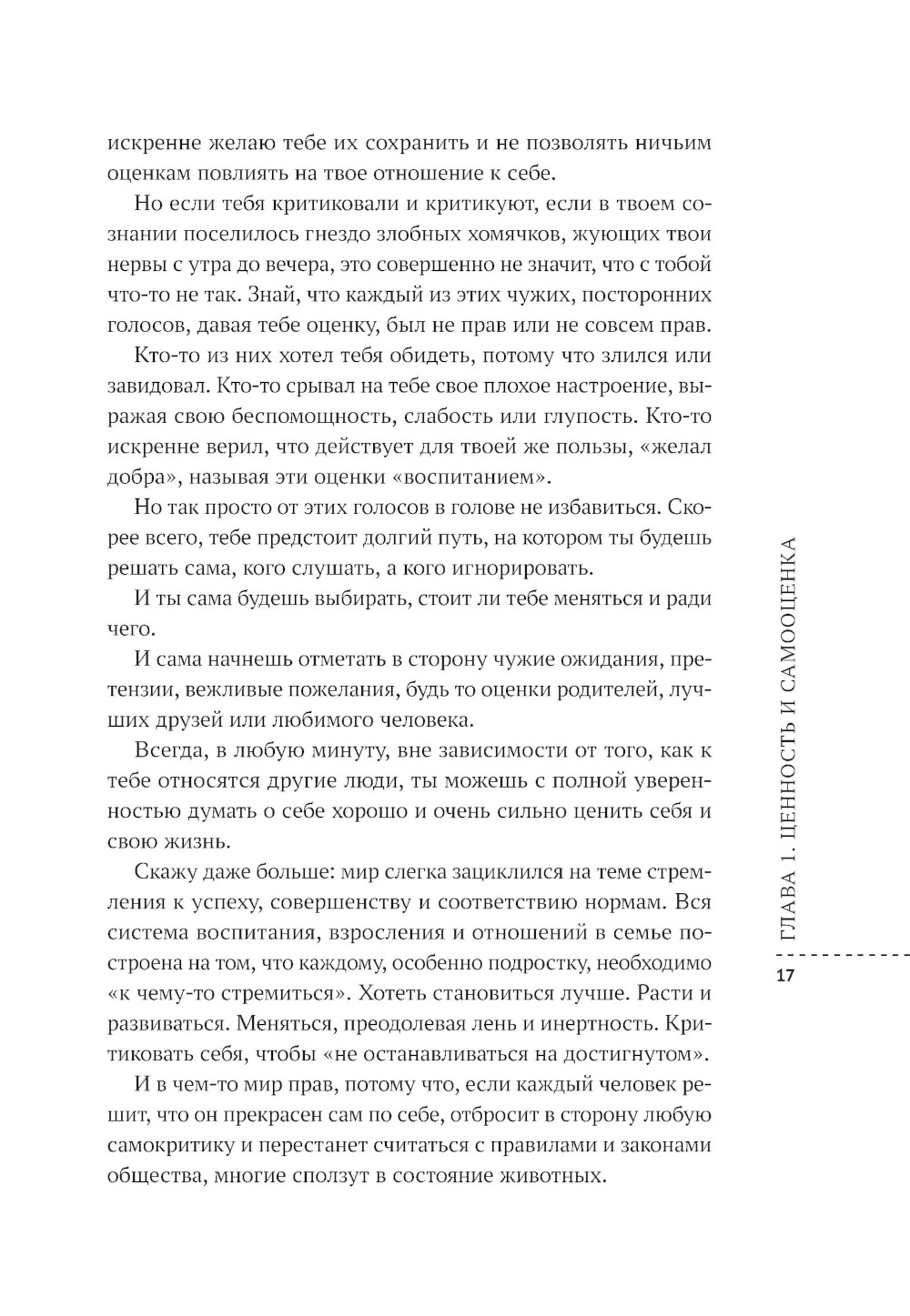 И в этой книжке ты не встретишь ничего из серии "ты же девочка", здесь нет пустых позитивных советов из серии "полюби себя", "будь добрее", "заведи себе друзей", "займись чем-нибудь интересным". Все эти штампы даже скучно обсуждать. Гораздо интереснее - избавиться от других, гораздо более важных, ограничений и установок общества, которые не так очевидны. И еще интереснее - разобраться с нашими внутренними страхами и сомнениями, которые часто мешают жить радостно и свободно.