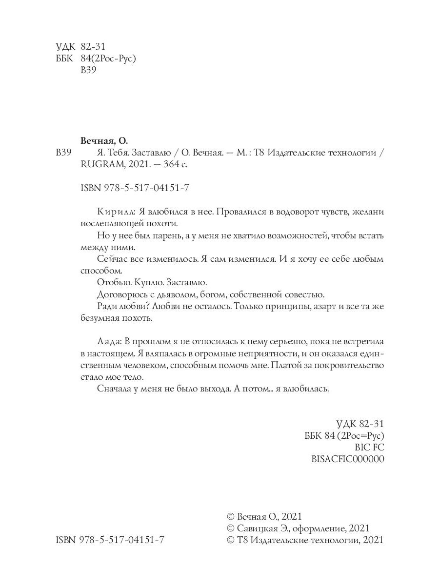 Кирилл: Я влюбился в нее. Провалился в водоворот чувств, желании ослепляющей похоти. Но у нее был парень, а у меня не хватило возможностей, чтобы встать между ними. Сейчас все изменилось. Я сам изменился. И я хочу ее себе любым способом. Отобью. Куплю. Заставлю. Договорюсь с дьяволом, богом, собственной совестью. Ради любви? Любви не осталось. Только принципы, азарт и все та же безумная похоть. Лада: В прошлом я не относилась к нему серьезно, пока не встретила в настоящем. Я вляпалась в огромные неприятности, и он оказался единственным человеком, способным помочь мне. Платой за покровительство стало мое тело. Сначала у меня не было выхода. А потом... я влюбилась.| Издательство | Т8 RUGRAM |