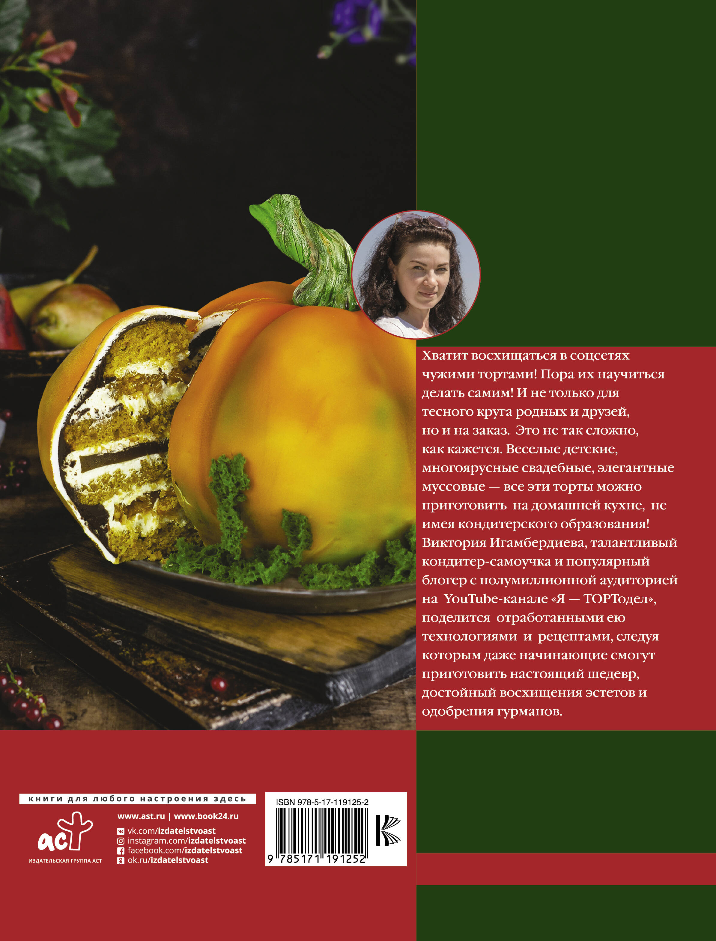 Виктория Игамбердиева, талантливый кондитер-самоучка и популярный блогер с полумиллионной аудиторией рассказывает, как, не имея кондитерского образования, можно научиться делать шикарные торты на собственной кухне. И не только для близких, но и на заказ! Большинство рецептов в книге сопровождаются QR-кодами, отсканировав которые читатели смогут посмотреть видео-уроки автора на заданную тему. Автор делится своими фирменными рецептами коржей, начинок, декора для торта, которые разработала сама и опробовала на сотнях десертов. А еще Виктория публикует пошаговые уроки создания своих самых необычных тортов.| Издательство | Издательство "АСТ" |