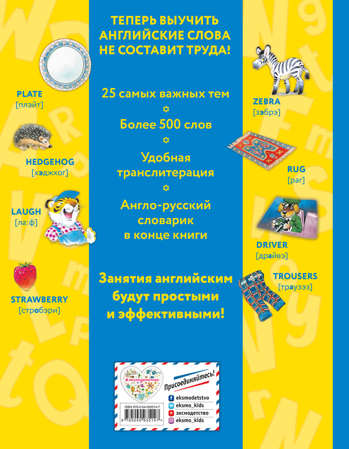 Замечательные иллюстрации Тони Вульфа любят и дети, и взрослые. В этой книге они помогут маленьким читателям освоить английские слова по самым важным темам. Транслитерация русскими буквами позволит легко разобраться в произношении английских слов, а забавные рифмовки - запомнить их и научиться правильно применять. Книга предназначена для детей старшего дошкольного возраста. Она подойдет для занятий с родителями или репетитором.| Издательство | ООО "Издательство "Эксмо" |