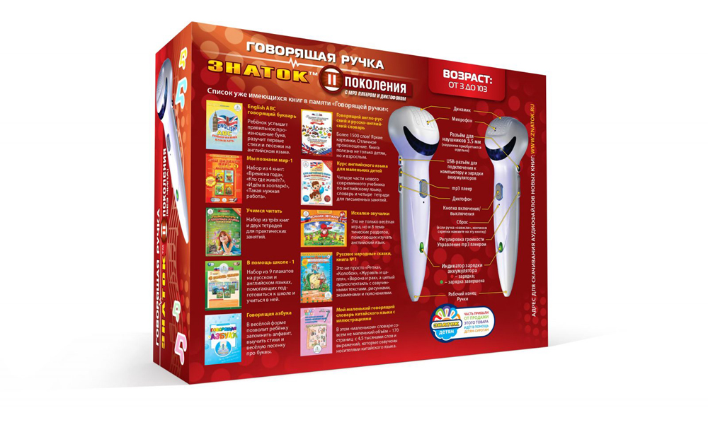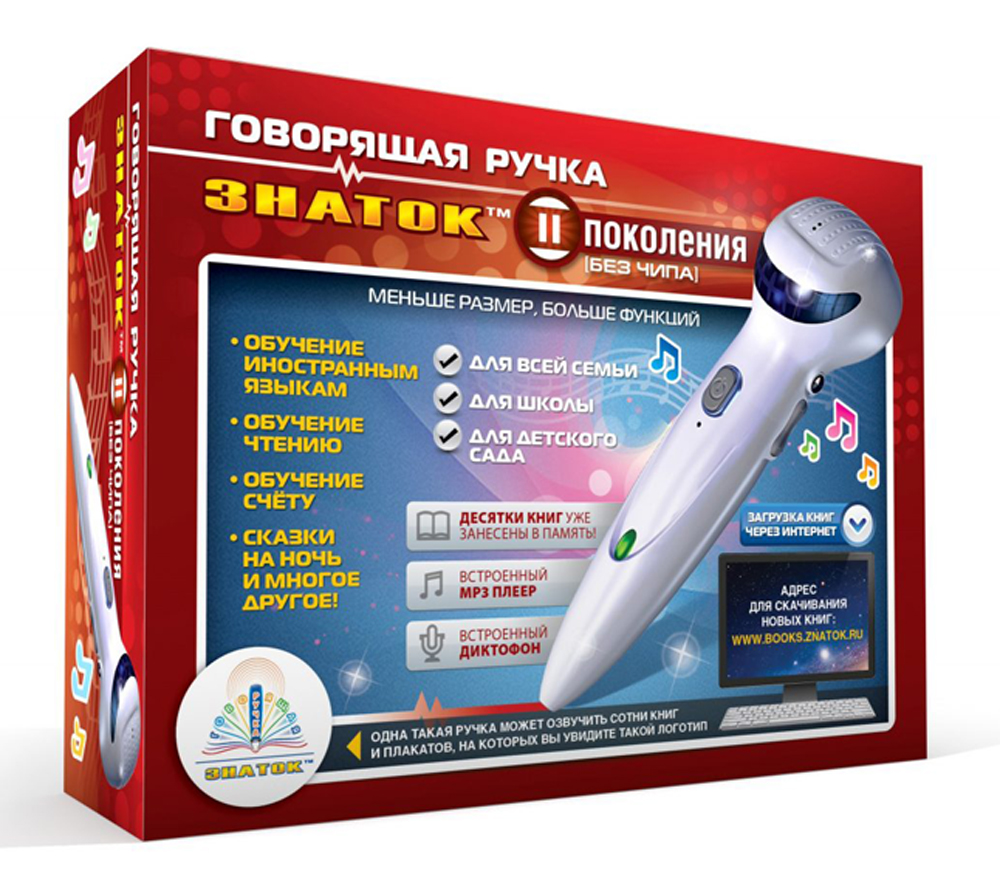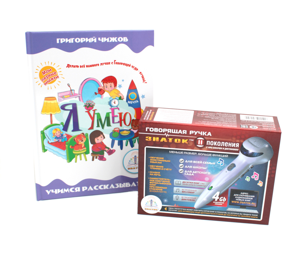 Комплект из книги и говорящей ручки: «Я умею» Эта игровая «говорящая» книга поможет дошкольникам по-новому, в деталях, увидеть и запомнить привычные вещи и предметы и научиться уверенно и интересно рассказывать об окружающем мире. - Все тексты озвучены профессиональными актёрами; - Все основные персонажи иллюстраций озвучены; - При прикосновении «Говорящей ручкой ЗНАТОК» к кружкам с восклицательными знаками звучат дополнительные пояснения; - Звуковые экзамены с самостоятельным поиском правильных ответов. Ручка II поколения 4GB Очень простая в использовании уникальная помощница, предназначенная для эффективного обучения иностранным языкам, как детей, так и взрослых. Она так же поможет обучить детей чтению и счёту, расскажет сказку на ночь, познакомит ребёнка с окружающим миром. Причём, ручка озвучивает не только слова, но и рисунки! Для превращения ручки в удивительного рассказчика и доброго учителя достаточно коснуться, расположенного на книге или плакате, вот такого логотипа > В память ручки (4 GB) уже внесены книги, указанные на обратной стороне коробки и в инструкции. Аудиофайлы других книг можно бесплатно скачать в разделе «Книги» или с информационного сайта www.books.znatok.ru, подсоединив выключенную ручку при помощи прилагаемого USB-кабеля к компьютеру. Если памяти будет не хватать, то файлы можно перенести из ручки в компьютер, и создать там свою библиотеку аудиофайлов, при необходимости закачивая их в ручку. Особого внимания заслуживают входящие в набор аудиостикеры и их применение.| Издательство | ЗНАТОК |