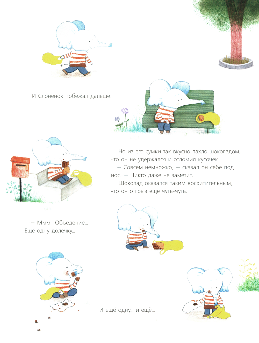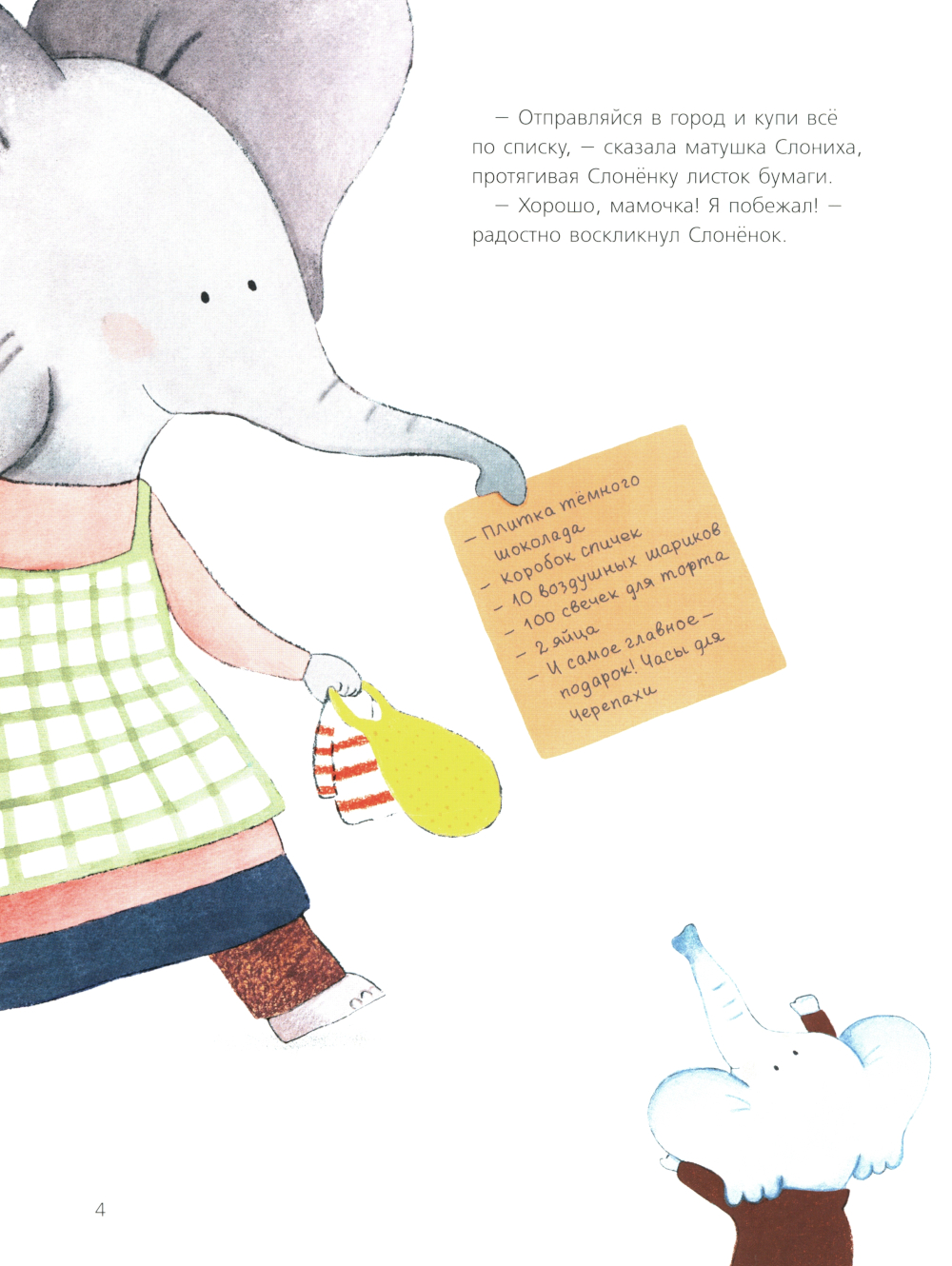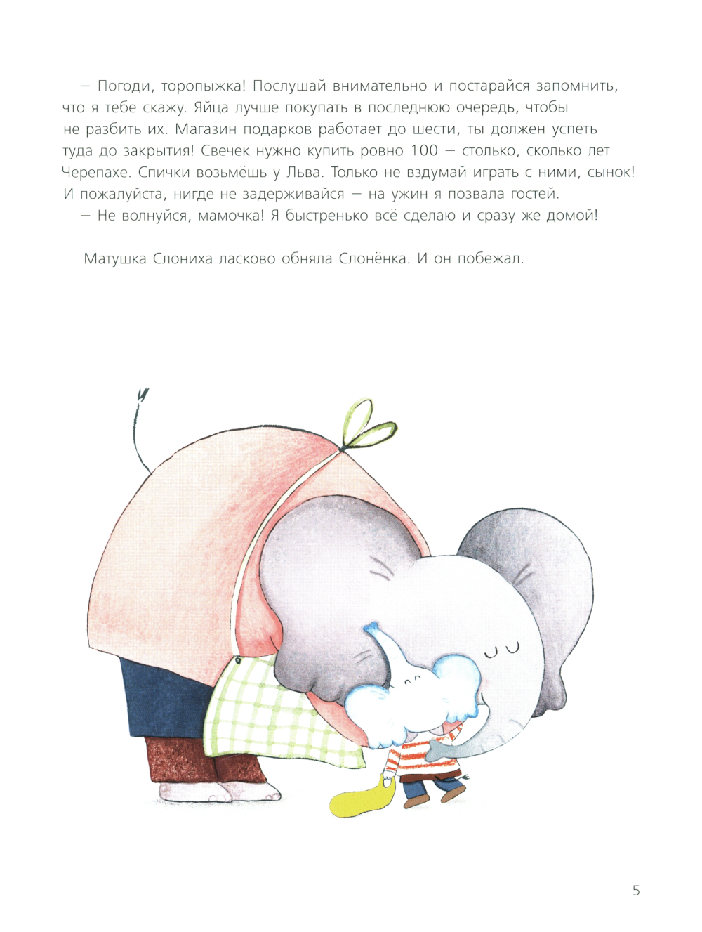 Сегодня в городе особенный день - Черепахе исполняется 100 лет! Слониха хочет устроить для нее настоящий праздник и всем вместе отметить это радостное событие. Слоненок вызывается помочь маме, ведь он уже большой! Матушка Слониха дает сыну целый список дел: забрать у Льва коробок спичек, купить плитку шоколада, два яйца, сто свечек для именинного торта, десять воздушных шариков и самое главное - подарок, часы для Черепахи! Радостный бежит Слоненок выполнять мамины поручения. Только вот беда: что-то постоянно отвлекает его и задерживает. Он съедает по дороге почти весь шоколад; прыгает с друзьями через скакалку и разбивает яйца; падает в речку и теряет список; покупает десять свечек вместо ста; отпускает в небо все воздушные шарики. И еще, еще... он опаздывает в магазин подарков. Ужасно расстроенный возвращается он домой. И признается маме, что не выполнил ни одного ее поручения. Он очень переживает из-за того, что оставил именинницу без подарка и так сильно подвел маму. Однако матушка Слониха объясняет сыну, что на самом деле он не огорчил ее, а порадовал. Ведь главное - вовсе не торт со свечками и не подарок. Важнее всего то, что Слоненок не прошел мимо чужой беды и помог малышу Сурикатику найти свою маму. Автор этой книжки-картинки Сусанна Исерн, практикующий психолог и мама троих детей, очень хорошо знает, как важно с ранних лет развивать в человеке эмоциональный интеллект. Все ее истории учат ребенка понимать себя, свои чувства, строить отношения с другими людьми и в конечном итоге становиться счастливым. Вот почему книги писательницы издаются на разных языках, и родители во всем мире с удовольствием читают их своим детям. Книжка написана простым языком, поэтому малышу 3-5 лет будет легко воспринимать ее на слух. Слушая, он сможет рассматривать милые картинки, которые испанская художница Марта Каброль наполнила множеством интересных деталей. Книги серии «Для самых маленьких» нравятся любознательным малышам от трех до пяти лет и взрослым, которые ценят хорошие иллюстрации и любят обсуждать с детьми прочитанное.| Издательство | Мелик-Пашаев |