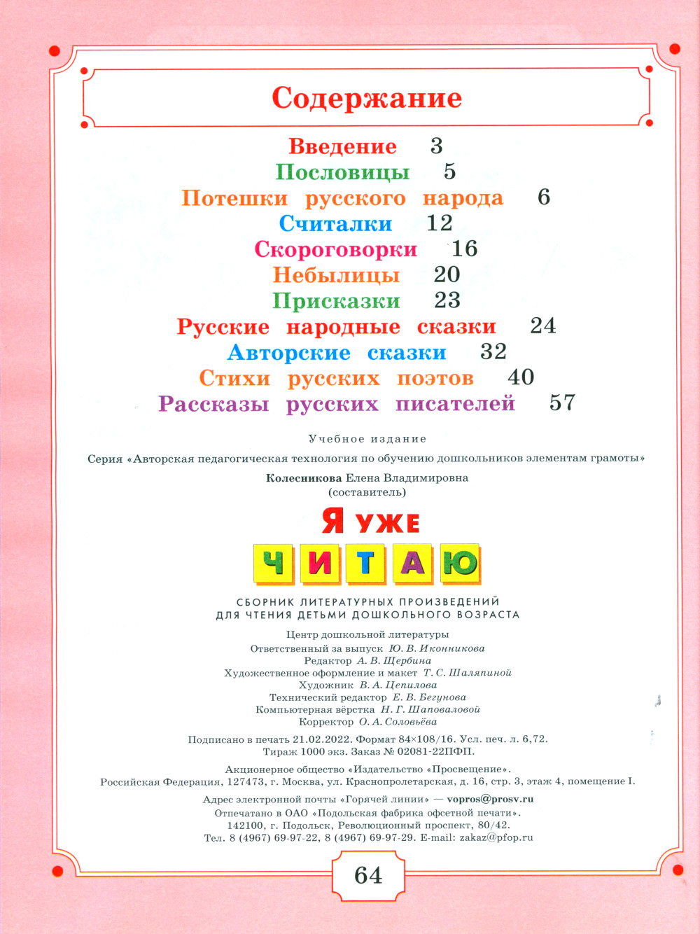 Сборник литературных произведений входит в авторскую программу «От звука к букве. Формирование звуковой аналитико-синтетической активности дошкольников как предпосылки обучения грамоте» и включает в себя пословицы, потешки, песенки, считалки, скороговорки, сказки, рассказы, стихи русских поэтов. Предназначен для детей, умеющих читать, а также для чтения взрослыми детям. В учебное пособие включены литературные тексты, которые автор на протяжении многих лет использовал в работе с детьми. Большинство произведений входит в комплексные программы для дошкольных образовательных организаций. Рекомендуется родителям, педагогам, воспитателям для занятий с детьми дошкольного возраста.| Издательство | Просвещение |