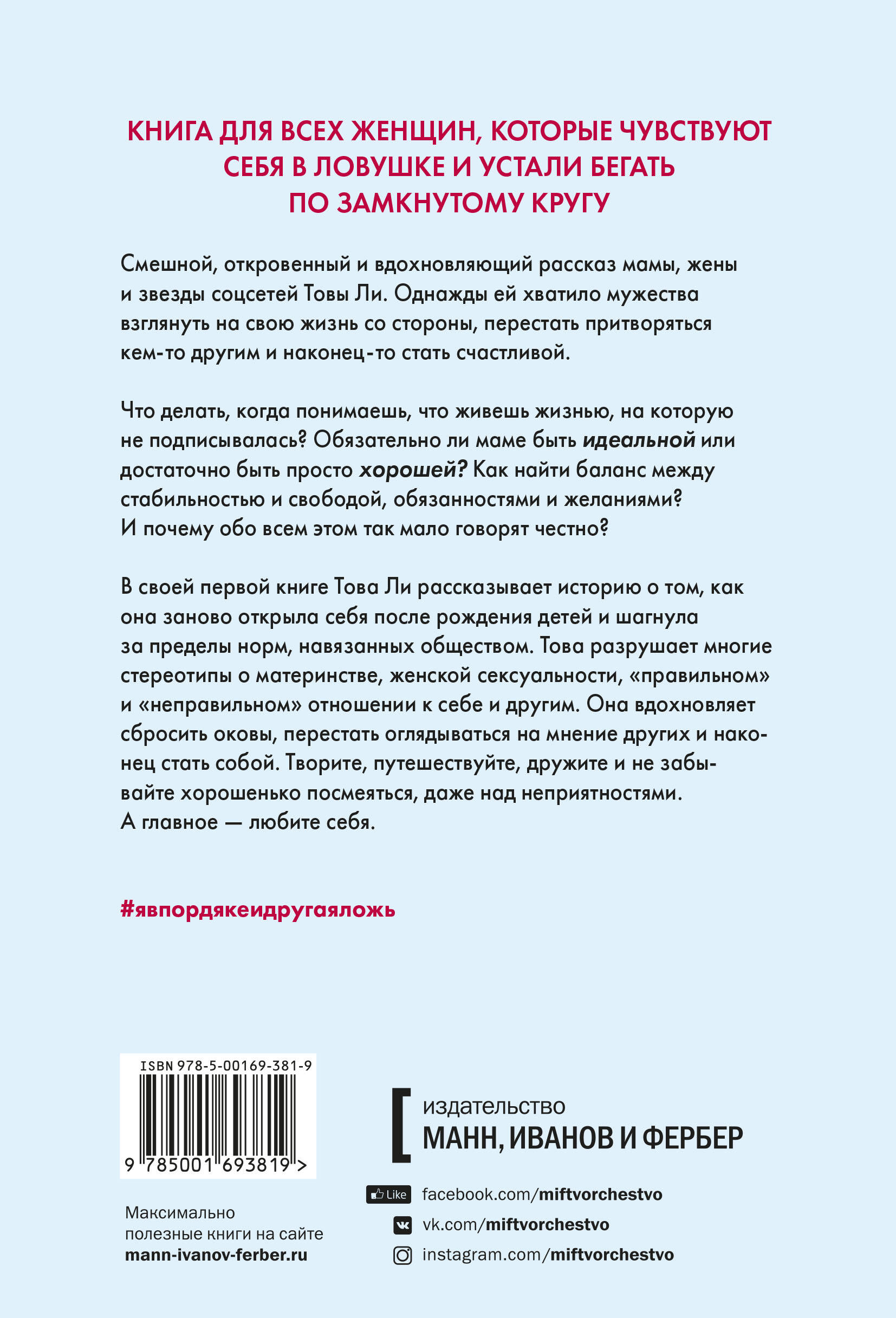 Книга для всех женщин, которые чувствуют себя в ловушке и устали бегать по замкнутому кругу. Смешной, откровенный и вдохновляющий рассказ о кризисе среднего возраста, напоминание о том, что, сколько бы лет вам ни было, у вас еще есть время, чтобы жить ярко и интересно: творить, путешествовать, дружить и любить. Мама, возлюбленная и звезда соцсетей Това Ли пытается решить проблему: что делать, когда понимаешь, что живешь жизнью, на которую не подписывалась? Обязательно ли маме быть Идеальной или достаточно быть Хорошей? Как найти грань между стабильностью и свободой, обязанностями и потребностями? И почему обо всем этом так мало говорят честно? В своей первой книге Това Ли рассказывает историю о том, как она заново открыла себя после рождения детей, шагнув за пределы норм, навязываемых обществом. Това разрушает многие стереотипы о материнстве, о женской сексуальности, о "правильном" и "неправильном" отношении к себе и к другим. Она вдохновляет сбросить оковы, перестать оглядываться на мнение других и стать собой. От автора: Однажды утром я проснулась и поняла, что сейчас взорвусь. У меня словно закипела кровь ― и никакой лед бы тут не помог. Мне все надоело, весь мир. Я устала. Никогда прежде я так не злилась и не задыхалась от грусти и пустоты. А главное, я чувствовала себя невероятно, безнадежно одинокой. А ведь со стороны моя жизнь казалась идеальной. На что было жаловаться? Хорошая работа, верный муж, трое детей, которые иногда, конечно, вредничают, но в целом очень даже славные. А ещё дом, собака и все прочие радости. Не жизнь, а мечта каждой девочки. Разве не так нам внушают с малых лет? Но теперь я была вне себя. Мне надоели одни и те же разговоры о том, что приготовить на ужин, и о внеклассных занятиях детей. Надоел супружеский секс, уже восемь лет происходивший по одному сценарию, и надоело, что порой даже такого секса подолгу не было. Я не хотела превращаться в "мамочку". А как же сражать наповал, сводить с ума? Кто налепил на меня ярлык, который противоречит всей моей сущности? Мне претило одеваться "по-мамски", водить "мамскую" машину, носить "мамскую" стрижку и даже быть записанной у кого-то в телефоне как "мама". Я хотела быть собой. Для кого эта книга: Для тех, кому близки темы материнства, семейных отношений, принятия себя и сексуальности. Для женщин, оказавшихся в кризисе и пытающихся найти гармонию с собой.