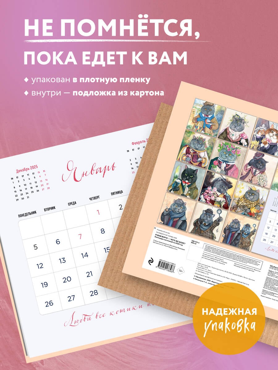 О серии: Наши настенные календари отличаются высоким качеством исполнения! Тщательно подобранные иллюстрации, напечатанные на матовой бумаге высочайшего качества, станут настоящим украшением дома, а в календарной сетке найдется место для ваших планов: большие клетки позволят делать записи и организовать свой год! В календаре также отмечены все государственные праздники. В серии настенных календарей издательства «ЭКСМО» каждый найдет тему по вкусу: великие художники, великолепные подборки с самыми знаменитыми произведениями искусства, легендарные кинематографические саги и игры, главные книжные авторы и бестселлеры, фотографии и иллюстрации любимых животных и многое-многое другое! О календаре: «Я вам мурчу, - чего же боле?» - настенный календарь для тех, кто любит котов и литературу. На каждом месяце - харизматичный кот в образе культового героя и фраза-каламбур: пушистая интерпретация известных литературных цитат. Этот календарь станет стильным украшением интерьера и подарит интеллектуальное удовольствие с ноткой иронии. Для кого: Высокое качество полиграфического исполнения прекрасно дополняют нежные иллюстрации и полезные практики, что непременно будет по достоинству оценено людьми с хорошим вкусом. Технические параметры: - Тип календаря - настенный перекидной. - Год - 2026. - Календарная сетка - с разбивкой по месяцам. - Вид скрепления - скрепка. - Ширина - 30 см. - Высота - 30 см. - Внутренний блок - мелованная бумага 115 г/м2. - Подложка - плотный гофрокартон для поддержания формы. - Индивидуальная упаковка в плотный целлофановый пакет.| Издательство | ООО "Издательство "Эксмо" |