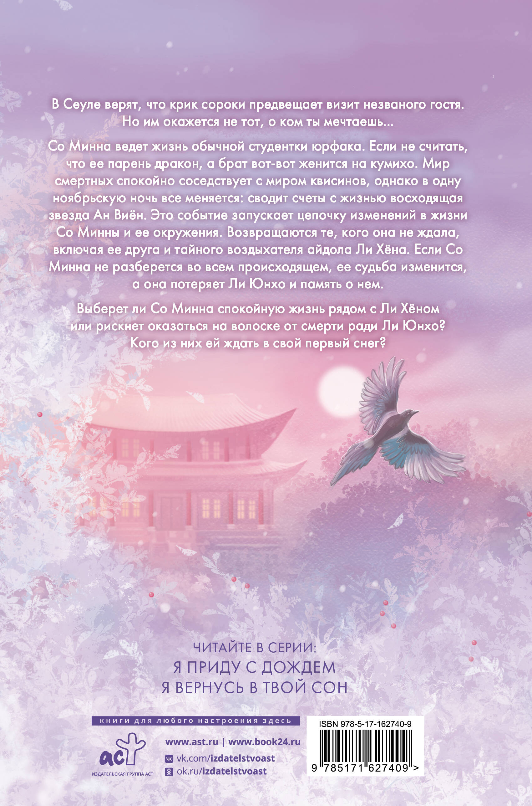 В Сеуле верят, что крик сороки предвещает визит незваного гостя. Но им окажется не тот, о ком ты мечтаешь… Со Минна ведет жизнь обычной студентки юрфака. Если не считать, что ее парень - дракон, а брат вот-вот женится на кумихо. Мир смертных спокойно соседствует с миром квисинов, однако в одну ноябрьскую ночь все меняется: сводит счеты с жизнью восходящая звезда Ан Виён. Это событие запускает цепочку изменений в жизни Со Минны и ее окружения. Возвращаются те, кого она не ждала, включая ее друга и тайного воздыхателя айдола Ли Хёна. Если Со Минна не разберется во всем происходящем, ее судьба изменится, а она потеряет Ли Юнхо и память о нем. Выберет ли Со Минна спокойную жизнь рядом с Ли Хёном или рискнет оказаться на волоске от смерти ради Ли Юнхо? Кого из них ей ждать в свой первый снег?| Издательство | Издательство "АСТ" |