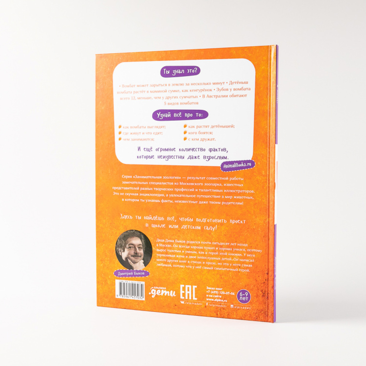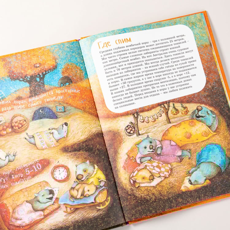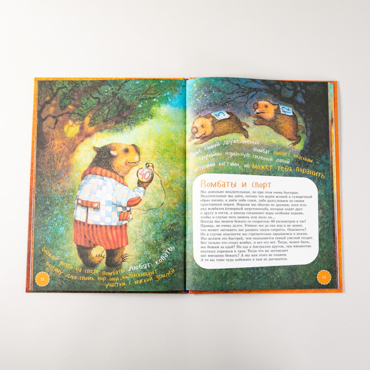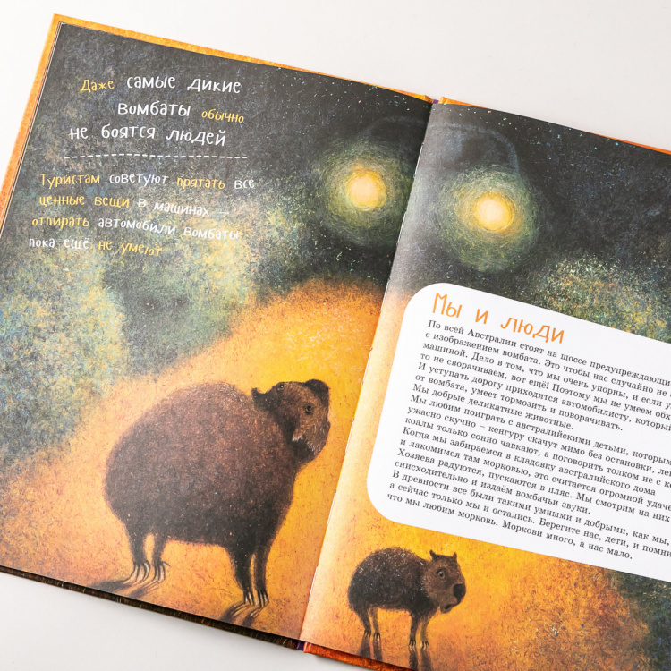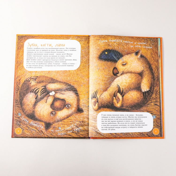 В далёкой Австралии обитает очень необычное животное по имени вомбат. Он немножко похож на медвежонка и совершенно не боится людей. Наша книжка поможет тебе познакомиться с этим удивительным зверем. Ты узнаешь, какие он строит себе норы, чем отличается сумка мамы-вомбата от сумки мамы-кенгуру, что общего у верблюда и вомбата... А ещё... Но, нет, не будем рассказывать. Лучше скорее открывай книжку!