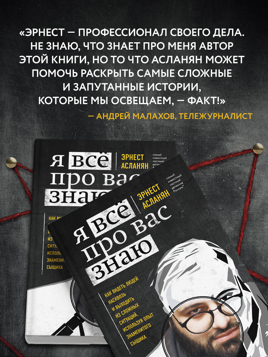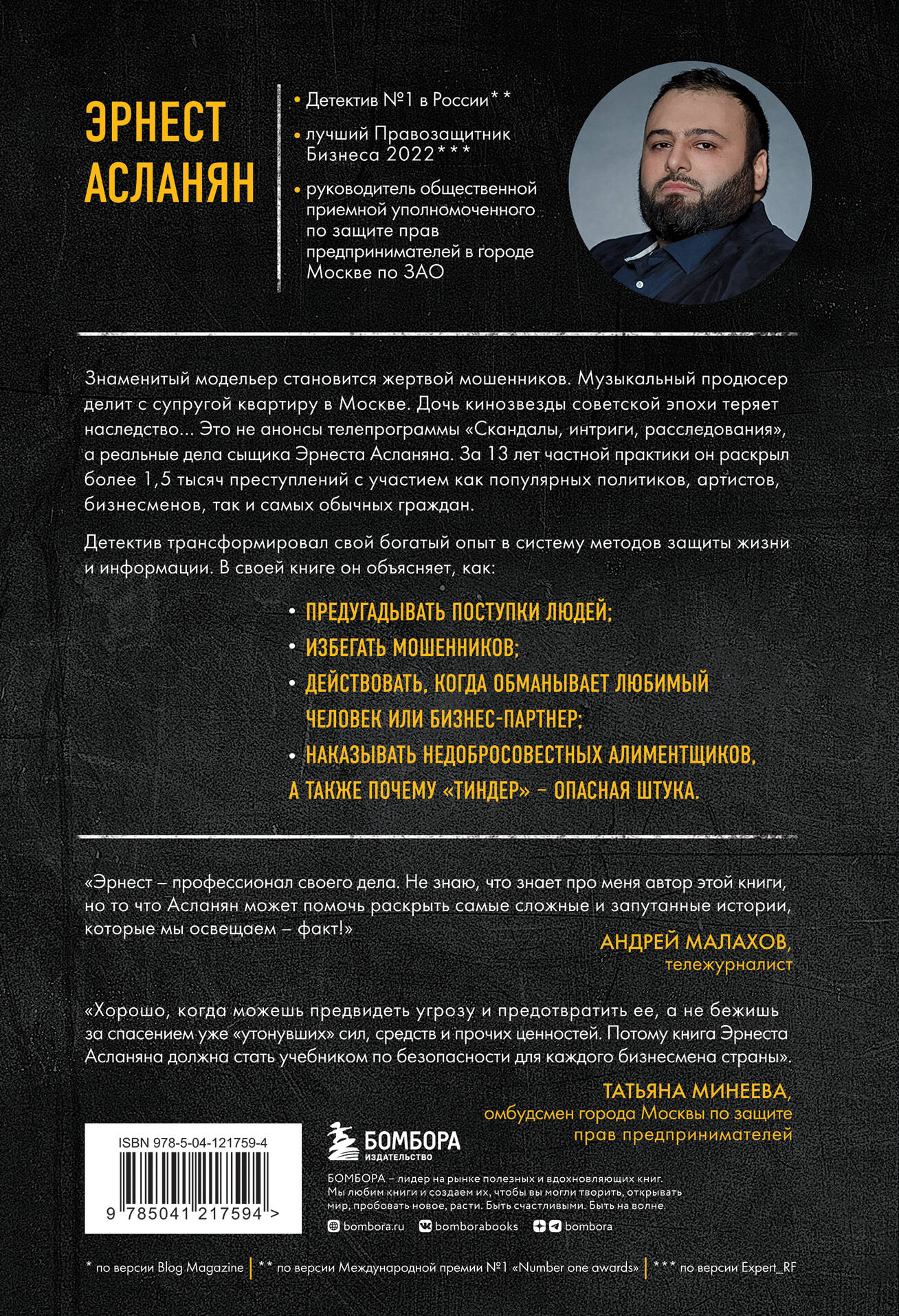 Знаменитый модельер становится жертвой мошенников. Музыкальный продюсер делит с супругой квартиру в Москве. Дочь кинозвезды Советской эпохи теряет наследство… Это не анонсы телепрограммы «Скандалы, интриги, расследования», а реальные дела сыщика Эрнеста Асланяна. За 13 лет частной практики он раскрыл более 1,5 тысяч преступлений с участием как популярных политиков, артистов, бизнесменов, так и самых обычных граждан. Детектив трансформировал свой богатый опыт в систему методов защиты жизни и информации. В своей книге он объясняет, как: - предугадывать поступки людей; - избегать мошенников; - действовать, когда обманывает любимый человек или бизнес-партнер; - наказывать недобросовестных алиментщиков; - а также, почему «Тиндер» - опасная штука. «Эрнест - профессионал своего дела. Не знаю, что знает про меня автор этой книги, но то что Асланян может помочь раскрыть самые сложные и запутанные истории, которые мы освещаем, - факт!» - Андрей Малахов, тележурналист «Хорошо, когда можешь предвидеть угрозу и предотвратить её, а не бежишь за спасением уже "утонувших" сил, средств и прочих ценностей. Потому книга Эрнеста Асланяна должна стать учебником по безопасности для каждого бизнесмена страны». - Татьяна Минеева, омбудсмен города Москвы по защите прав предпринимателей| Издательство | ООО "Издательство "Эксмо" |