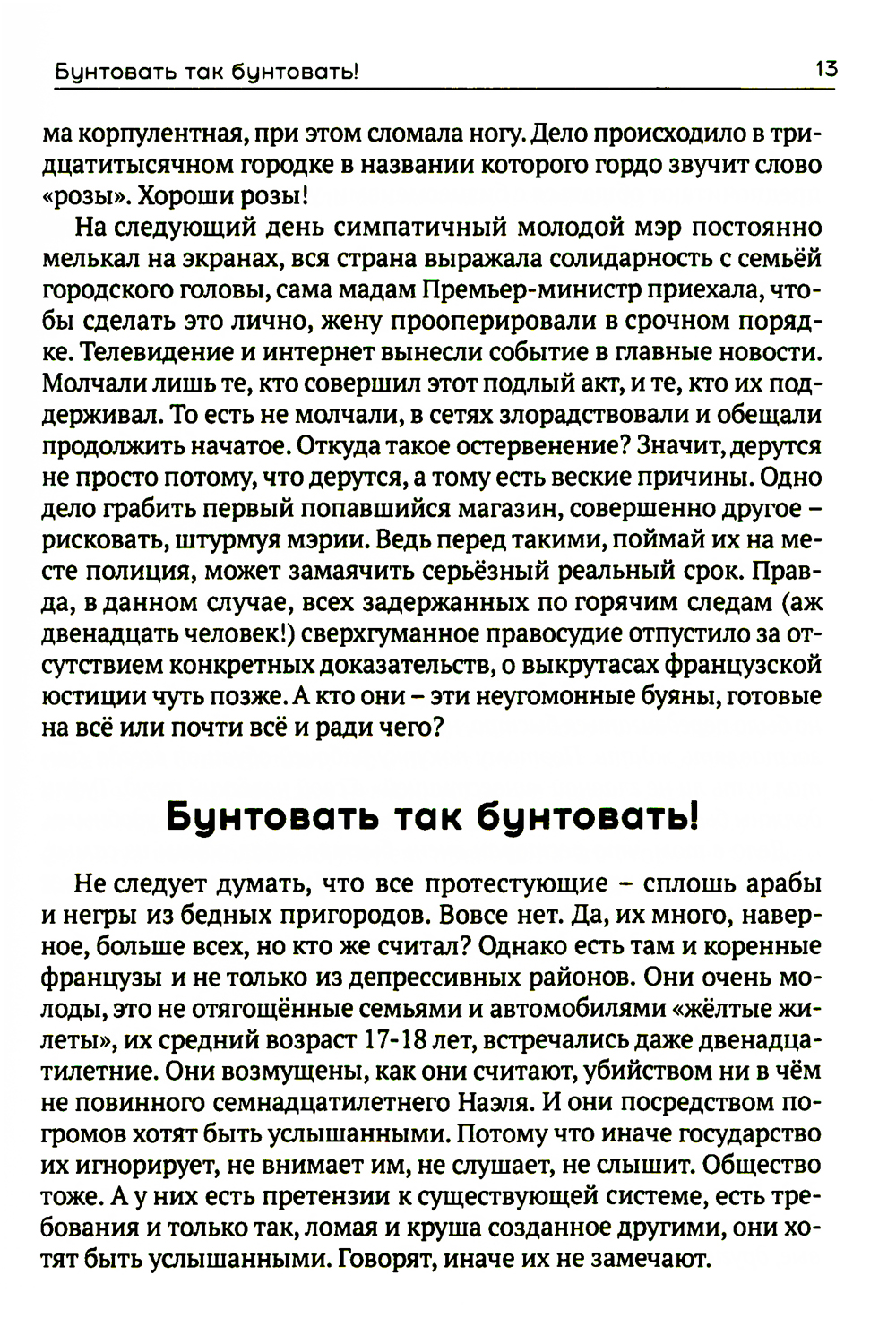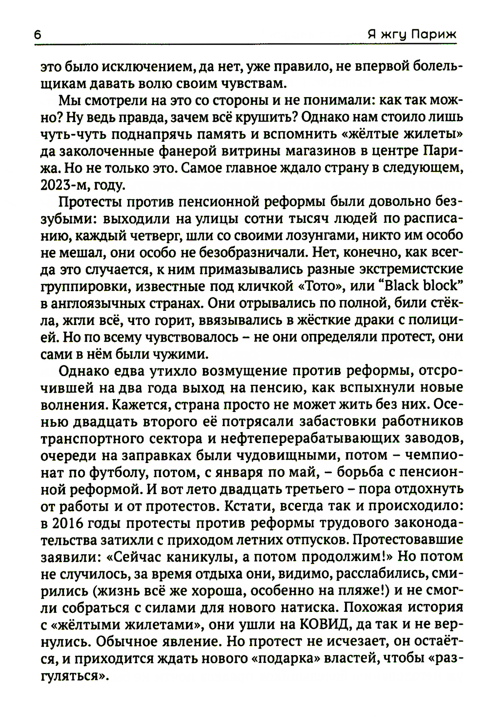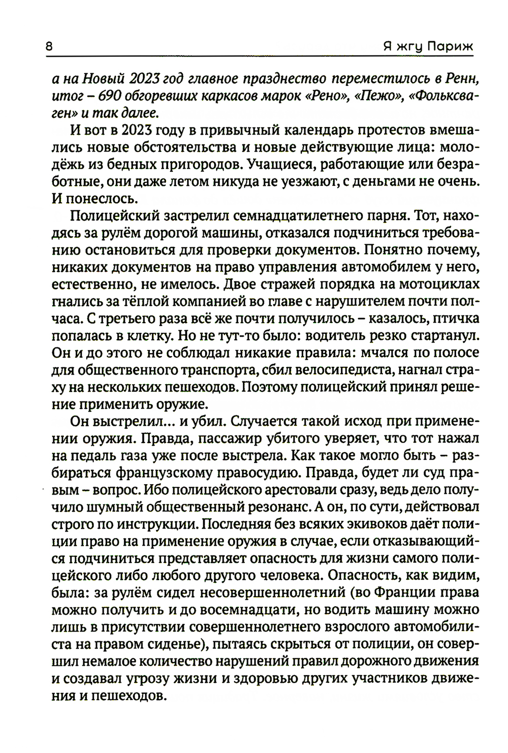 Летом 2023 года во Франции произошло событие, которое привело к активации давно назревающего протеста со стороны части общества. Властям пришлось прибегнуть к жёстким мерам, мобилизовать все силы полиции, чтобы обуздать бунтарей. Почему же так случилось? Что заставило людей выйти на улицы и громить всё, что ранее отождествлялось с государством и порядком? В книге «Я жгу Париж» автор описывает различные аспекты из жизни Франции, которые так или иначе привели к глобальному кризису в стране. В простом повествовании выявляются причинно-следственные связи между сложившейся критической ситуацией и допущенными в прошлом ошибками. Эта книга будет полезна всем, кто хочет разобраться в мотивах протестных действий в обществе на примере отдельно взятой страны, а также понять, куда мы, как человечество, движемся, и что нас ждёт в будущем.| Издательство | Концептуал |