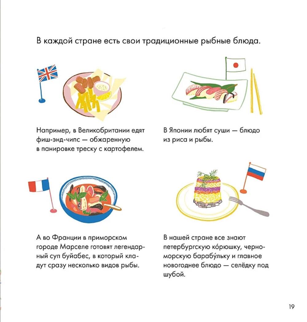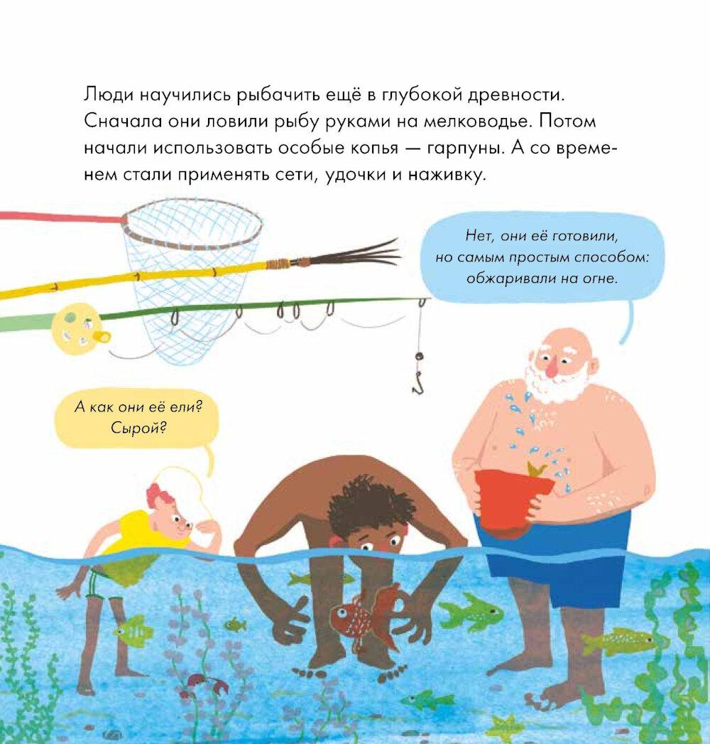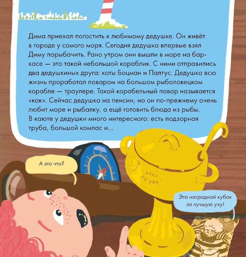 Серия «Я знаю, что я ем» знакомит маленьких читателей с различными продуктами и блюдами и рассказывает, какие они бывают, как их производят и зачем они нужны в нашем рационе. Ребенок получит ответы на свои вопросы о том, почему какую-то еду нужно есть обязательно, а чем-то лучше не злоупотреблять, и тем самым начнет формировать правильные пищевые привычки с раннего возраста. А еще в книге есть несложные рецепты очень вкусных блюд, которые можно приготовить вместе с родителями! Дима приехал в гости к любимому дедушке, который много лет проработал корабельным поваром - коком. Они решили отправиться на настоящую морскую рыбалку на дедушкином баркасе. В этом небольшом путешествии Дима не только узнает о том, как ловят рыбу и как устроены рыболовецкие суда, но и разберётся, какая бывает рыба, чем же она так полезна для организма и, конечно, какие интересные блюда из неё можно приготовить. А после рыбалки попробует сварить уху по вкуснейшему дедушкиному рецепту.