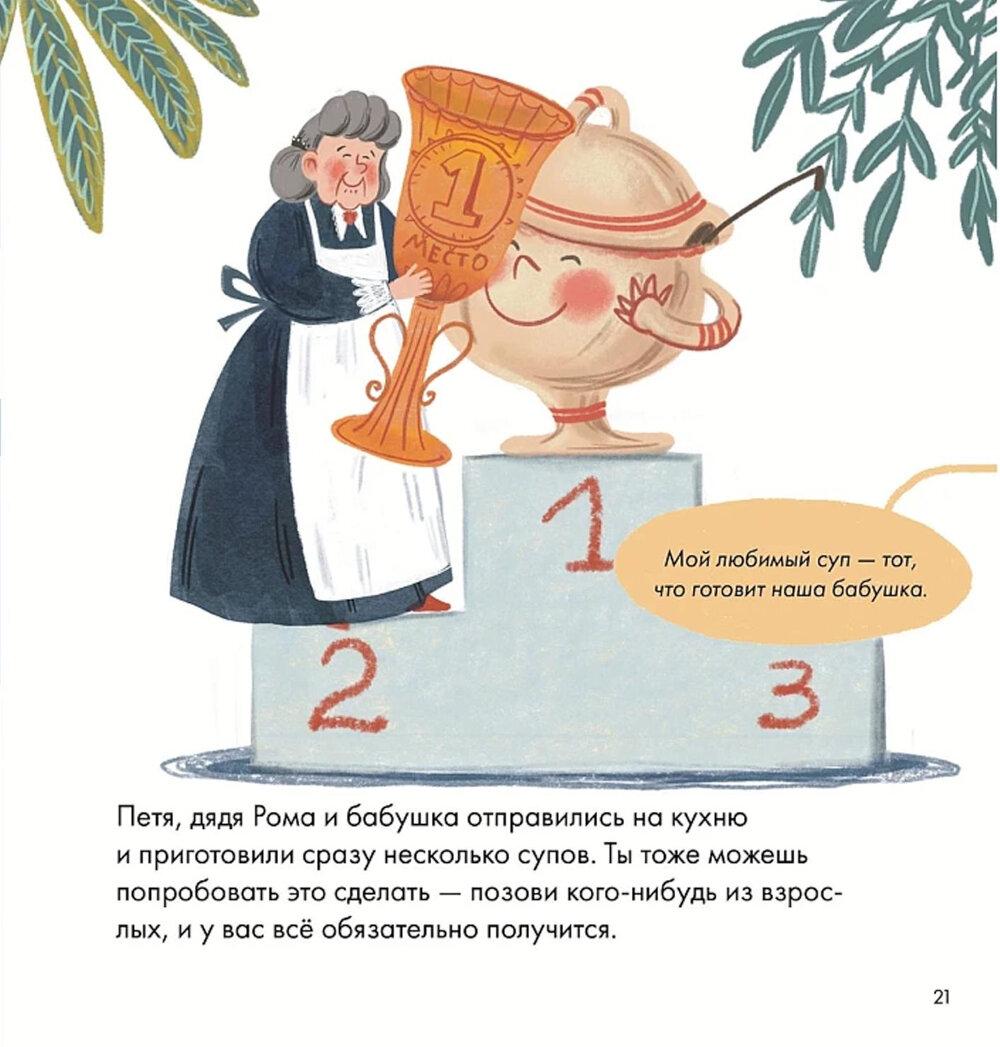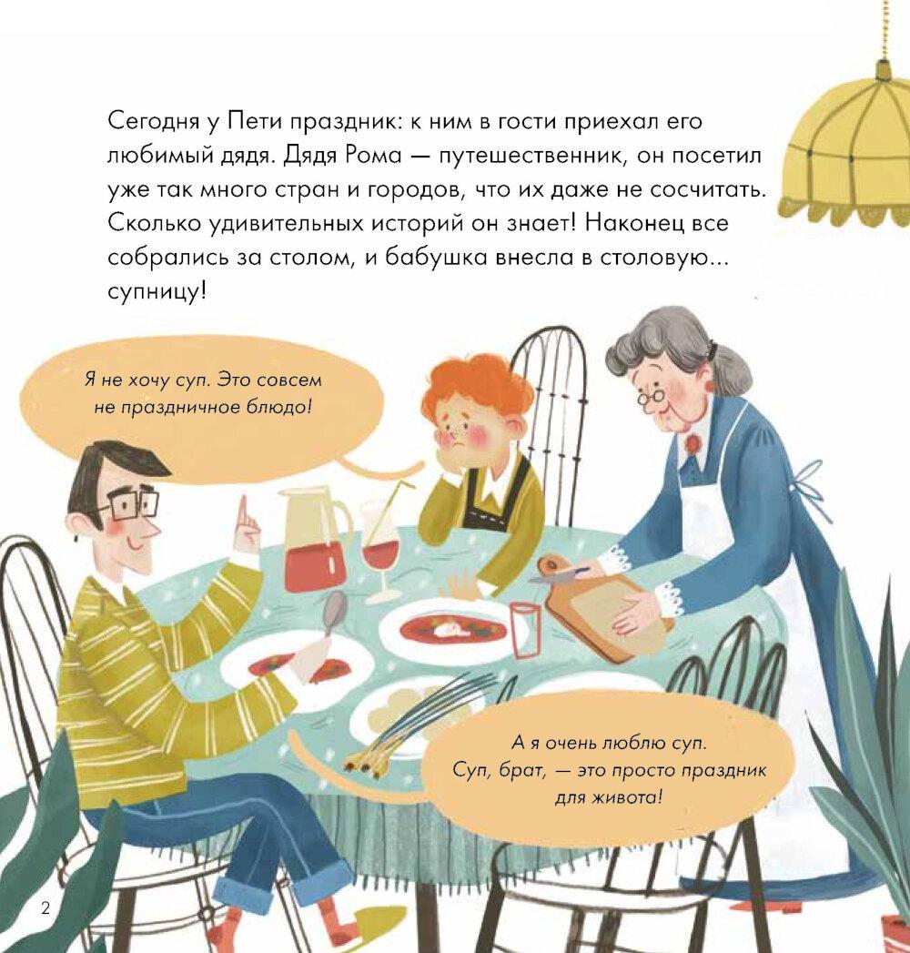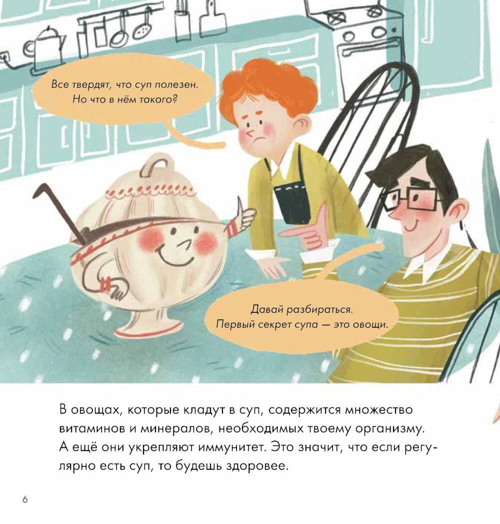 Серия «Я знаю, что я ем» знакомит маленьких читателей с различными продуктами и блюдами и рассказывает, какие они бывают, как их производят и зачем они нужны в нашем рационе. Ребенок получит ответы на свои вопросы о том, почему какую-то еду нужно есть обязательно, а чем-то лучше не злоупотреблять, и тем самым начнет формировать правильные пищевые привычки с раннего возраста. А еще в книге есть несложные рецепты очень вкусных блюд, которые можно приготовить вместе с родителями! Сегодня у Пети праздник: в гости к бабушке приехал его любимый дядя-путешественник. Но как же Петя удивился, когда на праздничный стол бабушка поставила... супницу! Разве же это блюдо для особого повода? Вот только оказалось, что Петин дядя - настоящий знаток и любитель супов. Путешествуя, он обязательно везде пробует местные супы. Дядя расскажет Пете о том, какие бывают супы, что они могут поведать о культуре и быте каждого народа, почему считаются такими полезными и, конечно, зачем же их обязательно нужно есть.| Издательство | Альпина Паблишер |