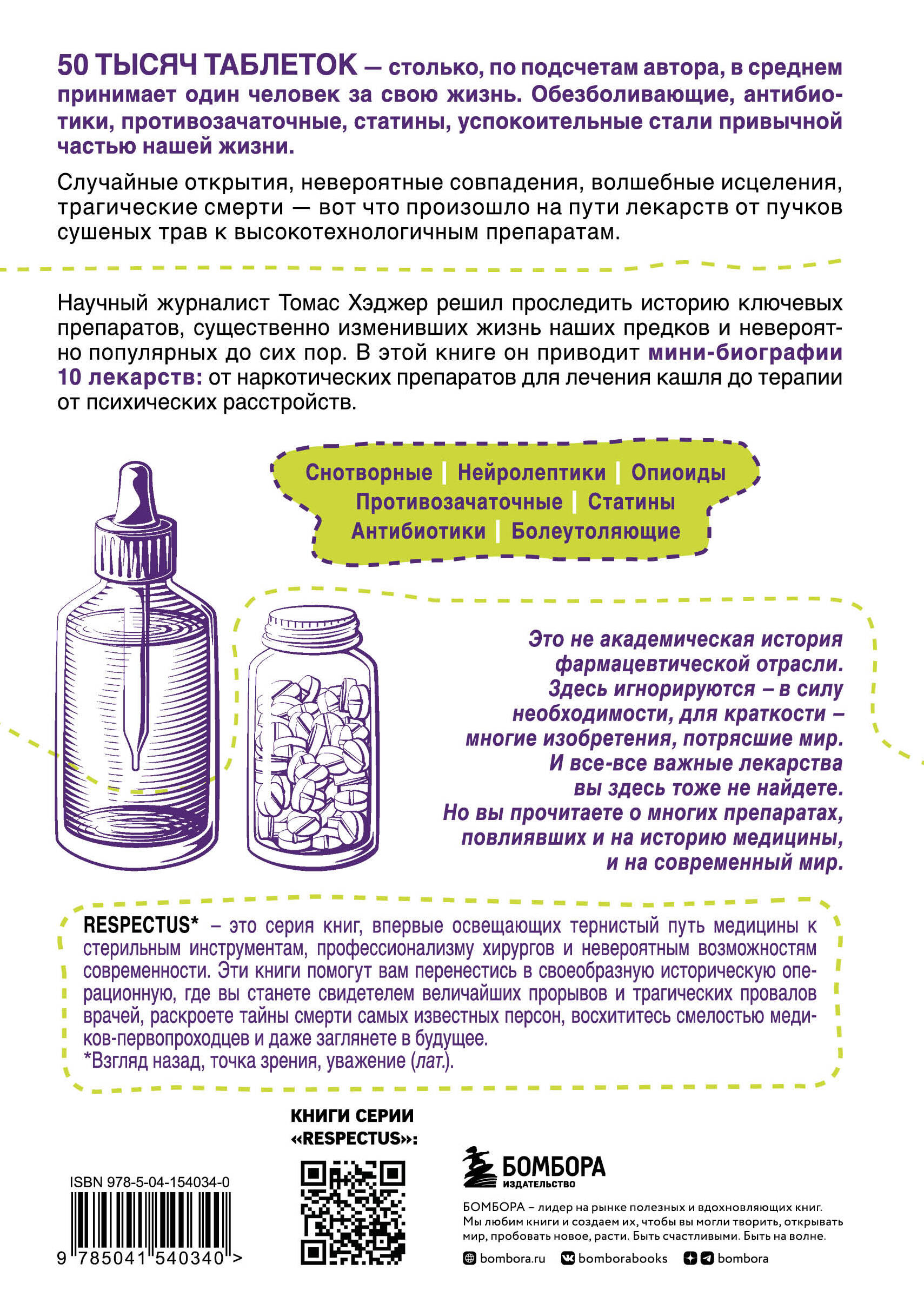 От пучков сушеных трав и алкогольных эликсиров к высокотехнологичным препаратам и многомиллионному бизнесу - такой путь проделали лекарства, которые мы принимаем каждый день. Научный журналист Томас Хэджер решил разобраться, какие гениальные открытия и случайные находки подарили нам обезболивающие, противозачаточные и антибиотики. Эта книга - биография десяти важнейших лекарств, изменивших медицину. Среди них вы не найдете «величайшие хиты», например, пенициллин или аспирин, ведь о них написано уже многое. Вместо этого автор познакомит вас с удивительными историями менее известных, но не менее значимых лекарств и покажет их двойственную природу. Вы побываете в кабинете средневекового алхимика и химической лаборатории, узнаете, что пытались лечить героином, а еще заглянете в будущее лекарств и осознаете, как случайные совпадения могут изменить жизни целых поколений.| Издательство | ООО "Издательство "Эксмо" |