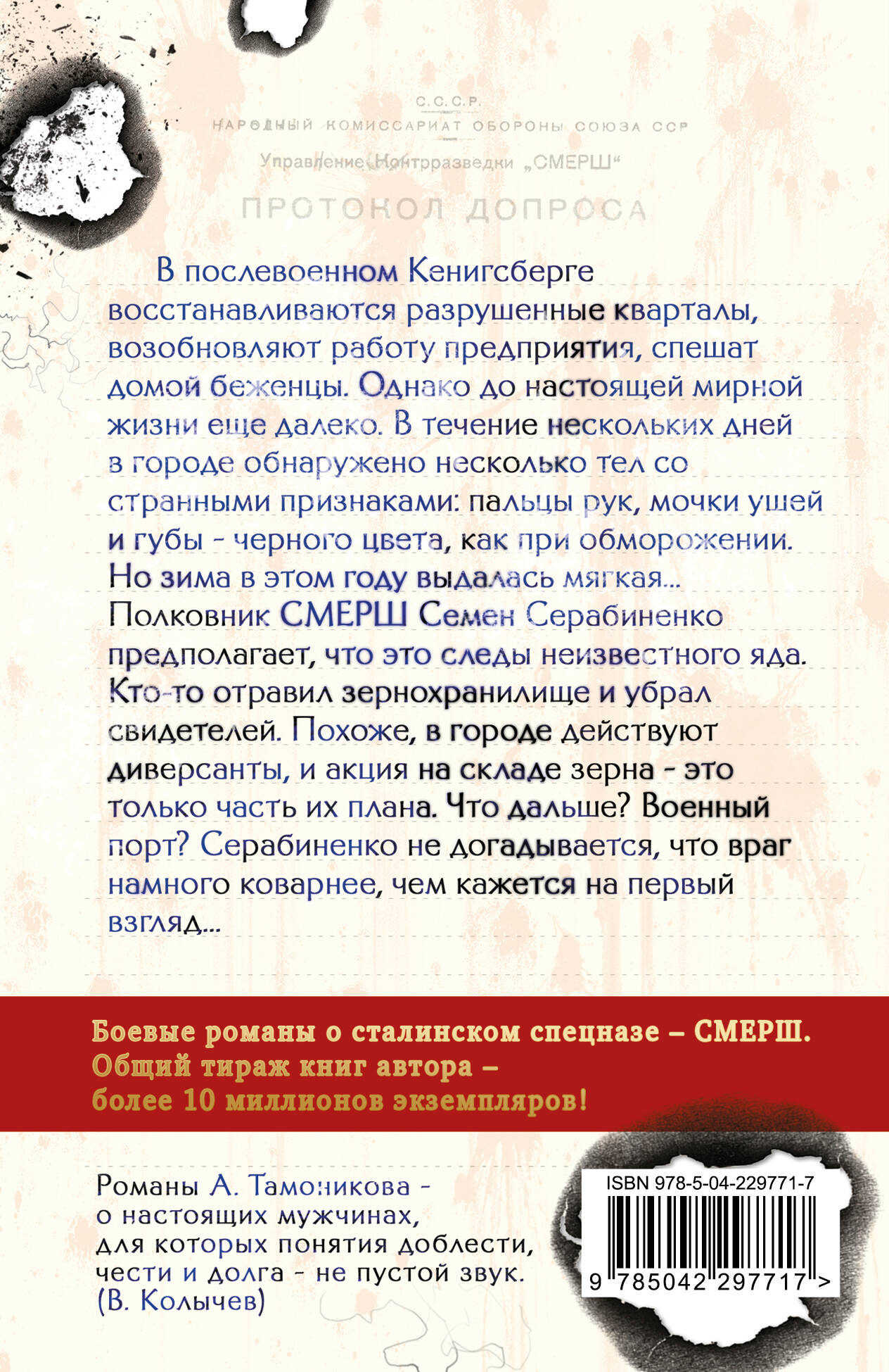Самые интересные романы о сталинском спецназе - СМЕРШе. В послевоенном Кенигсберге восстанавливаются разрушенные кварталы, возобновляют работу предприятия, спешат домой беженцы. Однако до настоящей мирной жизни еще далеко. В течение нескольких дней в городе обнаружено несколько тел со странными признаками: пальцы рук, мочки ушей и губы - черного цвета, как при обморожении. Но зима в этом году выдалась мягкая... Полковник СМЕРШа Семен Серабиненко предполагает, что это следы неизвестного яда. Кто-то отравил зернохранилище и убрал свидетелей. Похоже, в городе действуют диверсанты, и акция на складе зерна - это только часть их плана. Что дальше? Военный порт? Серабиненко не догадывается, что враг намного коварнее, чем кажется на первый взгляд… «Смерть шпионам!» (СМЕРШ) - это короткое и беспощадное название носило особое подразделение НКВД, подчинявшееся И. Сталину. Созданное в годы войны, оно состояло из проверенных в бою, честных и бесстрашных офицеров Красной Армии. СМЕРШа боялись все - и фашистские лазутчики, готовящие диверсии в наших боевых порядках, и гитлеровские приспешники, действующие в глубоком советском тылу. Враг знал: если на его след напали бойцы сталинского спецназа, справедливого и скорого суда не избежать. Романы серии «СМЕРШ - спецназ Сталина» - это каждый раз увлекательный динамичный сюжет и новые исторические знания, это экшен, написанный простым и понятным языком. Общий тираж книг А. Тамоникова - более 10 миллионов экземпляров! ------------------------------ «Романы А. Тамоникова - о настоящих мужчинах, для которых понятия доблести, чести и долга - не пустой звук». - В. Колычев| Издательство | ООО "Издательство "Эксмо" |
