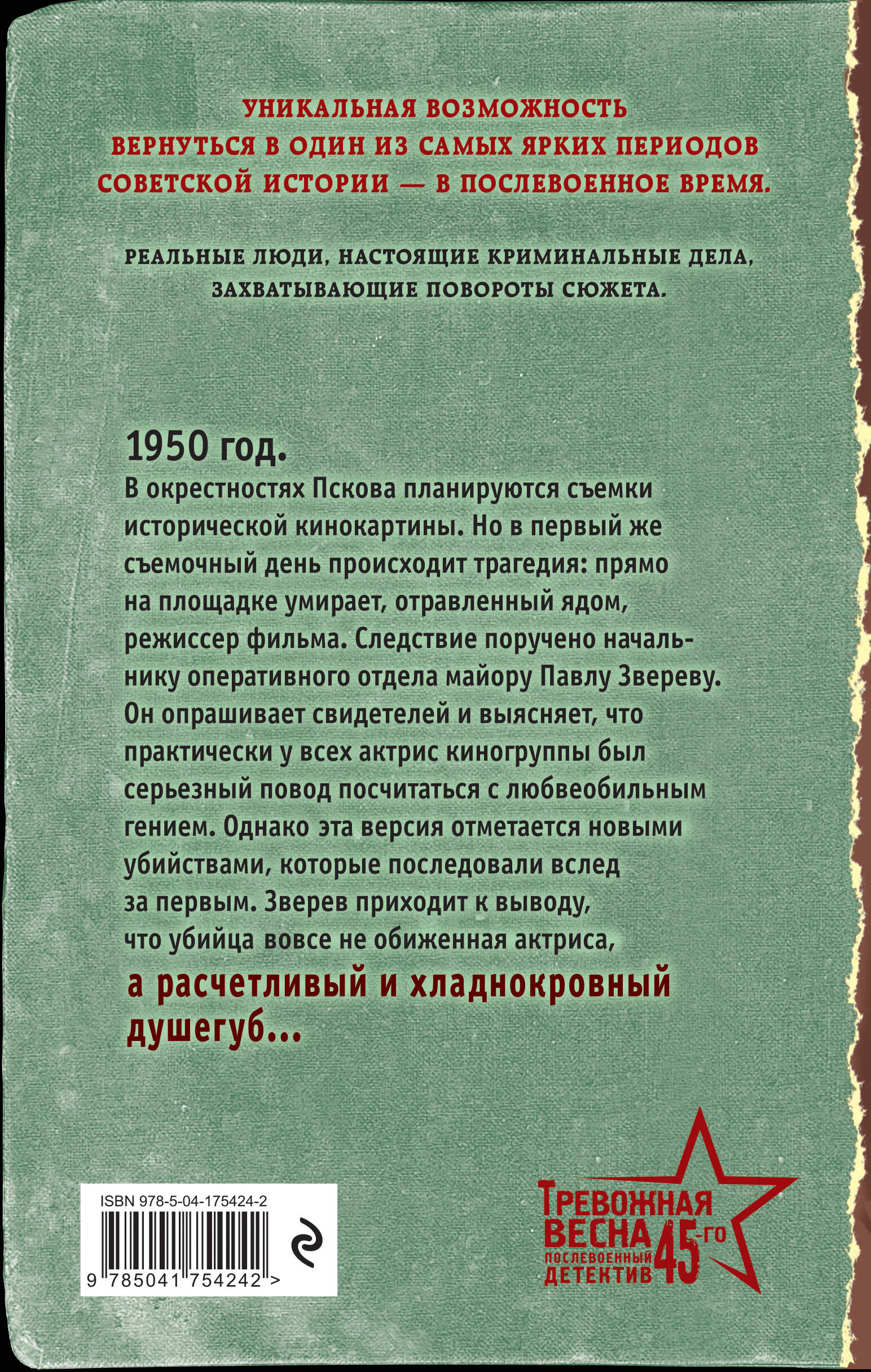 1950 год. В окрестностях Пскова планируются съемки исторической кинокартины. Но в первый же съемочный день происходит трагедия: прямо на площадке умирает, отравленный ядом, режиссер фильма. Следствие поручено начальнику оперативного отдела майору Павлу Звереву. Он опрашивает свидетелей и выясняет, что практически у всех актрис киногруппы был серьезный повод посчитаться с любвеобильным гением. Однако, эта версия отметается новыми убийствами, которые последовали вслед за первым. Зверев приходит к выводу, что убийца - вовсе не обиженная актриса, а расчетливый и хладнокровный душегуб… Уникальная возможность вернуться в один из самых ярких периодов советской истории - в послевоенное время. Реальные люди, настоящие криминальные дела, захватывающие повороты сюжета. Персонажи, похожие на культовые образы фильма «Место встречи изменить нельзя». Дух времени, трепетно хранящийся во многих семьях. Необычно и реалистично показанная «кухня» повседневной работы советской милиции.| Издательство | ООО "Издательство "Эксмо" |