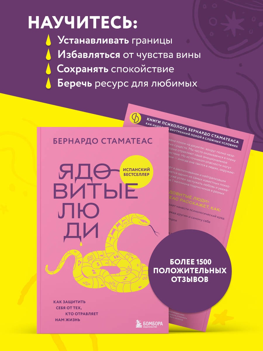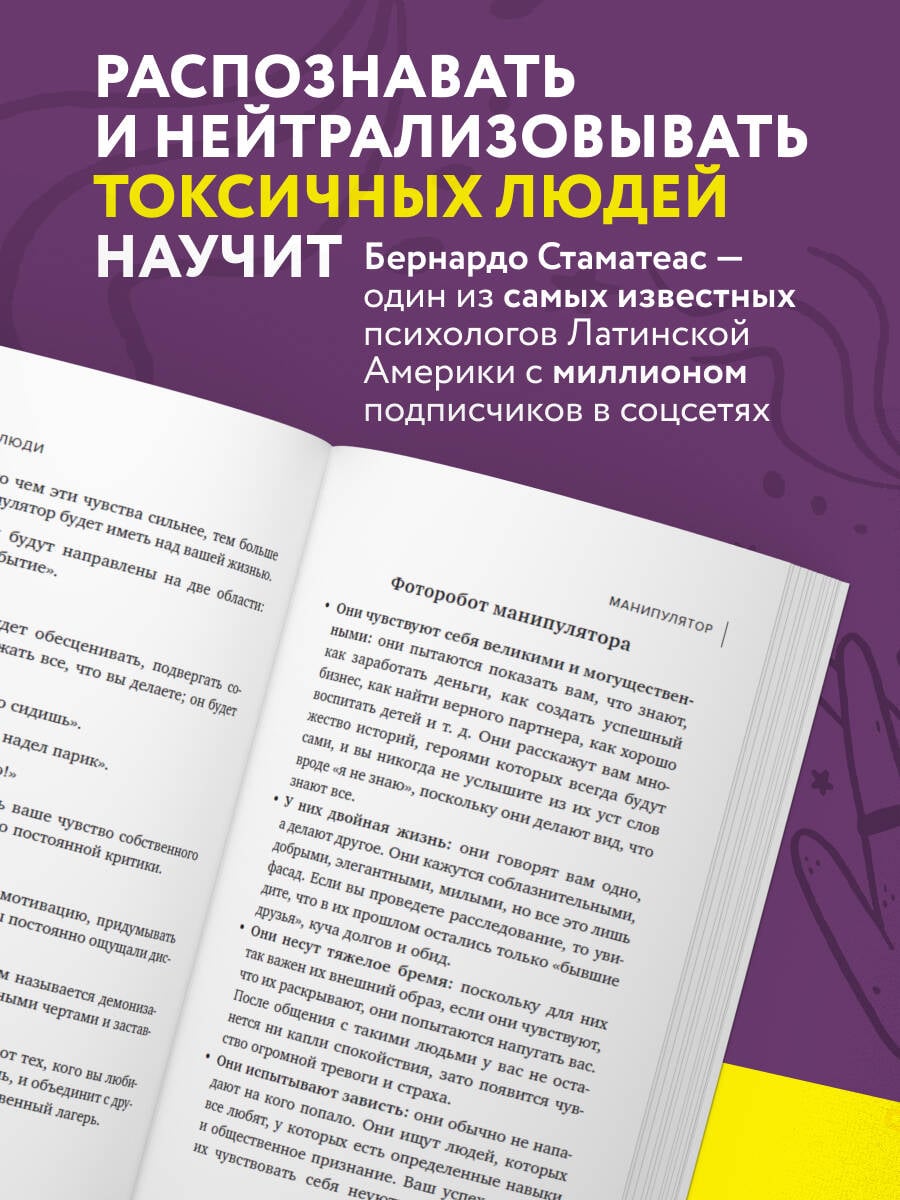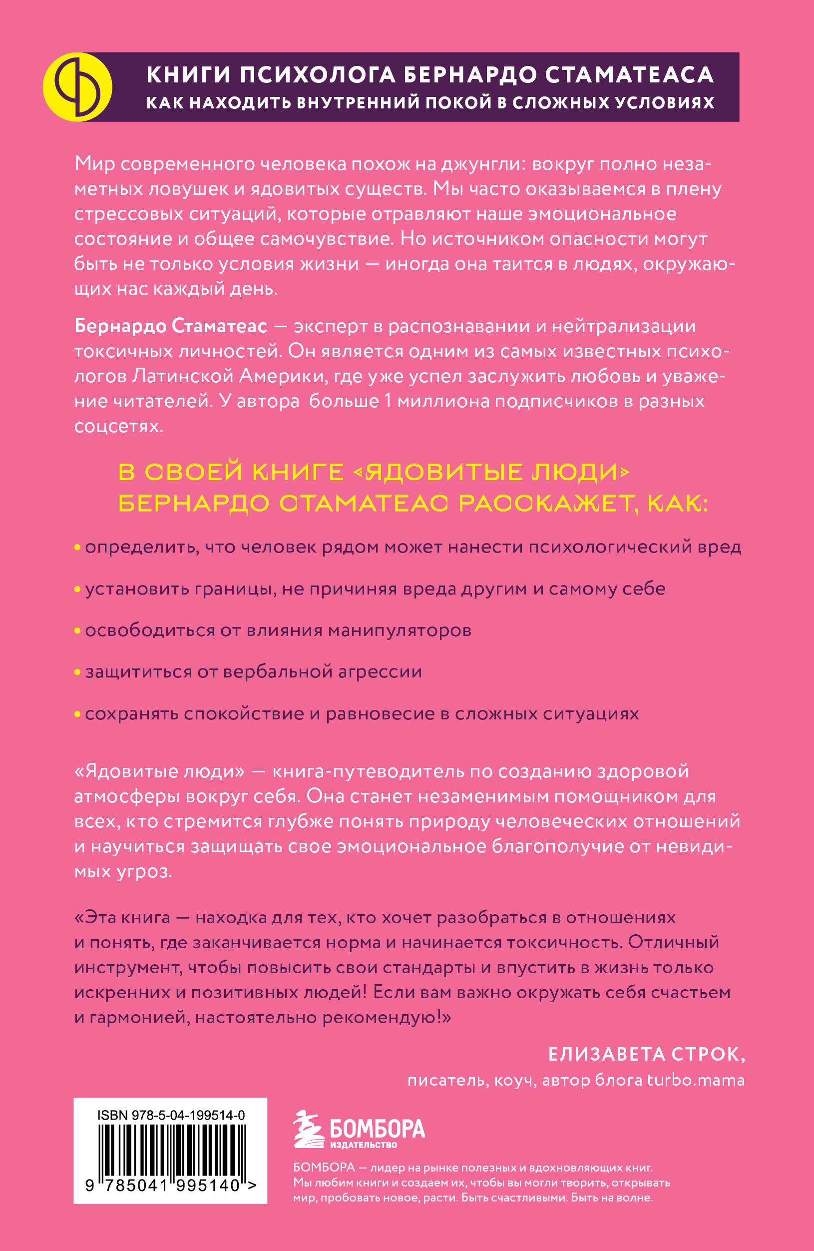 Мир современного человека похож на джунгли: вокруг полно незаметных ловушек и ядовитых существ. Мы часто оказываемся в плену стрессовых ситуаций, которые отравляют наше эмоциональное состояние и общее самочувствие. Но источником опасности могут быть не только условия жизни - иногда она таится в людях, окружающих нас каждый день. Бернардо Стаматеас - эксперт в распознавании и нейтрализации токсичных личностей. Он является одним из самых известных психологов Латинской Америки, где уже успел заслужить любовь и уважение читателей. У автора больше 1 миллиона подписчиков в разных соцсетях. В своей книге «Ядовитые люди» Бернардо Стаматеас расскажет, как: • определить, что человек рядом может нанести психологический вред; • установить границы, не причиняя вреда другим и самому себе; • освободиться от влияния манипуляторов; • защититься от вербальной агрессии; • сохранять спокойствие и равновесие в сложных ситуациях. «Ядовитые люди» - книга-путеводитель по созданию здоровой атмосферы вокруг себя. Она станет незаменимым помощником для всех, кто стремится глубже понять природу человеческих отношений и научиться защищать свое эмоциональное благополучие от невидимых угроз. «Эта книга - находка для тех, кто хочет разобраться в отношениях и понять, где заканчивается норма и начинается токсичность. Отличный инструмент, чтобы повысить свои стандарты и впустить в жизнь только искренних и позитивных людей! Если вам важно окружать себя счастьем и гармонией, настоятельно рекомендую!» - Елизавета Строк, писатель, коуч, автор блога turbo.mama| Издательство | ООО "Издательство "Эксмо" |