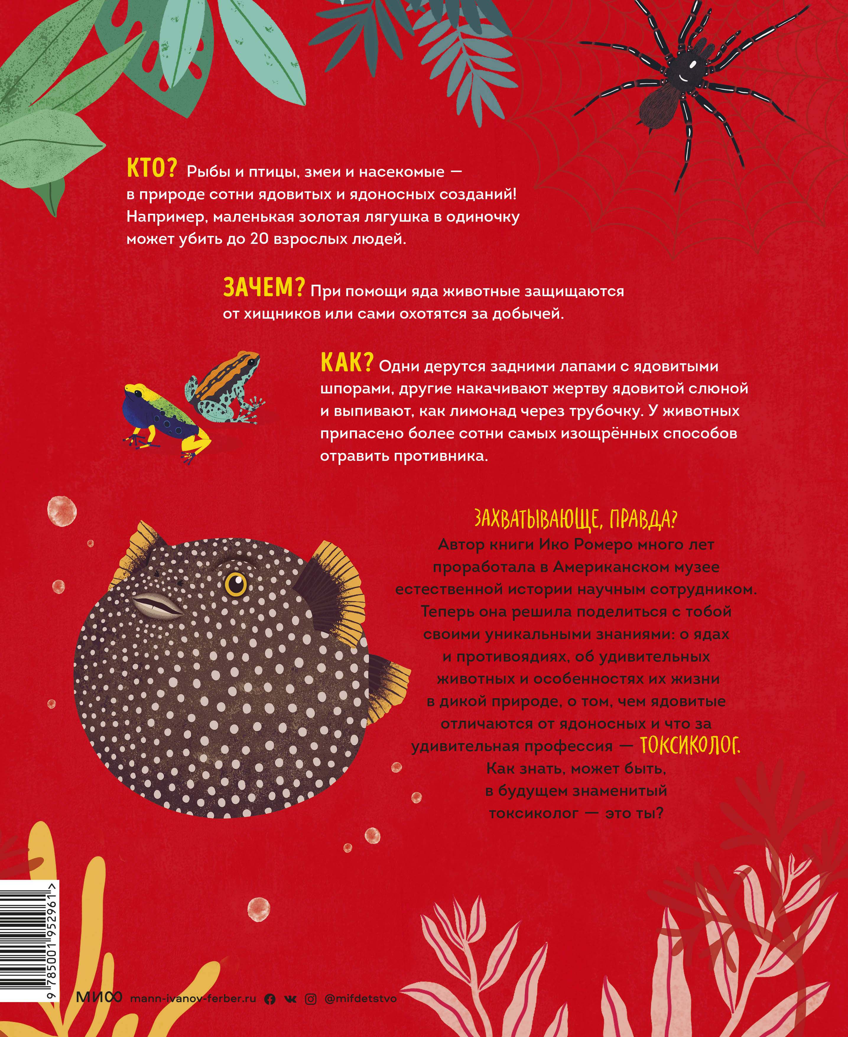 Сотни видов животных и растений используют яд для нападения и самозащиты. В этой книге рассказано, что такое яд, как он работает и о ядовитых животных: лягушках, птицах, млекопитающих. Для кого эта книга: Для детей от 6 лет.| Издательство | Манн, Иванов и Фербер |