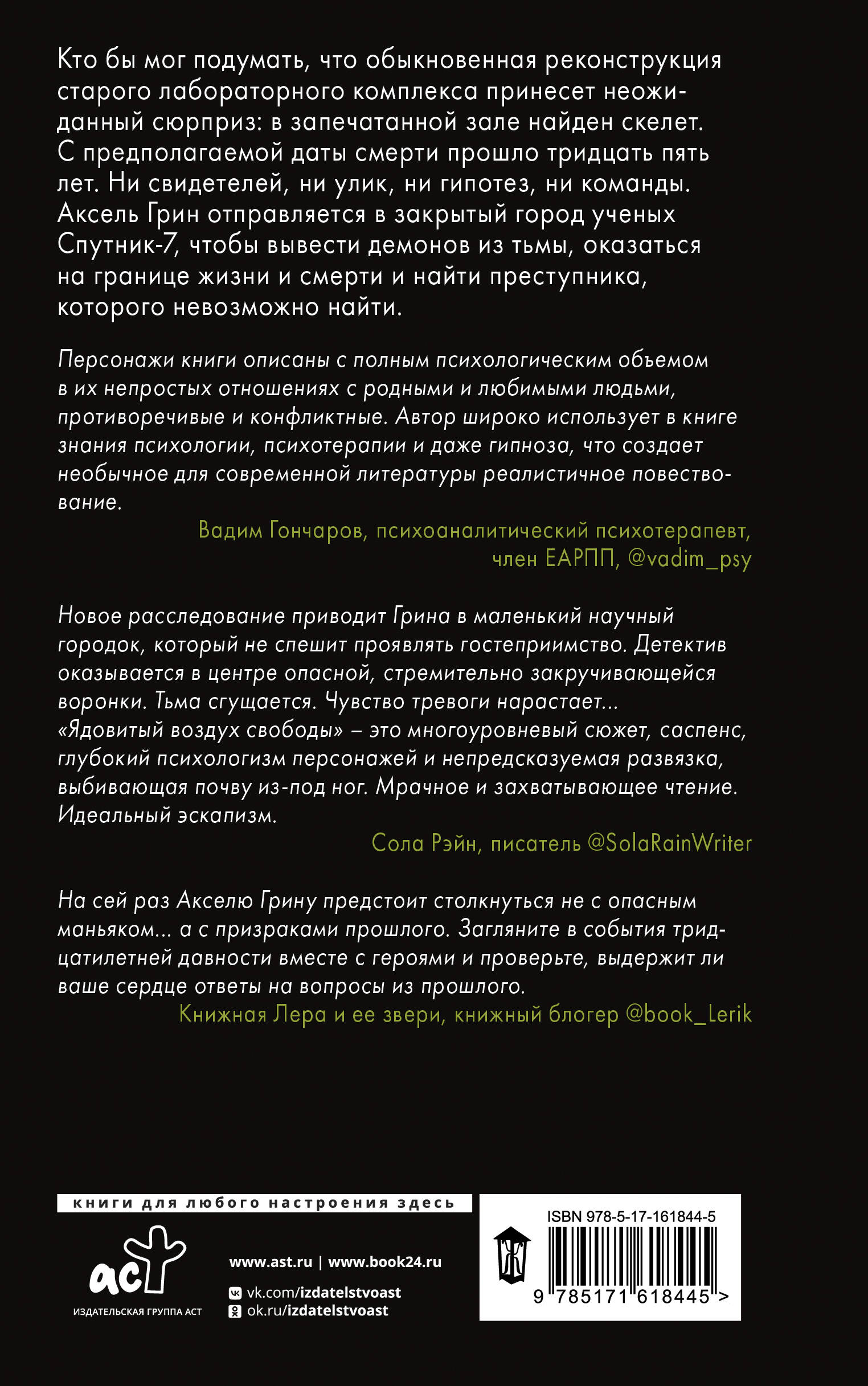 Кто бы мог подумать, что обыкновенная реконструкция старого лабораторного комплекса принесет неожиданный сюрприз: в запечатанной зале найден скелет. С предполагаемой даты смерти прошло тридцать пять лет. Ни свидетелей, ни улик, ни гипотез, ни команды. Аксель Грин отправляется в закрытый город ученых Спутник-7, чтобы вывести демонов из тьмы, оказаться на границе жизни и смерти и найти преступника, которого невозможно найти.| Издательство | Издательство "АСТ" |