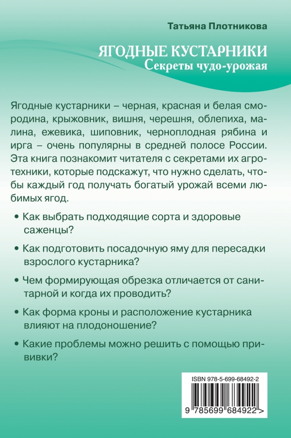 Книга рассказывает о популярных в средней полосе России ягодных кустарниках (красной и черной смородине, крыжовнике, малине, ирге, жимолости, облепихе и др.). Правильные посадка и уход за ними (обрезка, подкормка, полив и др.) обеспечат вам хороший урожай, вкусное лакомство и запас витаминов на зиму.