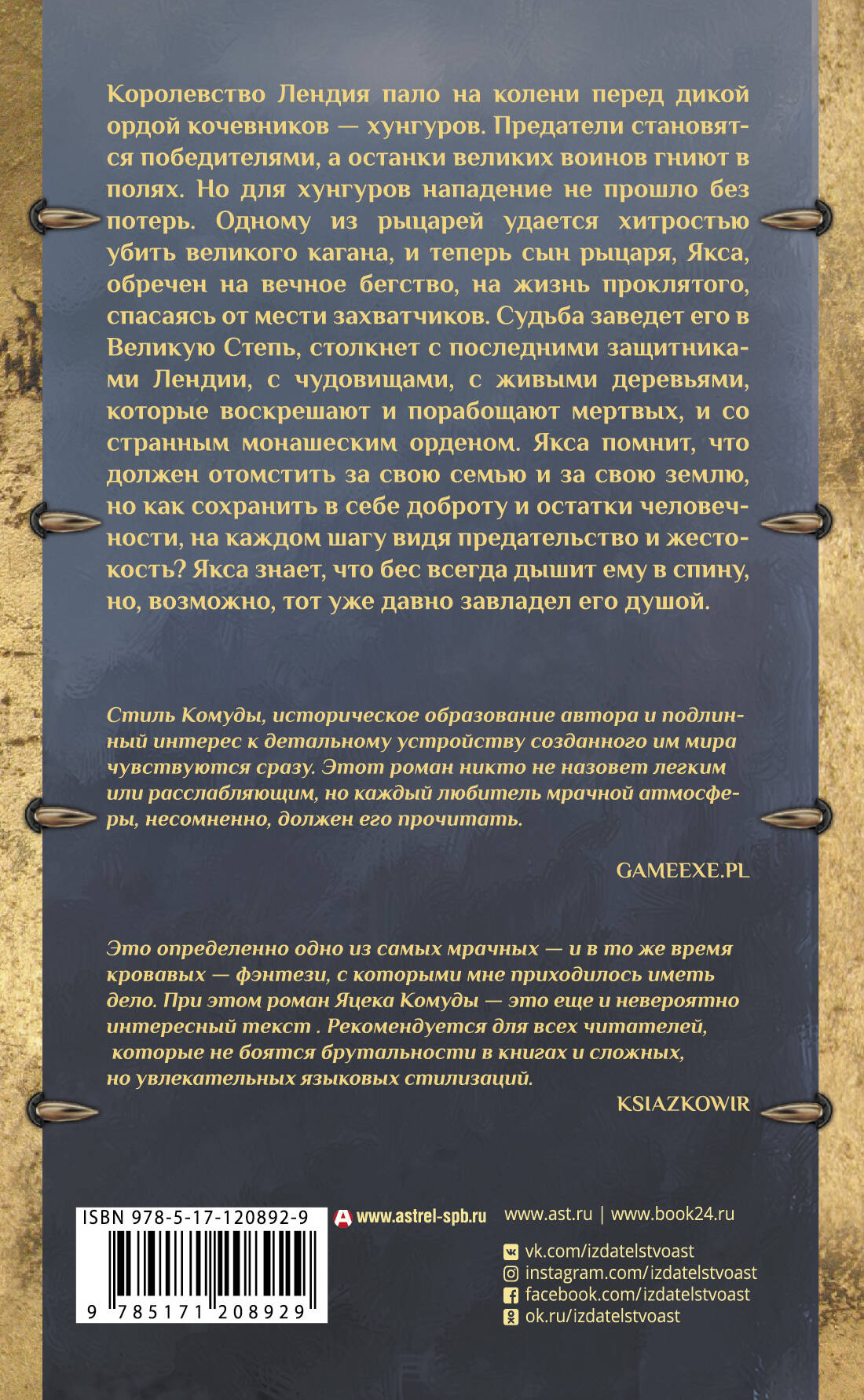 Королевство Лендия пало на колени перед дикой ордой кочевников - хунгуров. Предатели становятся победителями, а останки великих воинов гниют в полях. Но для хунгуров нападение не прошло без потерь. Одному из рыцарей удается хитростью убить великого кагана, и теперь сын рыцаря, Якса, обречен на вечное бегство, на жизнь проклятого, спасаясь от мести захватчиков. Судьба заведет его в Великую Степь, столкнет с последними защитниками Лендии, с чудовищами, с живыми деревьями, которые воскрешают и порабощают мертвых, и со странным монашеским орденом. Якса помнит, что должен отомстить за свою семью и за свою землю, но как сохранить в себе доброту и остатки человечности, на каждом шагу видя предательство и жестокость? Якса знает, что бес всегда дышит ему в спину, но, возможно, тот уже давно завладел его душой.| Издательство | АСТ |