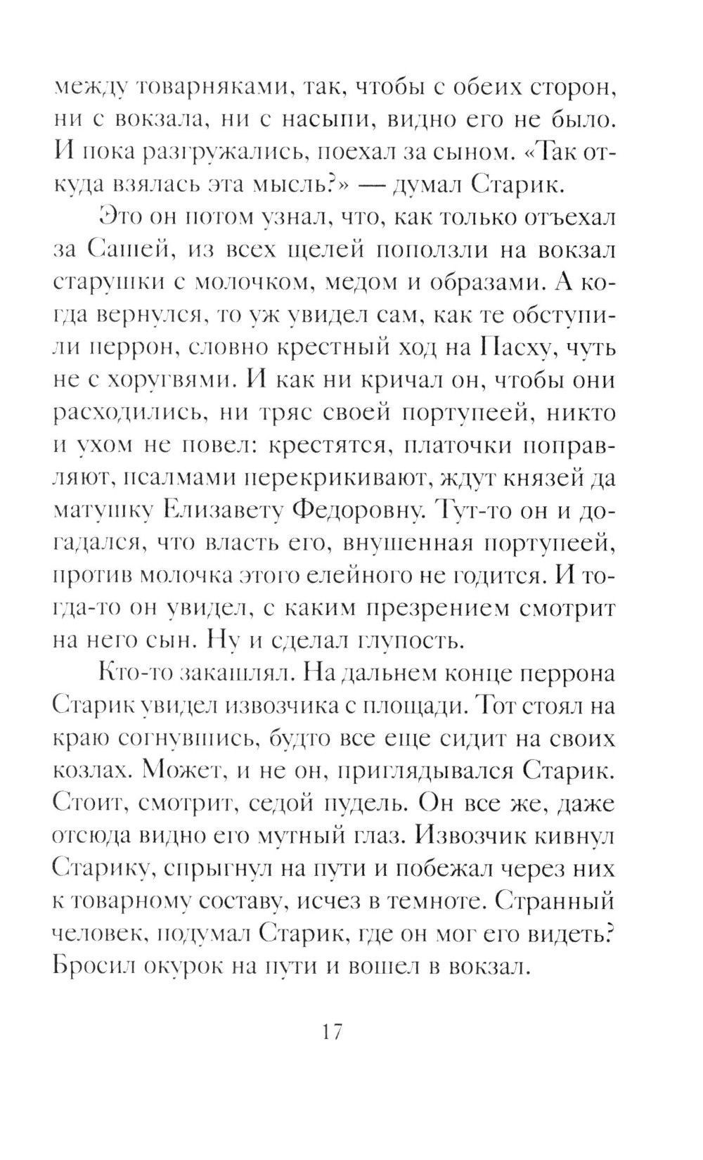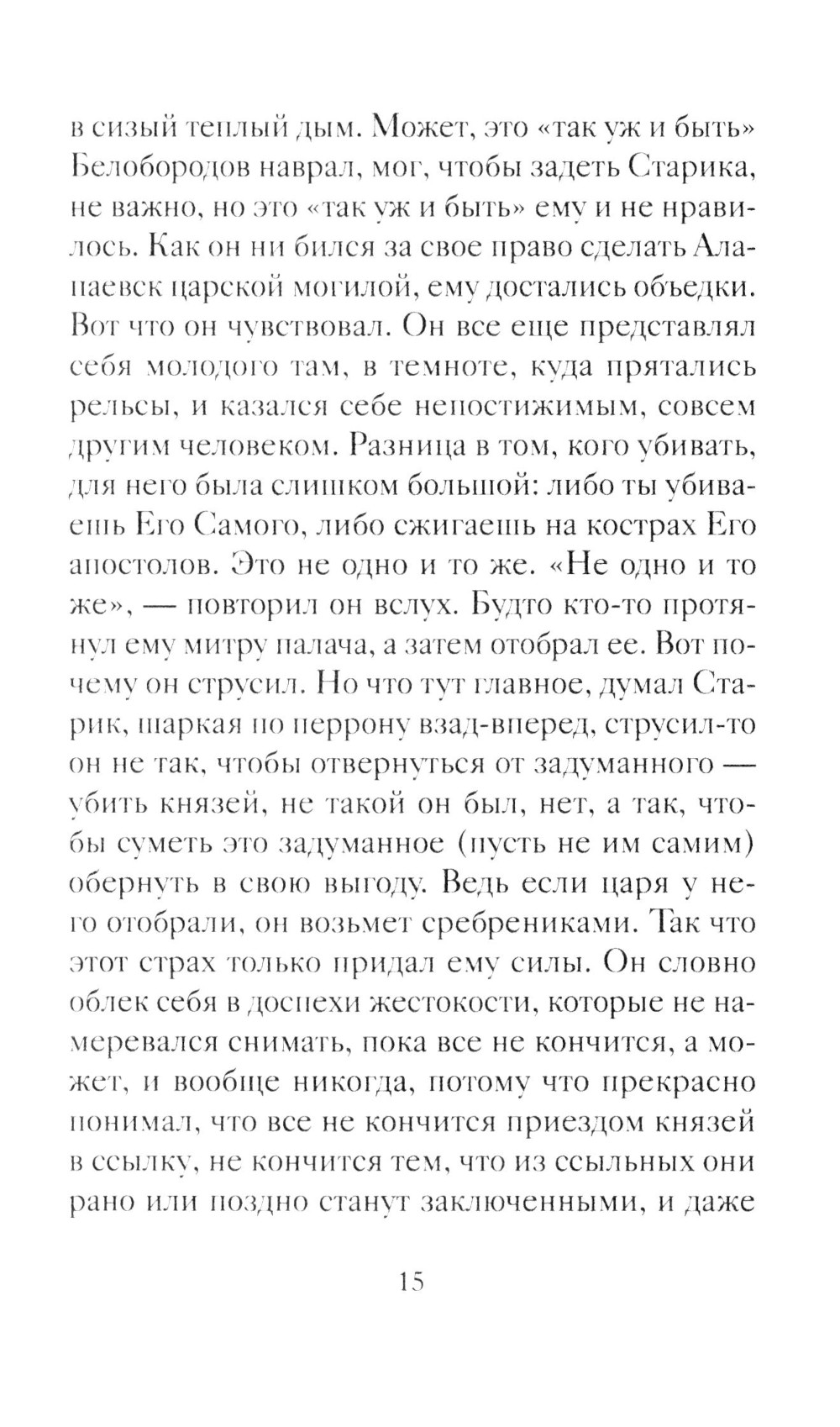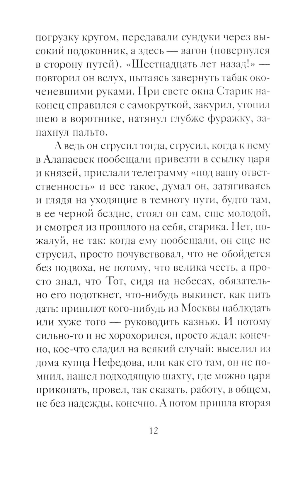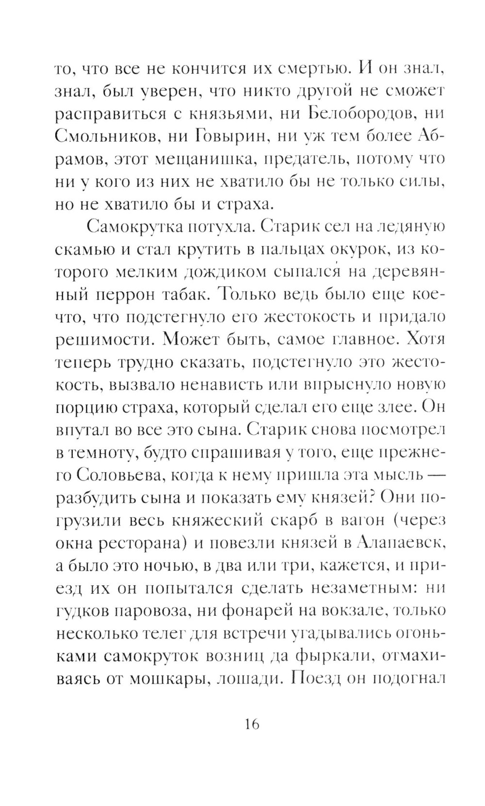 Роман основан на реальных событиях вокруг убийства Великих князей, в числе которых была Великая княгиня Елизавета Федоровна, в городе Алапаевске летом 1918 го-да. Главные герои романа - Ефим Соловьев, комиссар юстиции и один из организаторов убийства, и игумен Серафим, духовник княгини Елизаветы, который пытается спасти ее от смерти, а затем - вывезти ее тело в Иерусалим, несколько лет скрываясь от преследования Соловьева. Масштабные исторические события переплетаются с судьбами героев. Жизнь одних превращается в житие, жизнь других - в катастрофу. Личные мотивы разрушают жизни тысяч людей и вдохновляют на подвиг другие тысячи. Роман охватывает события в период с 1918 по 1934 год, происходящие от Маньчжурии до Соловков. Это исторический детектив, в котором каждый герой пытается найти себя в разрушенном мире. Это история о любви к Богу и ненависти, об апокалипсисе и спасении.| Издательство | ГРАНАТ |