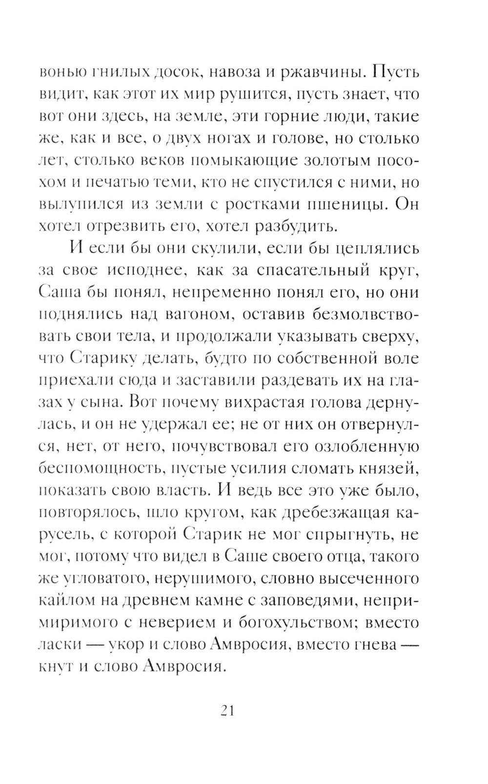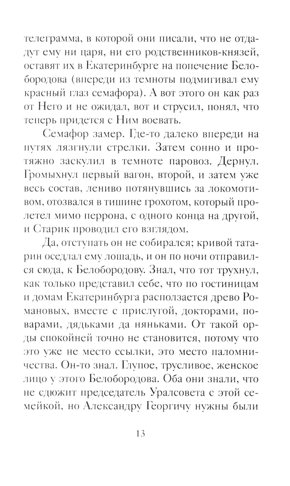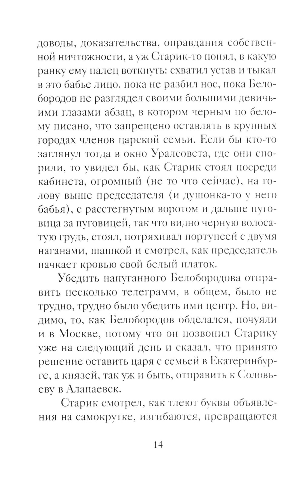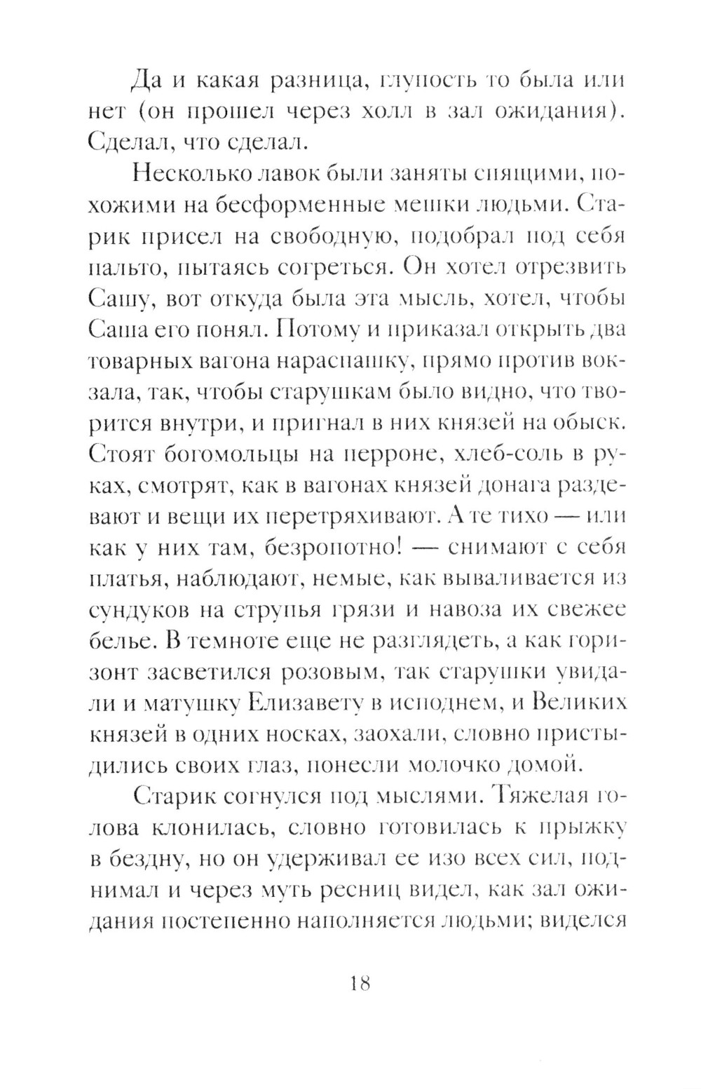 Роман основан на реальных событиях вокруг убийства Великих князей, в числе которых была Великая княгиня Елизавета Федоровна, в городе Алапаевске летом 1918 го-да. Главные герои романа - Ефим Соловьев, комиссар юстиции и один из организаторов убийства, и игумен Серафим, духовник княгини Елизаветы, который пытается спасти ее от смерти, а затем - вывезти ее тело в Иерусалим, несколько лет скрываясь от преследования Соловьева. Масштабные исторические события переплетаются с судьбами героев. Жизнь одних превращается в житие, жизнь других - в катастрофу. Личные мотивы разрушают жизни тысяч людей и вдохновляют на подвиг другие тысячи. Роман охватывает события в период с 1918 по 1934 год, происходящие от Маньчжурии до Соловков. Это исторический детектив, в котором каждый герой пытается найти себя в разрушенном мире. Это история о любви к Богу и ненависти, об апокалипсисе и спасении.| Издательство | ГРАНАТ |