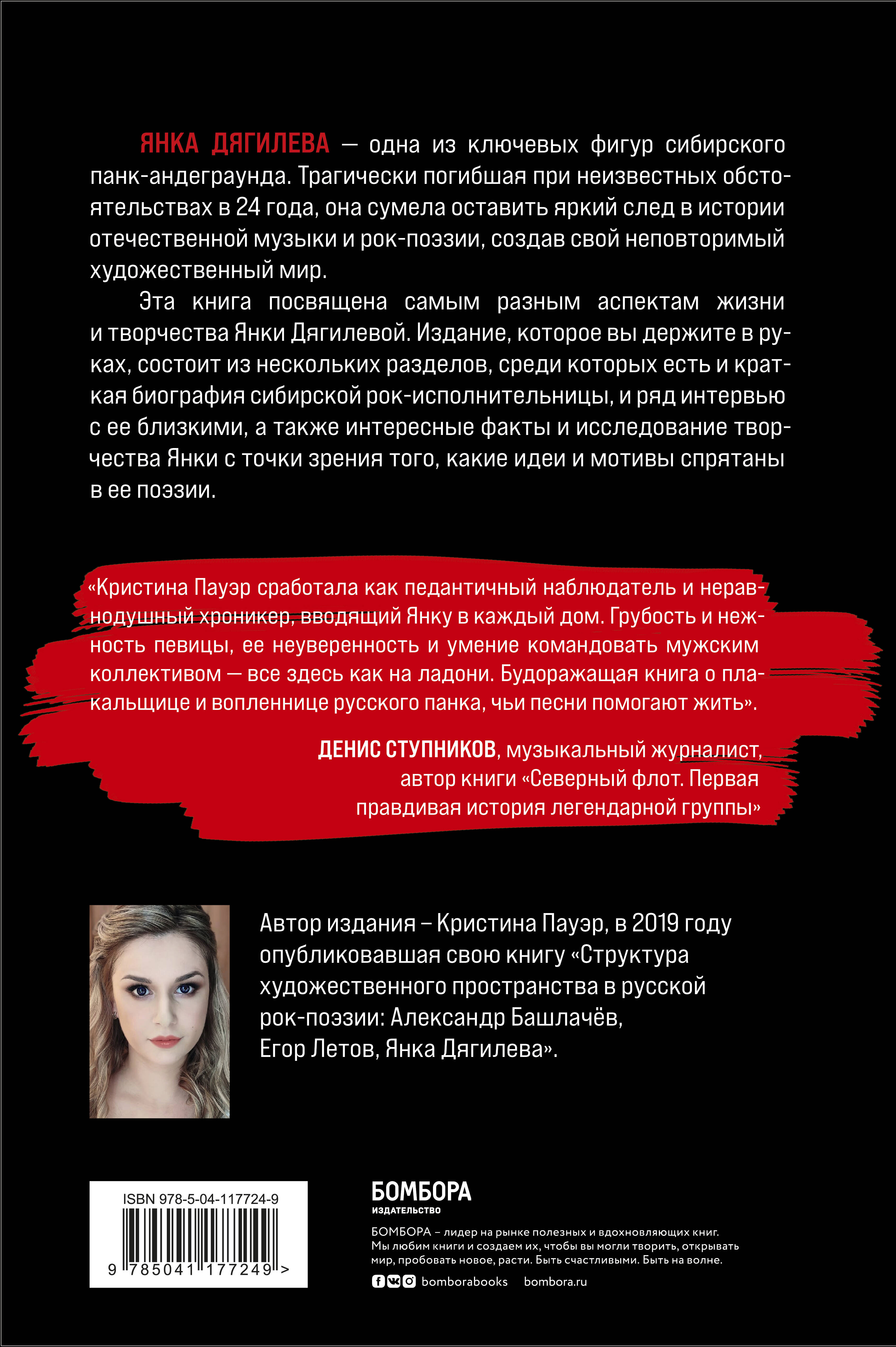 «Я настоящая, только когда одна совсем или когда со сцены песни пою - даже это только как если, знаешь, когда самолетик летит, пунктирная линия получается, - от того, что есть на самом деле». Янка Дягилева - самая известная представительница сибирского панк-движения и советской рок-сцены. Она никогда не давала интервью - единственная прижизненная статья о ней носила название «Панк-звезда из глухой Сибири». Прожив лишь четверть века, Яна погибла при невыясненных обстоятельствах, но оставила наследие в виде трех десятков песен, которые берут за живое прежде всего своей пронзительной, честной лирикой. В 2021 году, на момент издания этой книги, Янке Дягилевой исполнилось бы 55 лет. Автор этого издания - кандидат филологических наук Кристина Пауэр, в 2019 году опубликовавшая свою книгу «Структура художественного пространства в русской рок-поэзии: Александр Башлачёв, Егор Летов, Янка Дягилева». В книге «Янка Дягилева. Жизнь и творчество» она собрала интересные факты о сибирской рок-исполнительнице и провела ряд интервью с ее близкими, среди которых - рок-музыканты Олег «Манагер» Судаков и Андрей Машнин. Также Кристина Пауэр исследовала тексты Янки Дягилевой с целью разъяснить некоторые варианты трактовки смысла поэзии Янки, чтобы поклонники смогли приблизиться к главным идеям её произведений, понять Янку как творческую единицу и как человека.| Издательство | ООО "Издательство "Эксмо" |