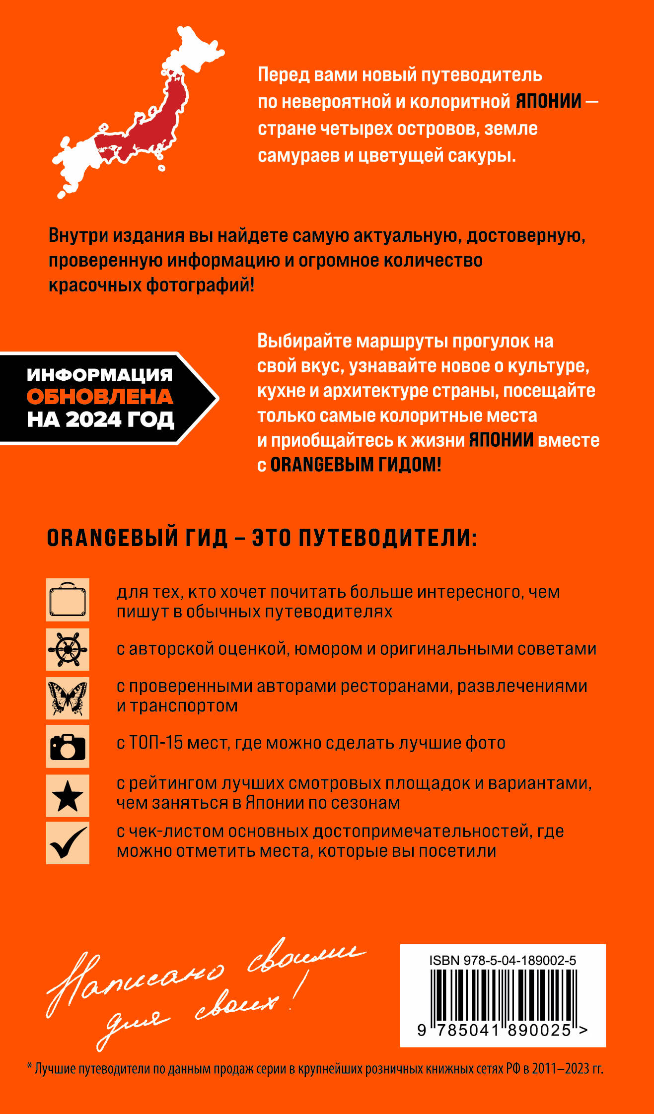 Удивительная богатая культура, тысячелетняя история и традиции, современные технологии и самобытность - все это Япония! Отправляйтесь в незабываемое путешествие по Стране Восходящего Солнца вместе с «Оранжевым гидом»! В нем содержится актуальная и полезная информация о главных городах страны, различные маршруты на любой вкус, подсказки, что делать, если идет дождь, или где искать лучшие смотровые площадки, а также множество полезных авторских советов. Посетите главные храмы и святилища Токио, полюбуйтесь на Фудзи, исследуйте многогранный Киото и сакральный Никко - выбор только за вами! Вас ждут маршруты путешествий по главным достопримечательностям Японии. Ориентироваться на местности помогут удобные карты, расположенные на страницах путеводителя. Вся информация актуальна на 2024 год.| Издательство | ООО "Издательство "Эксмо" |