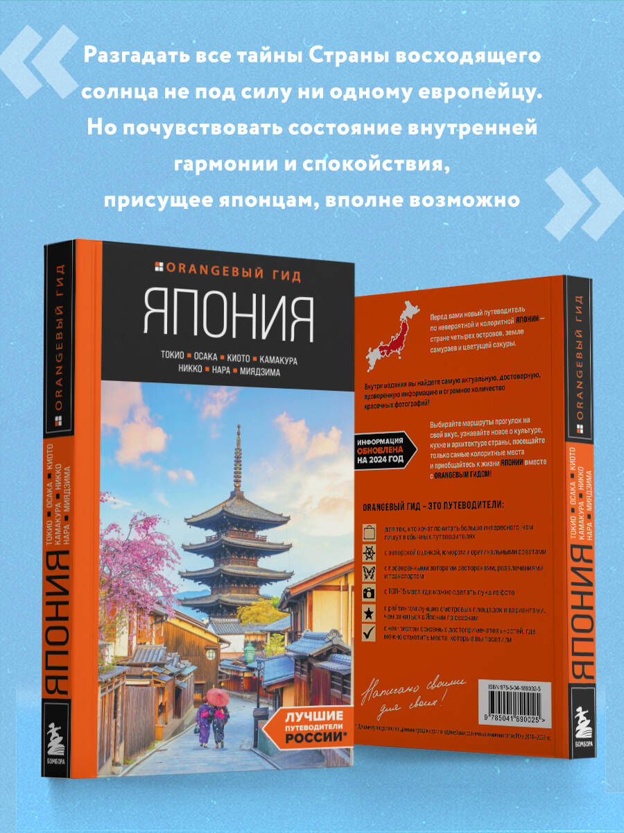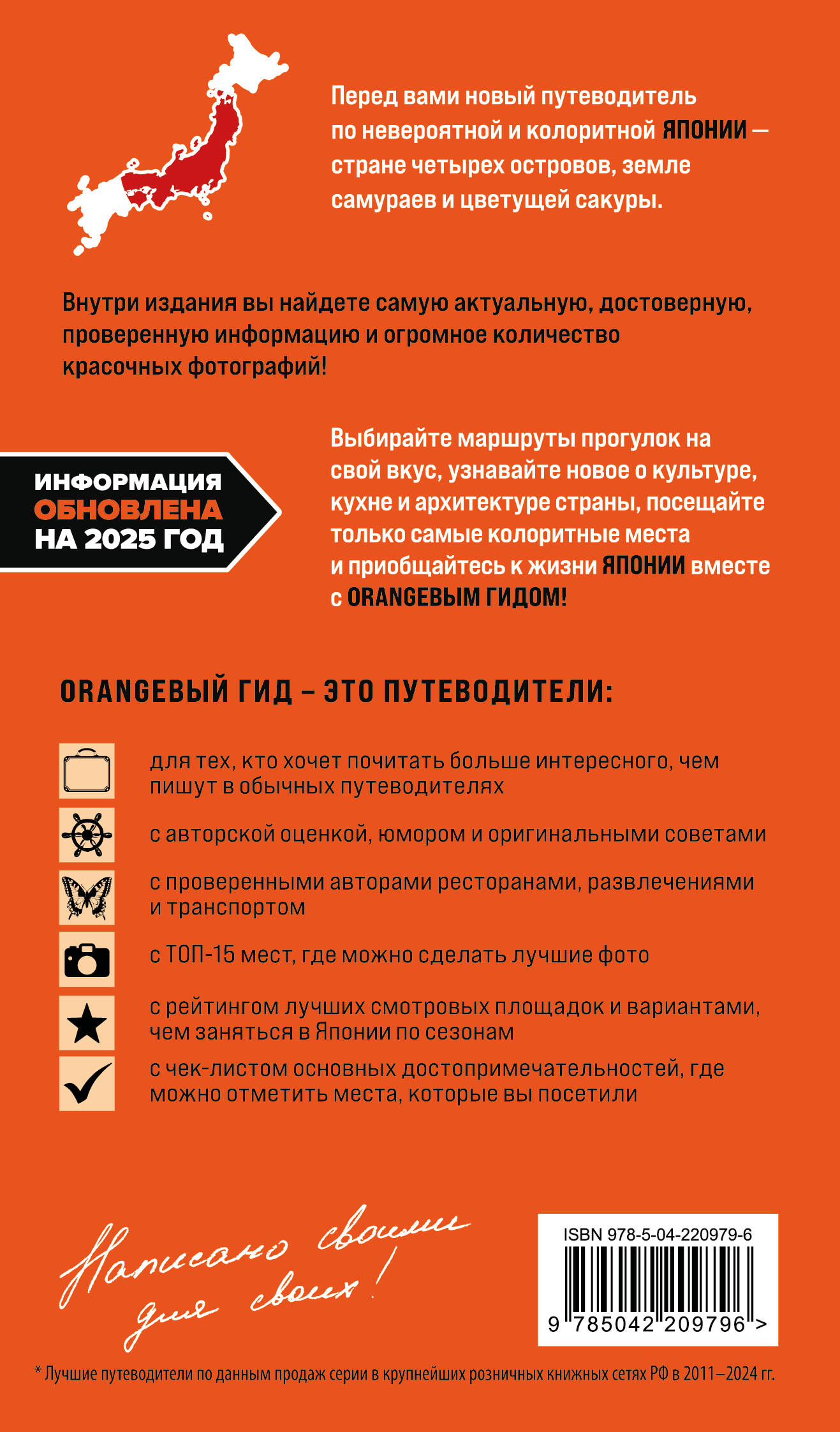 Удивительная богатая культура, тысячелетняя история и традиции, современные технологии и самобытность - все это Япония! Отправляйтесь в незабываемое путешествие по Стране Восходящего Солнца вместе с «Оранжевым гидом»! В нем содержится актуальная и полезная информация о главных городах страны, различные маршруты на любой вкус, подсказки, что делать, если идет дождь, или где искать лучшие смотровые площадки, а также множество полезных авторских советов. Посетите главные храмы и святилища Токио, полюбуйтесь на Фудзи, исследуйте многогранный Киото и сакральный Никко - выбор только за вами! Вас ждут маршруты путешествий по главным достопримечательностям Японии. Ориентироваться на местности помогут удобные карты, расположенные на страницах путеводителя. Вся информация актуальна на 2025 год.| Издательство | ООО "Издательство "Эксмо" |