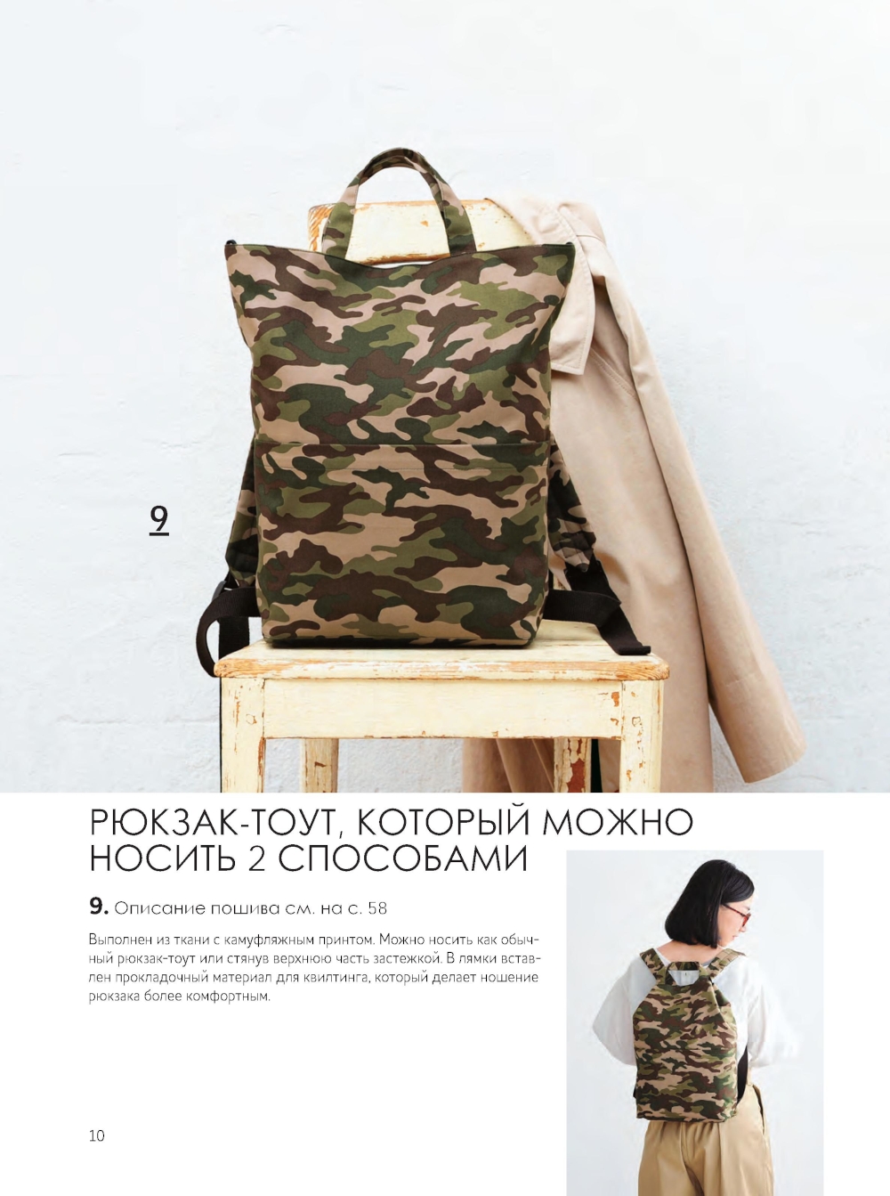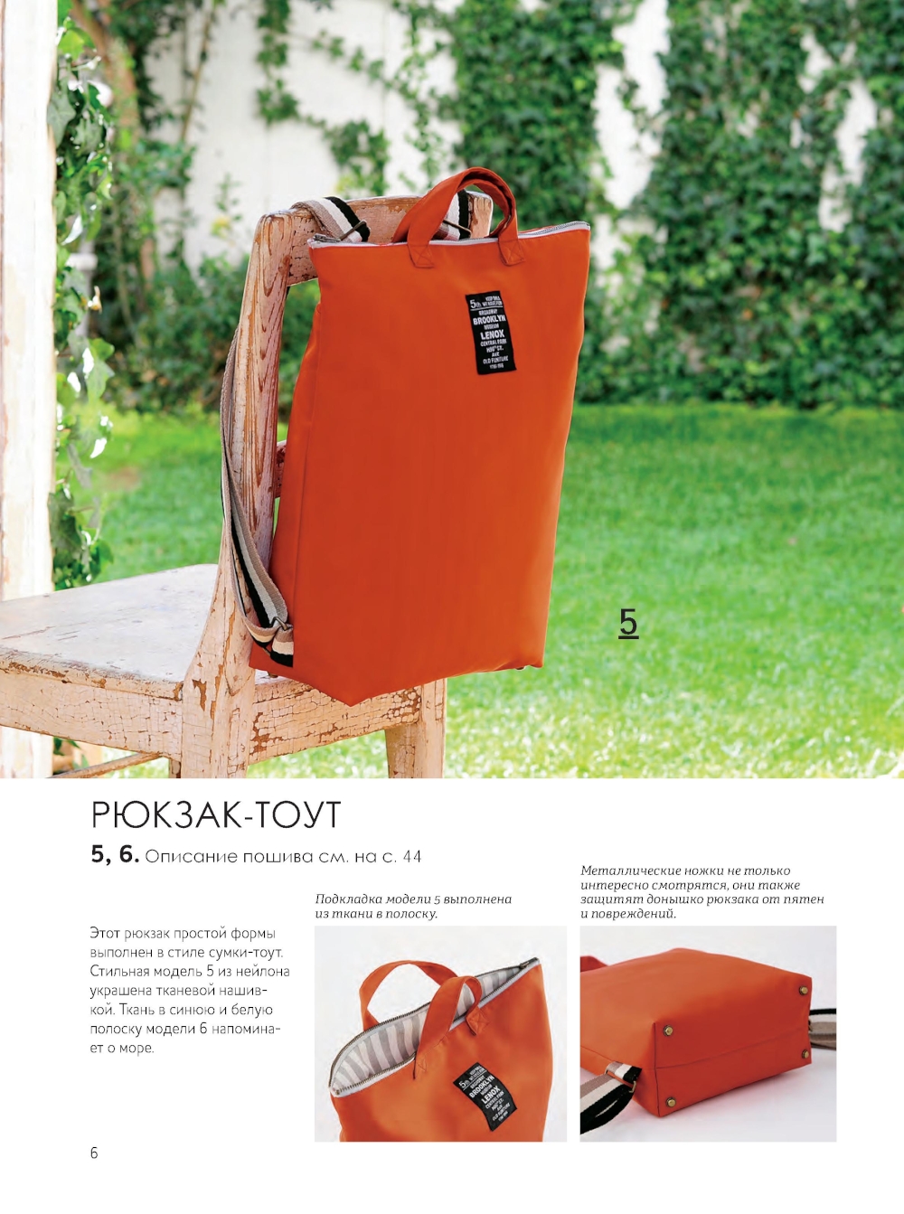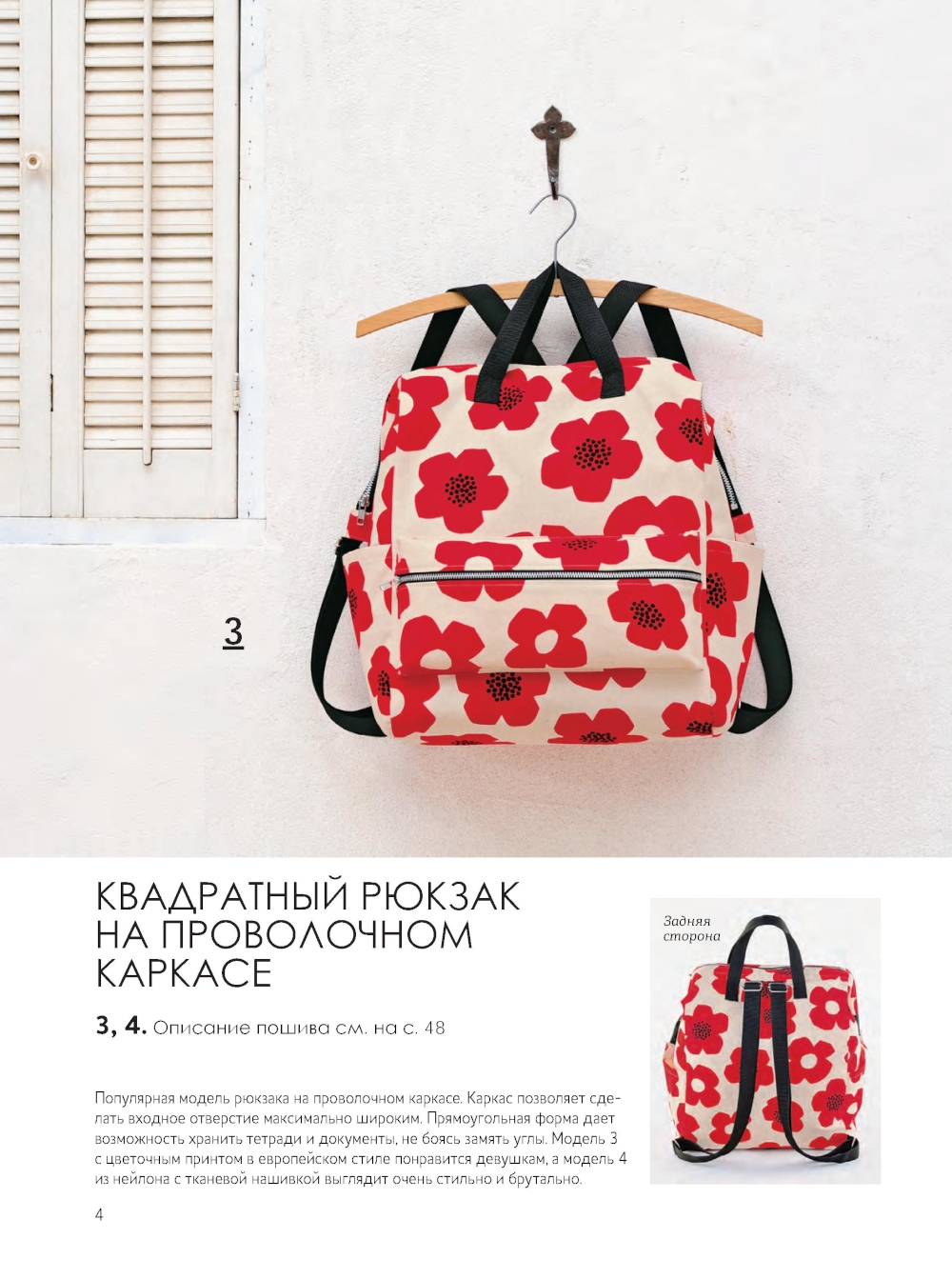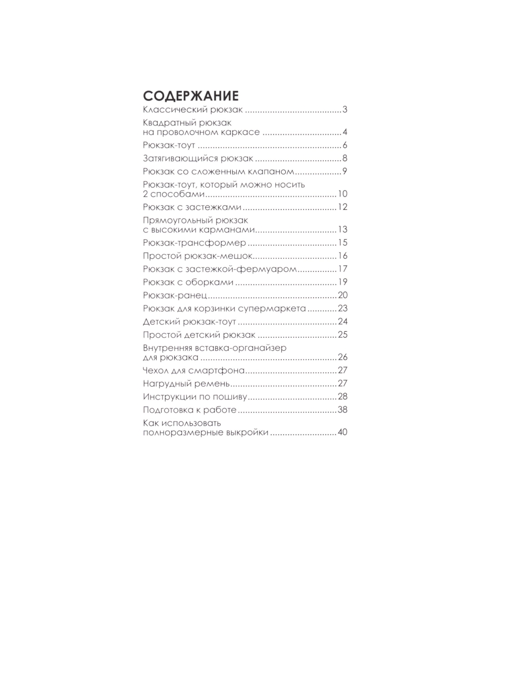 Необычный дизайн, интересный крой, суперпростой пошив и удобство в носке - таковы главные особенности рюкзаков, представленных в этой книге. Модели от известных японских дизайнеров порадуют всех, кто увлекается шитьем и любит практичные, нестандартные вещи. Классические рюкзаки, рюкзаки-торбы и рюкзаки-сумки; с ременными стропами и шнурами в качестве завязок, на молнии, с утяжкой и даже на фермуаре, с ручками и без них - из 25 проектов, представленных в книге, вы точно выберете свой - единственный и неповторимый. В конце книги вас ждут бонусы - мастер-классы по пошиву универсального внутреннего органайзера для рюкзака и чехла для смартфона, который крепится на лямку. Все модели сопровождаются подробными, интуитивно понятными описаниями работы и схемами пошива. К книге прилагается лист выкроек.| Издательство | Контэнт |