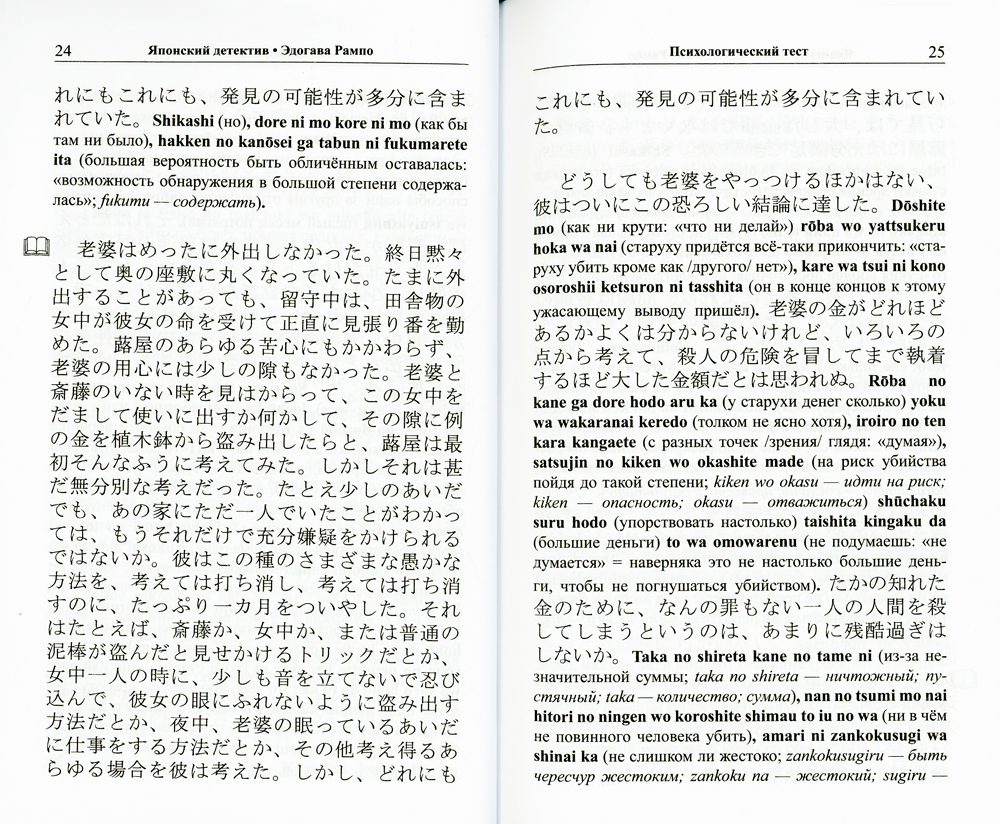 Текст новеллы основоположника детективного жанра в японской литературе Эдогавы Рампо адаптирован в настоящем издании по методу Ильи Франка: снабжен транскрипцией, дословным переводом на русский язык и необходимым лексико-грам­матическим комментарием.