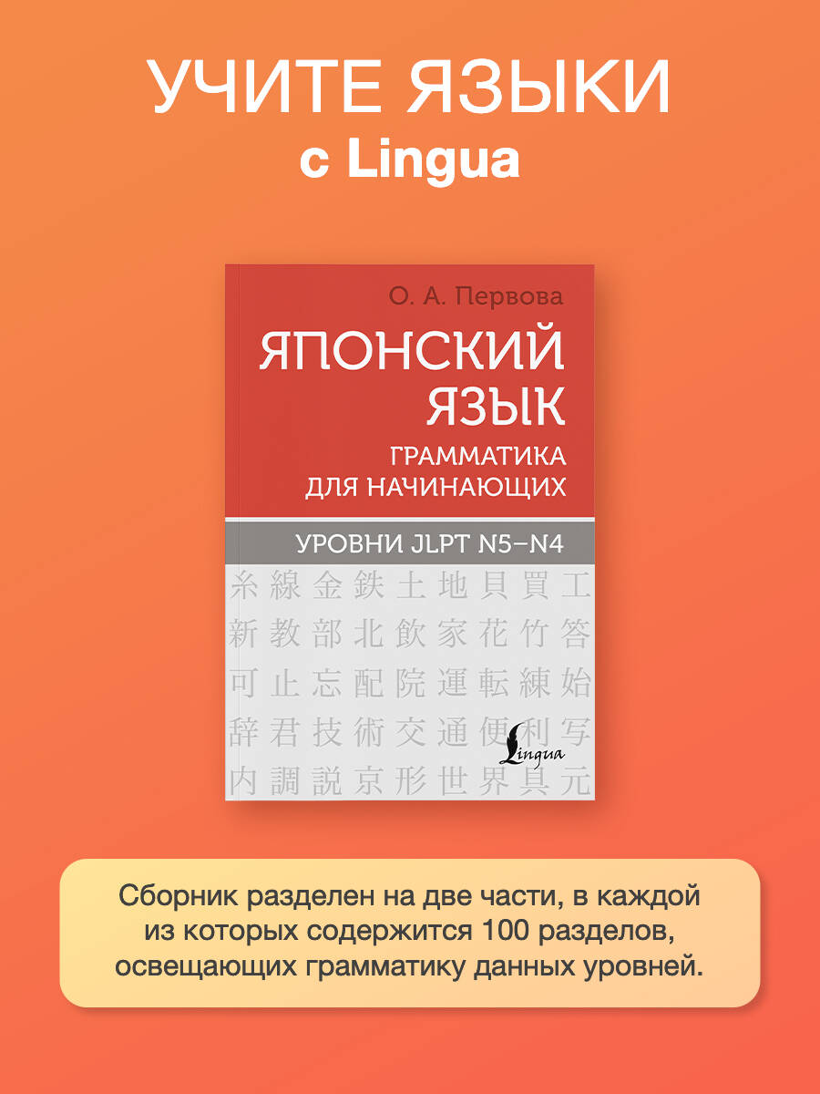 Ольга Андреевна Первова - преподаватель и переводчик японского языка со стажем работы более 15 лет, выпускница МГПУ, автор многочисленных учебных пособий по японскому языку и основатель онлайн школы японского языка Satori JP. Данное учебное пособие представляет собой справочник по японскому языку с грамматическими темами, необходимыми для успешной сдачи JLPT уровней N5 и N4. Курс разделен на две части, в каждой из которых содержится 100 разделов, освещающих грамматику данных уровней. Каждая тема завершается упражнением для закрепления теоретического материала. Ответы на эти упражнения находятся в конце книги. Пособие адресовано всем, кто хочет овладеть грамматикой японского языка начального и среднего уровней.| Издательство | Издательство "АСТ" |