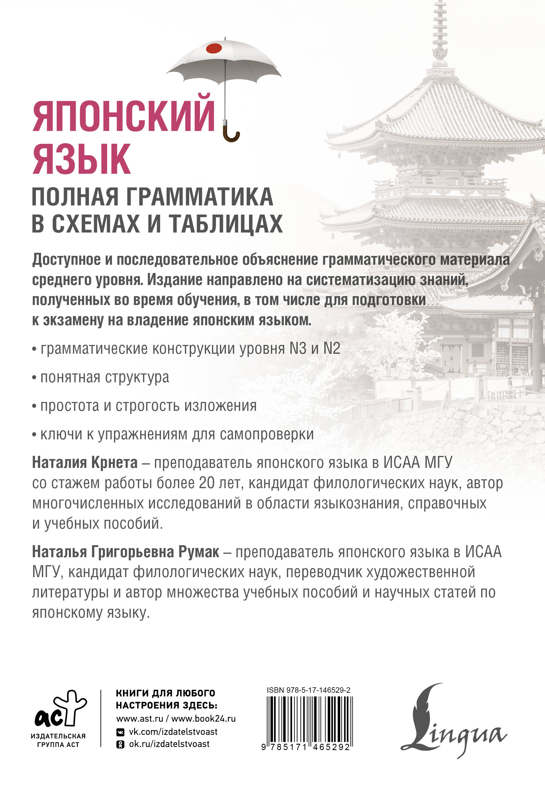 Наталия Крнета - преподаватель японского языка в ИСАА МГУ со стажем работы более 20 лет, кандидат филологических наук, автор многочисленных исследований в области языкознания, справочных и учебных пособий. Наталья Григорьевна Румак - преподаватель японского языка в ИСАА МГУ, кандидат филологических наук, переводчик художественной литературы и автор множества учебных пособий и научных статей по японскому языку. Данное учебное пособие содержит грамматические конструкции среднего уровня для продолжающих изучение японского языка и включает в себя основной грамматический материал, входящий в уровень N3 экзамена на владение японским языком и часть конструкций уровня N2. Цель пособия - систематизация знаний, полученных во время обучения, в том числе, для подготовки к экзамену на владение японским языком. Пособие может быть использовано как во время аудиторных занятий для повторения уже усвоенных или отработки новых конструкций, так и для самостоятельной работы.| Издательство | Издательство "АСТ" |