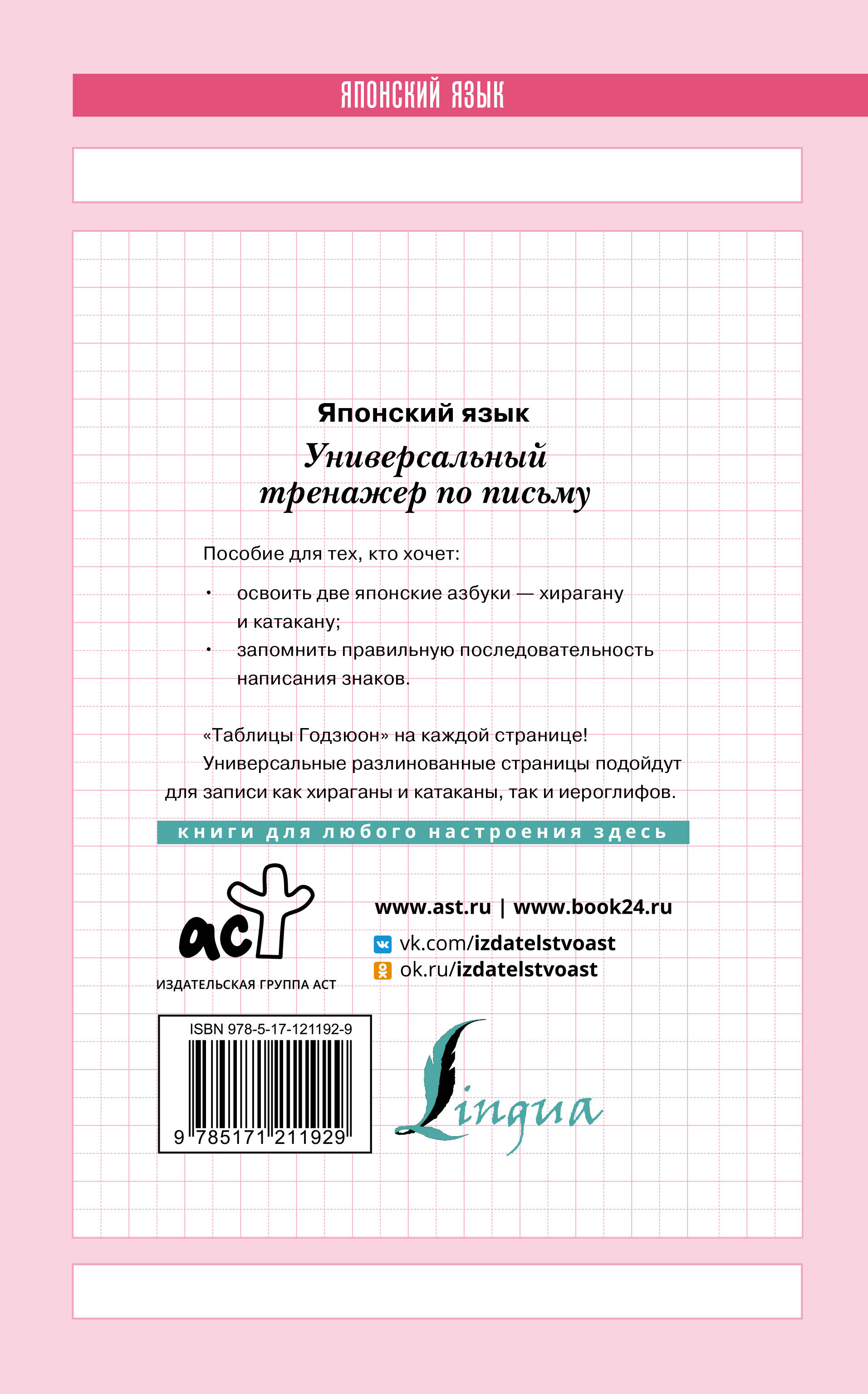 Это пособие не только поможет освоить две японские азбуки - хирагану и катакану, но и запомнить правильность написания. Универсальность тренажера в том, что на разлинованном пространстве вы сможете записывать и знаки азбуки, и иероглифы. На каждой странице сверху расположены памятки "Таблицы Годзюон". Издание адресовано всем, кто начинает изучение японского языка и стремится достичь совершенства.| Издательство | ИЗДАТЕЛЬСТВО "АСТ" |