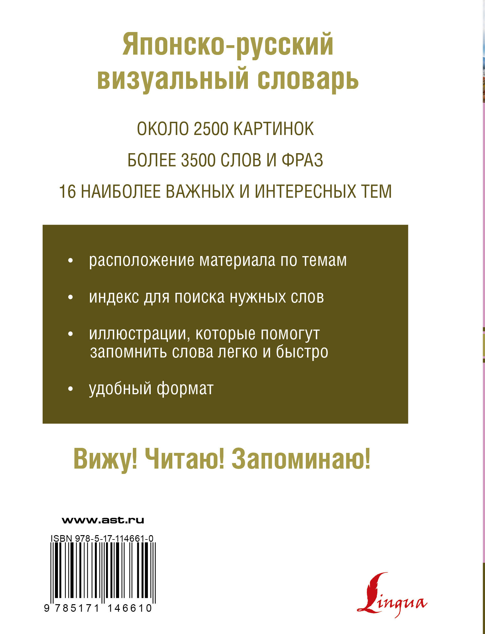 В серию "Современные визуальные словари" входят словари на пяти основных европейских языках и трех восточных. Японско-русский визуальный словарь содержит более 3500 слов и выражений и около 2500 иллюстраций. Материал орагнизован по тематическому принципу. Подробно представлены 16 тем, среди которых Люди, Транспорт, Спорт, Досуг, Окружающая среда и др. Словарь дополнен русским указателем, позволяющим быстро найти нужное слово. Предназначен для всех, кто учит японский язык.| Издательство | ИЗДАТЕЛЬСТВО "АСТ" |