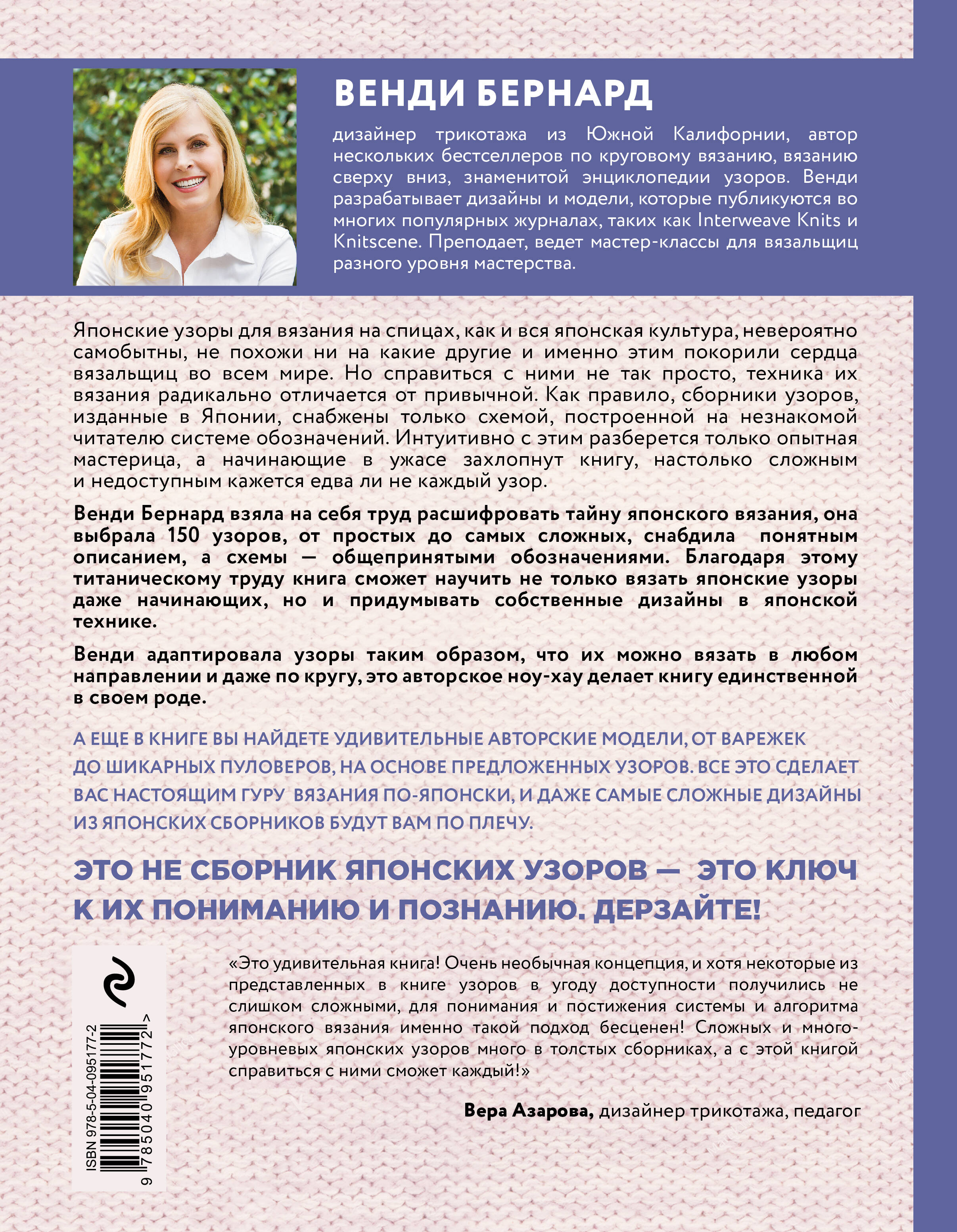 Аннотация: Японское вязание на спицах. Ключ для чтения схем и 150+ узоров для вязания сверху вниз, снизу вверх, поворотными рядами и по кругу