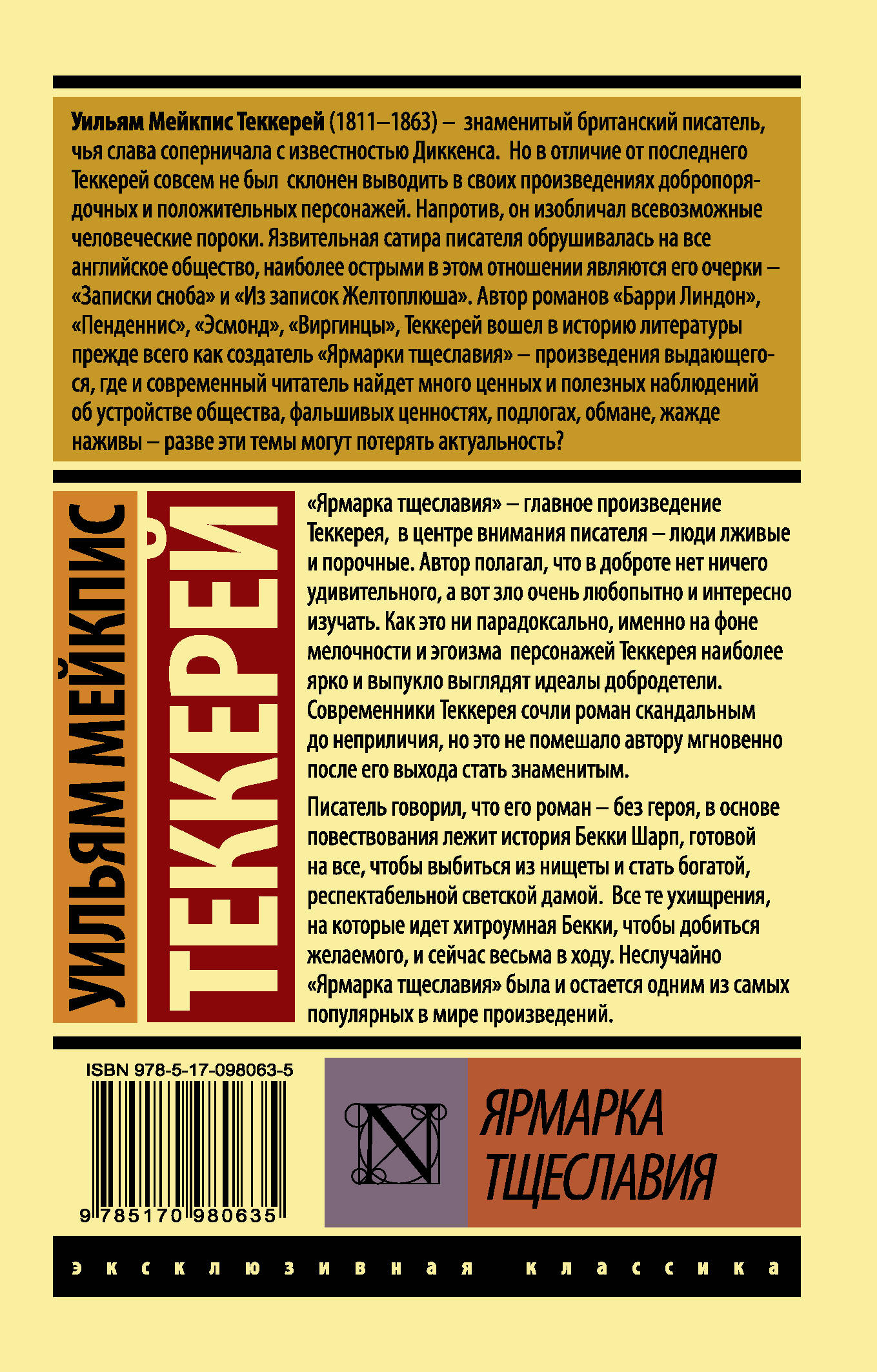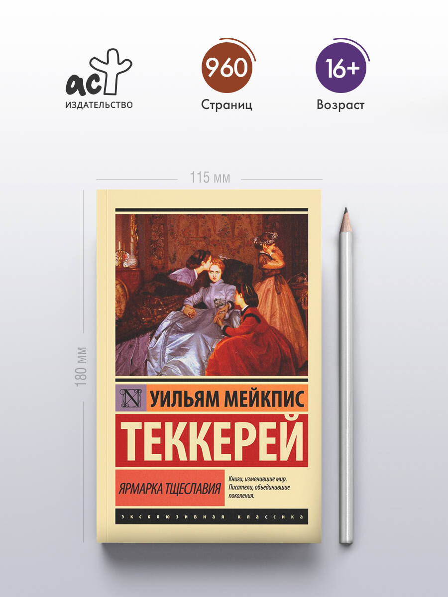 "Ярмарка тщеславия" - главное произведение Теккерея, в центре внимания писателя - люди лживые и порочные. Автор полагал, что в доброте нет ничего удивительного, а вот зло очень любопытно и интересно изучать. Как это ни парадоксально, именно на фоне мелочности и эгоизма персонажей Теккерея наиболее ярко и выпукло выглядят идеалы добродетели. Современники Теккерея сочли роман скандальным до неприличия, но это не помешало автору мгновенно после его выхода стать знаменитым. Писатель говорил, что его роман - без героя, в основе повествования лежит история Бекки Шарп, готовой на все, чтобы выбиться из нищеты и стать богатой, респектабельной светской дамой. Все те ухищрения, на которые идет хитроумная Бекки, чтобы добиться желаемого, и сейчас весьма в ходу. Неслучайно "Ярмарка тщеславия" была и остается одним из самых популярных в мире произведений.| Издательство | ИЗДАТЕЛЬСТВО "АСТ" |