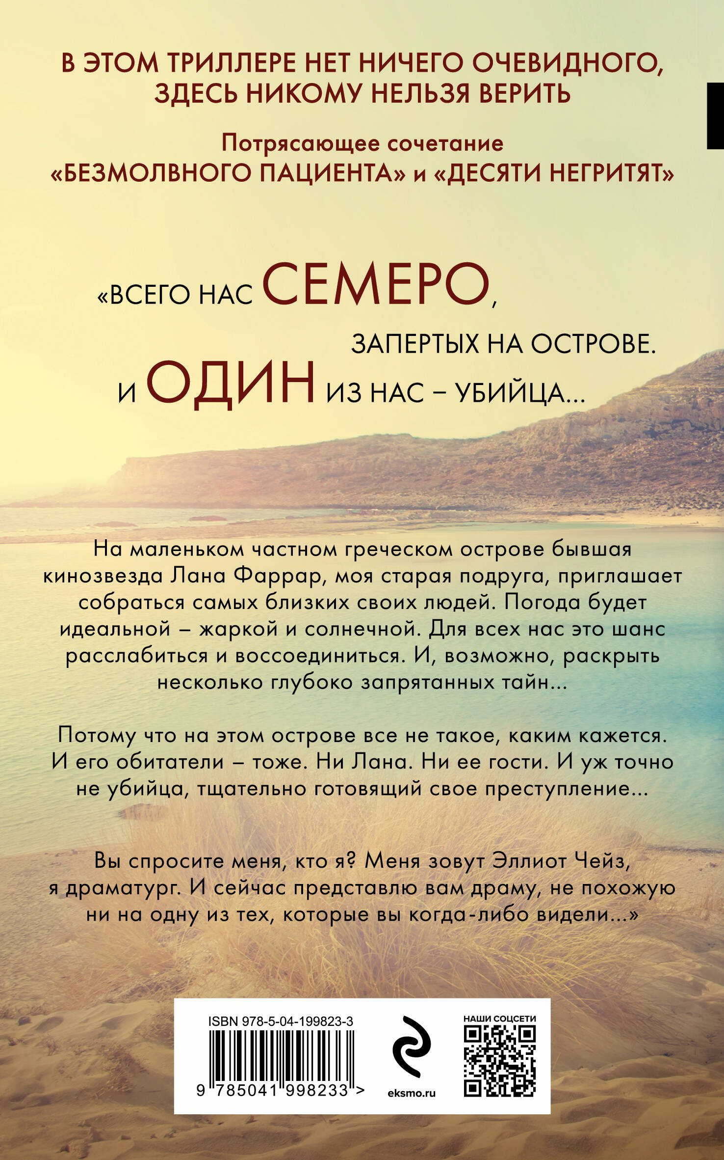 ОТ АВТОРА БЕСТСЕЛЛЕРА № 1 В МИРЕ В 2019-2021 гг. «БЕЗМОЛВНЫЙ ПАЦИЕНТ» МОМЕНТАЛЬНЫЙ БЕСТСЕЛЛЕР SUNDAY TIMES И NEW YORK TIMES В этом триллере нет ничего очевидного, здесь никому нельзя верить. Потрясающее сочетание «Безмолвного пациента» и «Десяти негритят». «Всего нас семеро, запертых на острове. И один из нас - убийца… На маленьком частном греческом острове бывшая кинозвезда Лана Фаррар, моя старая подруга, приглашает собраться самых близких своих людей. Погода будет идеальной - жаркой и солнечной. Для всех нас это шанс расслабиться и воссоединиться. И, возможно, раскрыть несколько глубоко запрятанных тайн… Потому что на этом острове всё не такое, каким кажется. И его обитатели - тоже. Ни Лана. Ни ее гости. И уж точно ни убийца, тщательно готовящий свое преступление… Вы спросите меня, кто я? Меня зовут Эллиот Чейз, я драматург. И сейчас представлю вам драму, не похожую ни на одну из тех, которые вы когда-либо видели…» ______________________________________________________ «Полный триумф - просто блестяще». - Стивен Фрай «Твистов и поворотов сюжета здесь хватит на два романа». - Дэвид Болдаччи «Это мой любимый роман Михаэлидеса - безусловного мастера сюжетных твистов». - Люси Фоли «Классическая запутанная детективная история убийства. Прекрасно прорисованный состав персонажей… вы будете гадать, кто убийца, до самого финала, который шокирует вас. Умно и чертовски весело». - Крис Уитакер «Бесконечно развивающийся, безумно интересный роман, концовку которого невозможно предсказать. Как только вы думаете, что загнали сюжет в угол, он выворачивается и с ошеломляющим размахом движется к сокрушительному финалу. Это "Талантливый мистер Рипли" нашего времени». - Блейк Крауч «Одна из тех редких книг, где все на самом деле не так, как кажется. Как всегда, Алекс Михаэлидис не разочаровывает». - Рагнар Йонассон «Мастер-класс саспенса». - Стив Кавана| Издательство | ООО "Издательство "Эксмо" |