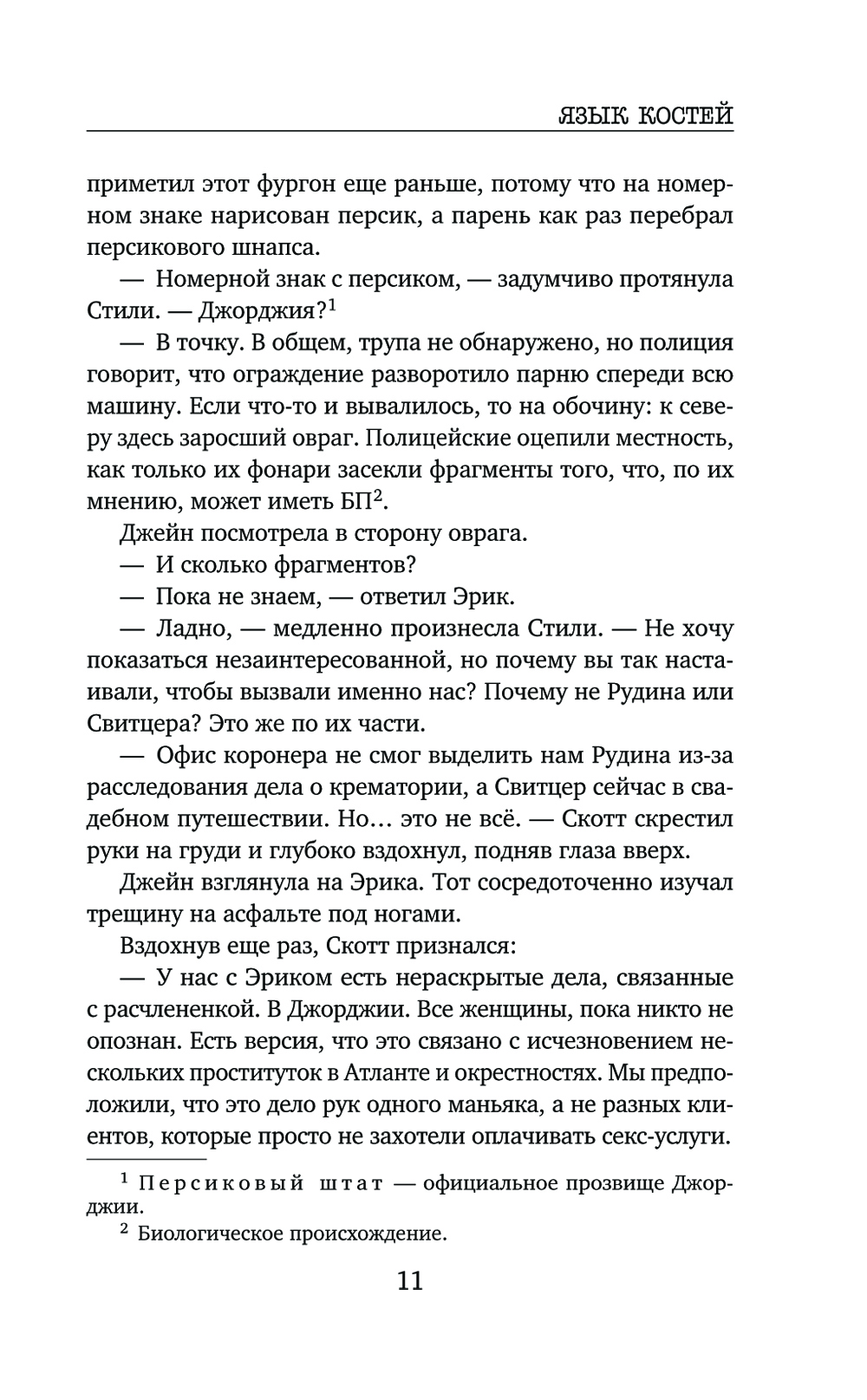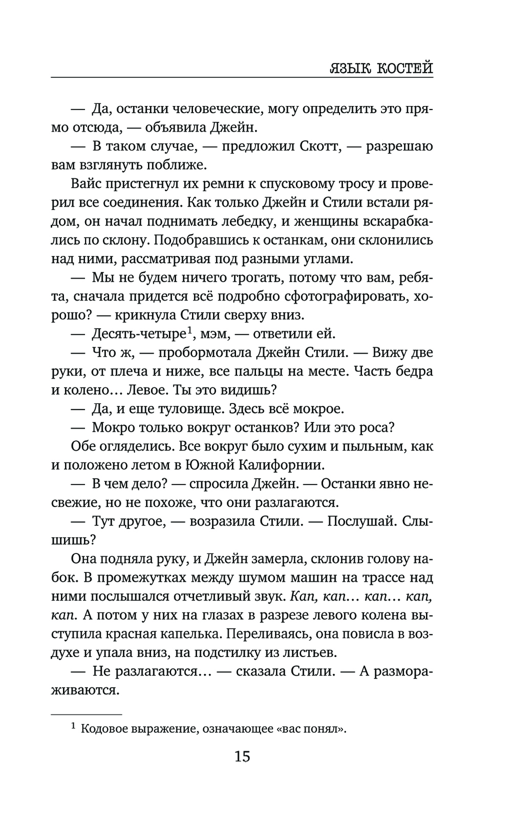Нетрезвый водитель врезался в фургон на автостраде Лос-Анджелеса. Обычное дело. Вернее, было бы обычным, если бы фургон не скрылся с места происшествия, а из него в результате столкновения не выпали... замороженные части человеческого тела. Или тел. Агент ФБР неофициально обращается за помощью к судмедэкспертам-антропологам Джейн Холл и Стили Ландер, чье частное агентство занимается криминалистической экспертизой неопознанных трупов. Джейн и Стили - великолепные знатоки своего дела. Они быстро устанавливают, что телесные фрагменты принадлежат сразу нескольким женщинам. Причем личность одной из них возможно установить по хирургической пластине в плечевой кости. Эта удачная зацепка способна существенно продвинуть поиски того, кто убил и расчленил жертв. Однако эйфории вскоре суждено развеяться: уникальные навыки Джейн и Стили приводят их слишком близко к убийце...| Издательство | Эксмо |