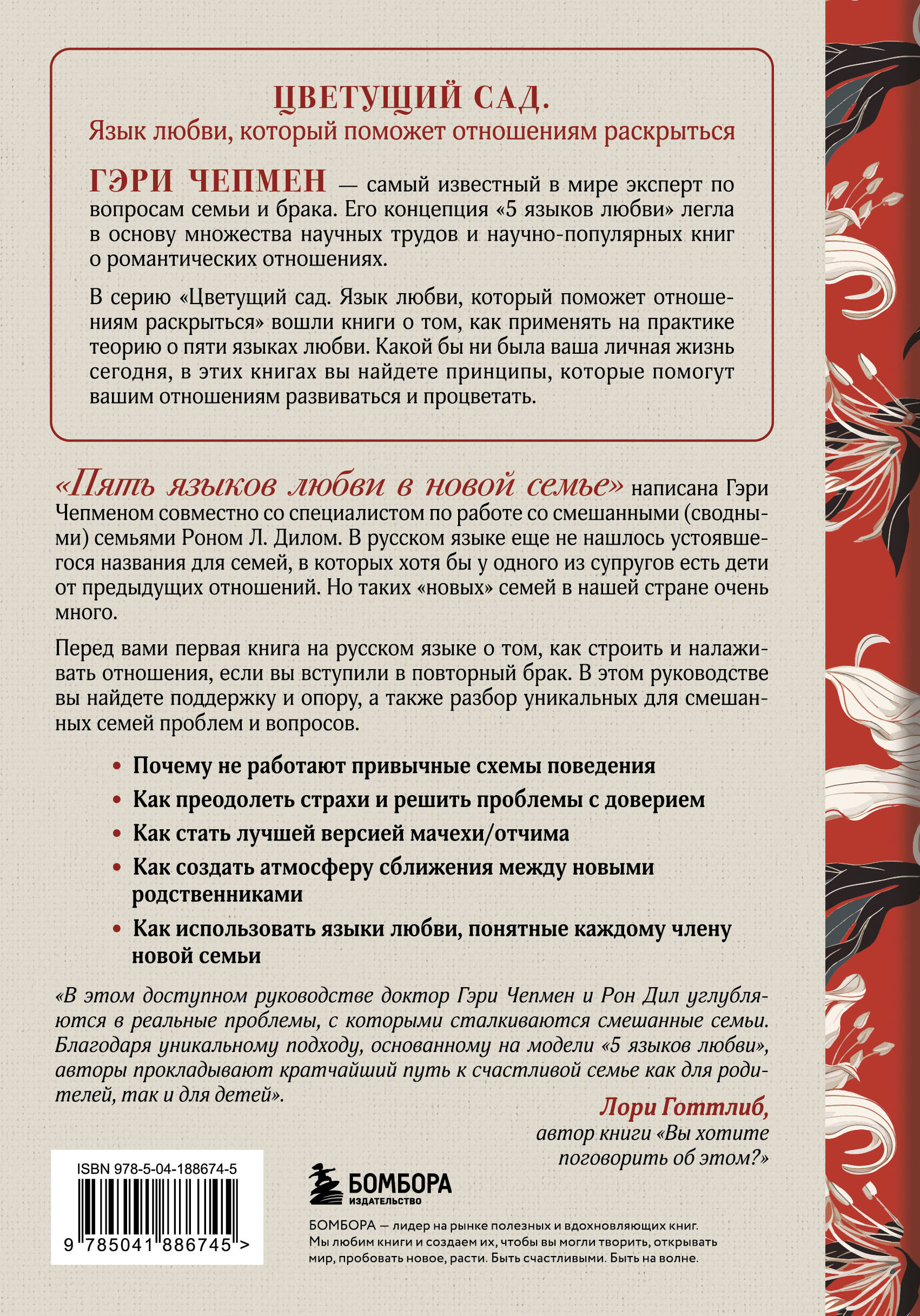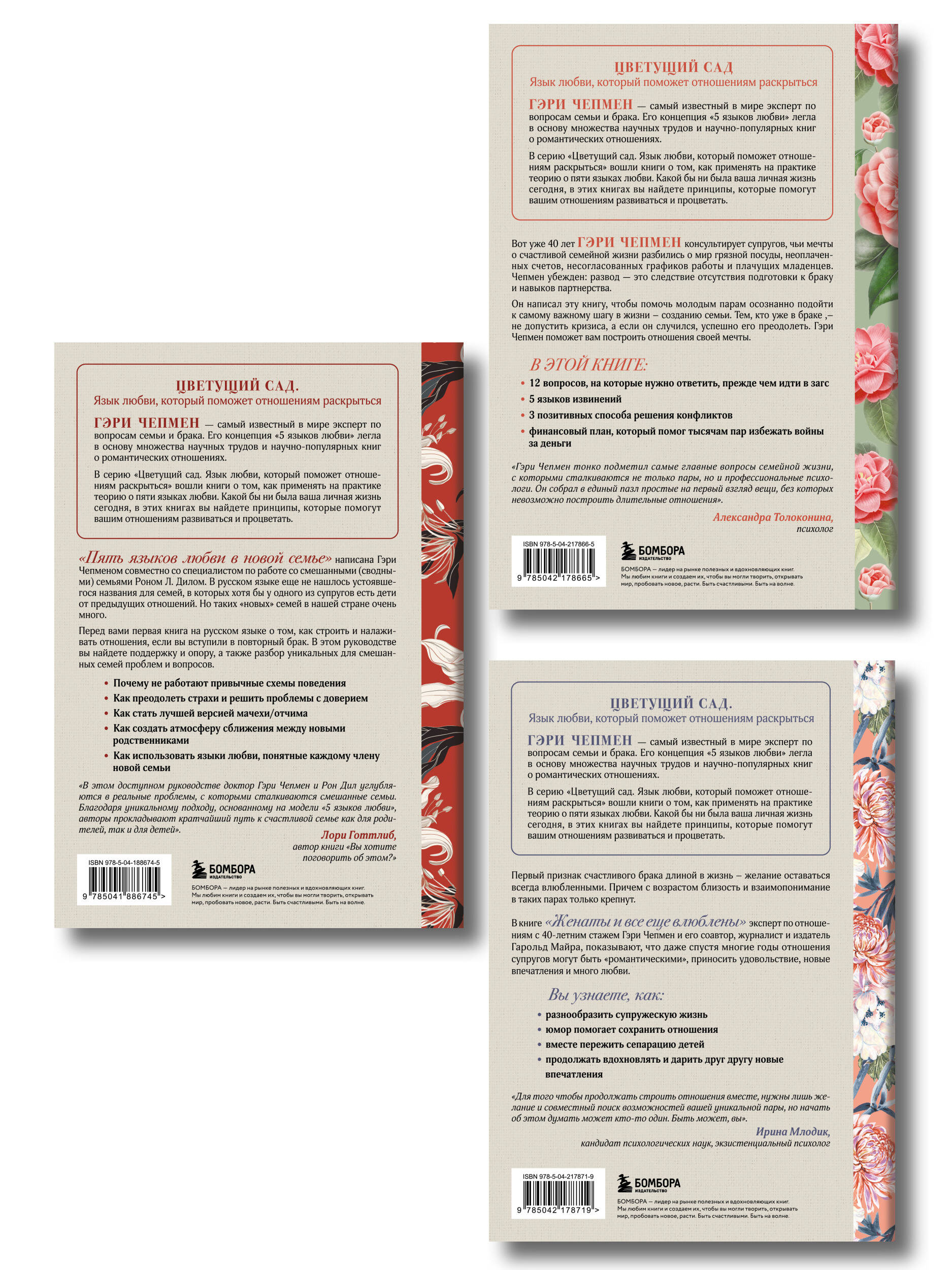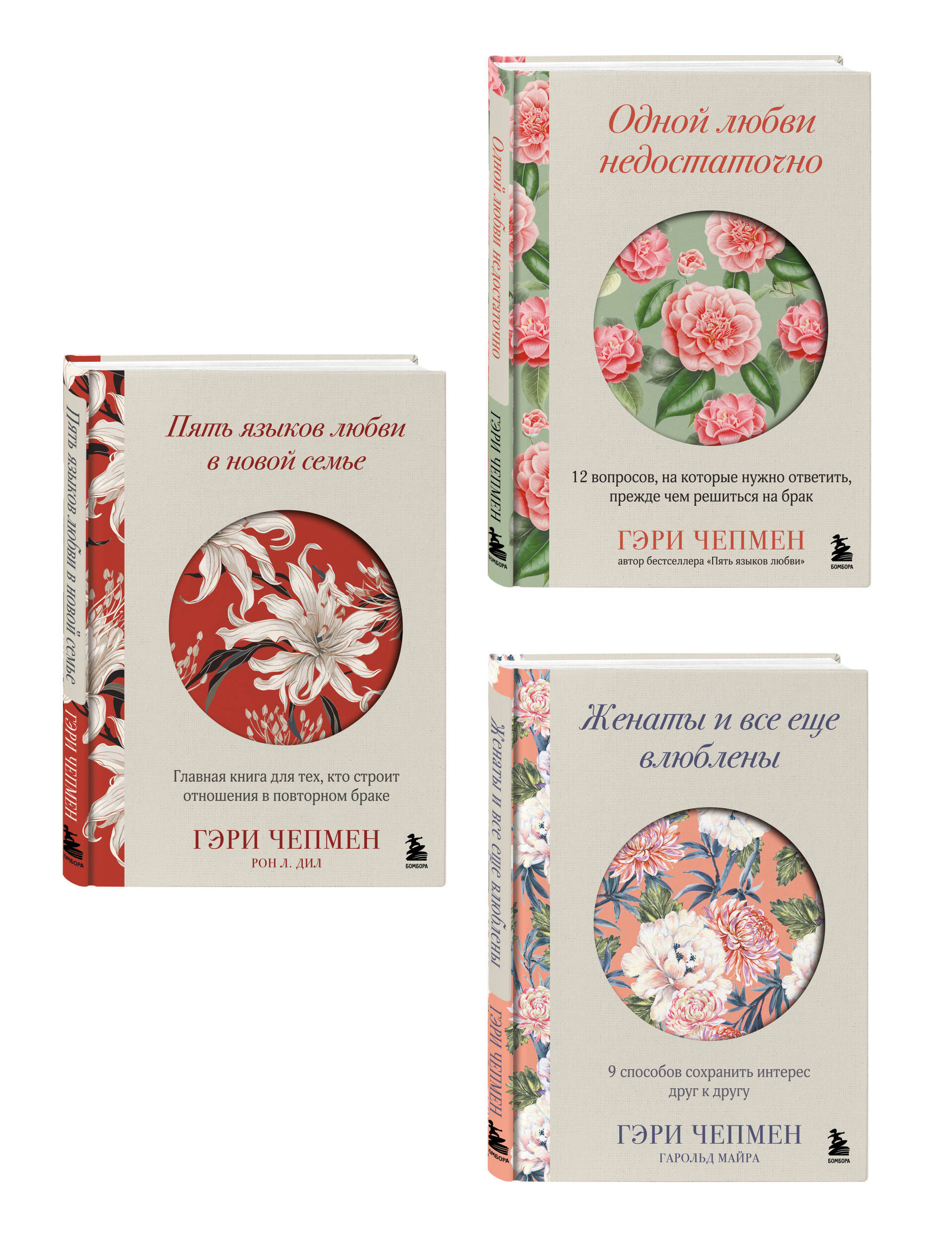 В комплекте три книги: «Одной любви недостаточно. 12 вопросов, на которые нужно ответить, прежде чем решиться на брак» + «Женаты и все еще влюблены. 9 способов сохранить интерес друг к другу» + «Пять языков любви в новой семье. Главная книга для тех, кто строит отношения в повторном браке». «Одной любви недостаточно. 12 вопросов, на которые нужно ответить, прежде чем решиться на брак»: ОДНОЙ ВЛЮБЛЕННОСТИ НЕДОСТАТОЧНО, ЧТОБЫ ПОСТРОИТЬ СЧАСТЛИВЫЙ БРАК. Он неряха, а она терпеть не может бардака. Она обожает шумные вечеринки, а он не выносит толпы. Он записывает каждую покупку, а она тратит деньги, не проверяя баланс по карте. Их брак обречен? Зачастую мы женимся, ослепленные влюбленностью, считая партнера идеальным. Но спустя пару лет после свадьбы начинаем подмечать все недостатки друг друга. Последние 40 лет Гэри Чепмен консультирует супругов, чьи мечты о счастливой семейной жизни разбились о мир грязной посуды, неоплаченных счетов, несогласованных графиков работы и плачущих младенцев. Чепмен убежден: развод - это отсутствие подготовки к браку и навыков партнерства. Он написал эту книгу, чтобы помочь молодым парам осознанно подойти к самому важному шагу в жизни - созданию семьи. Тем, кто уже в браке - не допустить кризиса, а если он случился, успешно его преодолеть. Гэри Чепмен поможет вам построить отношения своей мечты. В ЭТОЙ КНИГЕ: • 12 вопросов, на которые нужно ответить, прежде чем идти в загс. • 5 языков извинений. • 3 позитивных способа решения конфликтов. • Финансовый план, который помог тысячам пар избежать войны за деньги. «Женаты и все еще влюблены. 9 способов сохранить интерес друг к другу»: Первый признак счастливого брака длинною в жизнь - желание оставаться всегда влюбленными. Причем с возрастом близость и взаимопонимание в таких парах только крепнут. В книге «Женаты и все еще влюблены» эксперт по отношениям с 40-летним стажем Гэри Чепмен и его соавтор журналист и издатель Гарольд Майра показывают, что даже спустя многие годы отношения супругов могут быть «романтическими», приносить удовольствие, новые впечатления и много любви. «Стремиться нужно к единству, а не к единообразию» - эта неочевидная истина поможет вам по-новому взглянуть на себя и своего партнера. Книга подскажет, как пронести интерес друг к другу сквозь года, вдохновит на совместные приключения и поможет вспомнить, что же это за чувство такое - влюбленность. Вы узнаете, как: • разнообразить супружескую жизнь; • юмор помогает сохранить отношения; • вместе пережить сепарацию детей; • продолжать вдохновлять и дарить друг другу новые впечатления. «Пять языков любви в новой семье. Главная книга для тех, кто строит отношения в повторном браке»: Гэри Чепмен - самый известный в мире эксперт по вопросам семьи и брака. Его концепция «5 языков любви» легла в основу множества научных трудов и научно-популярных книг о романтических отношениях. В серию «Цветущий сад. Язык любви, который поможет отношениям раскрыться» вошли книги о том, как применять на практике теорию о пяти языках любви. Какой бы ни была ваша личная жизнь сегодня, в этих книгах вы найдете принципы, которые помогут вашим отношениям развиваться и процветать. «Пять языков любви в новой семье» написана Гэри Чепменом совместно со специалистом по работе со смешанными (сводными) семьями Роном Л. Дилом. В русском яз