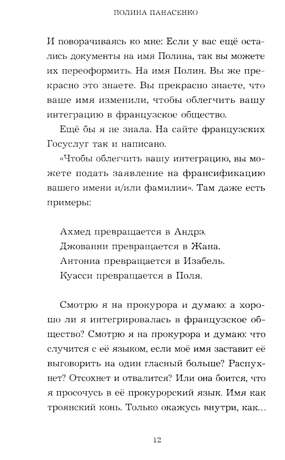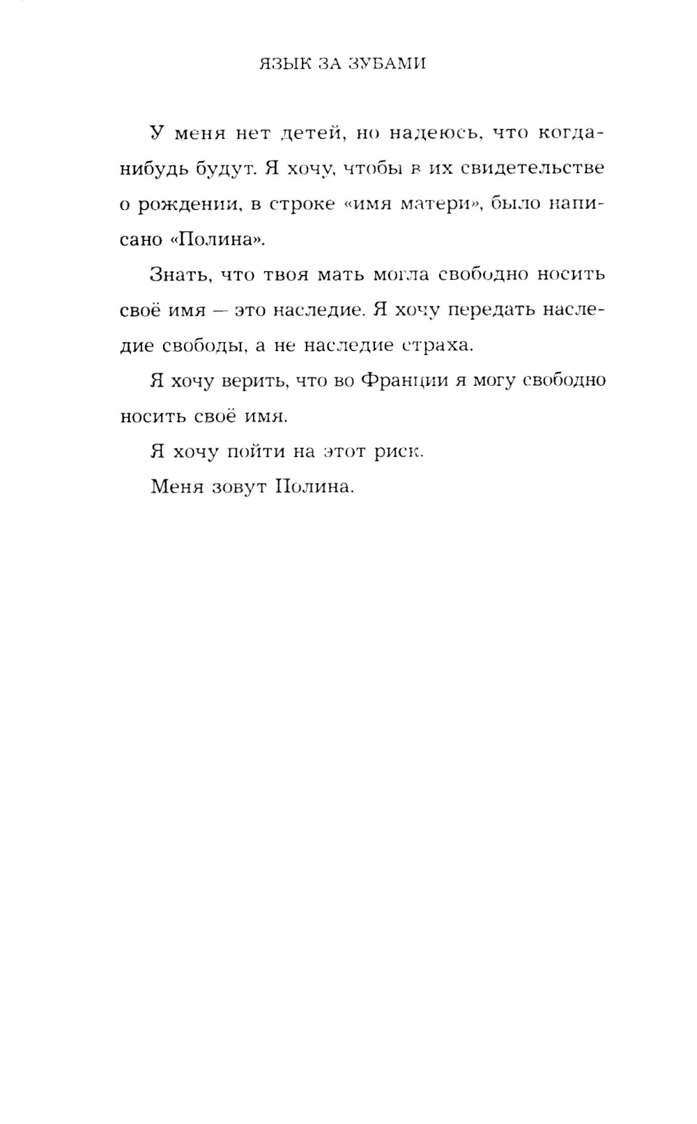 Прошлое и настоящее в этой трогательной, нежной, бунтарской истории переплетаются, создавая колоритный, невероятно искренний портрет девушки, отстаивающей право смешивать французский с русским, носить своё имя и не отвечать на вопрос, какую страну ты любишь больше. Полина ещё совсем маленькая девочка, когда её семья в 1990-е годы эмигрирует во Францию. Ей приходится привыкать к новым условиям жизни, осваивать новый язык и местные традиции. Каждое лето семья возвращается в Россию, где их ждут любимые дедушка с бабушкой, дачные грядки и вечный вопрос о том, когда же они наконец вернутся на родину? Со временем Полина всё сильнее разрывается между двумя языками, двумя странами, двумя культурами. А потому ей важно, чтобы во французских документах было написано не Полин, а Полина. Так начинается долгий путь бюрократических тяжб с государством… Пронзительный роман-автофикшен, исследующий опыт эмиграции и попытки сохранить своё собственное «я».| Издательство | Livebook (Лайвбук) |