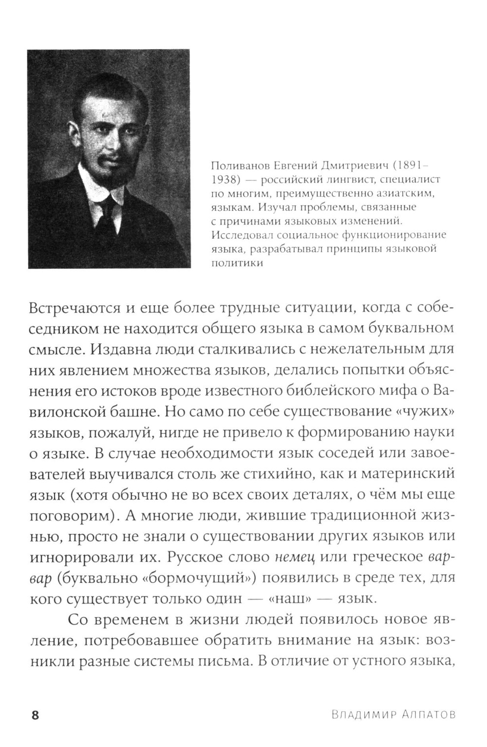 Что такое языкознание, или лингвистика? Чем занимается эта наука, какие проблемы перед ней стоят? Эта книга рассказывает об истории лингвистики с древнейших времен до современности и показывает, как наука старается ответить на три главных вопроса, связанных с языком - как он устроен, как изменяется со временем и как функционирует. Многие даже образованные люди, думают, что лингвисты - это полиглоты, которые просто знают много языков. Это заблуждение вполне понятно - выражение «изучать язык» может быть истолковано по разному, но не имеет ничего общего с действительностью. Книга Владимира Алпатова рассказывает, чем на самом деле занимаются лингвисты и что их интересует. Зачем они читают старинные рукописи, отправляются в экспедиции в джунгли и пишут компьютерные программы. Как появились лингвистические теории и как они помогают решать практические задачи: преподавать языки, разрабатывать письменности, создавать алгоритмы машинного перевода.| Издательство | Альпина нон-фикшн |