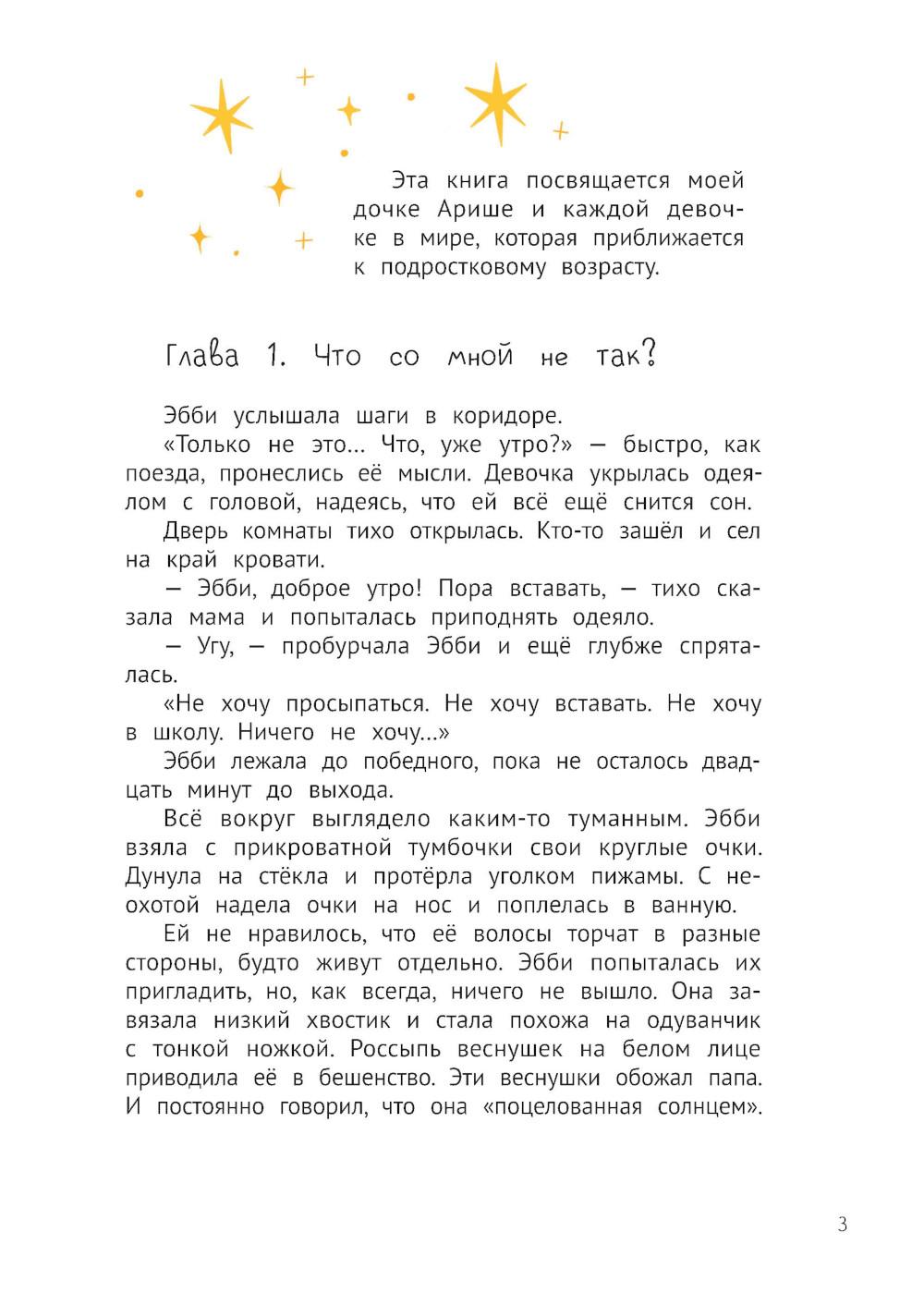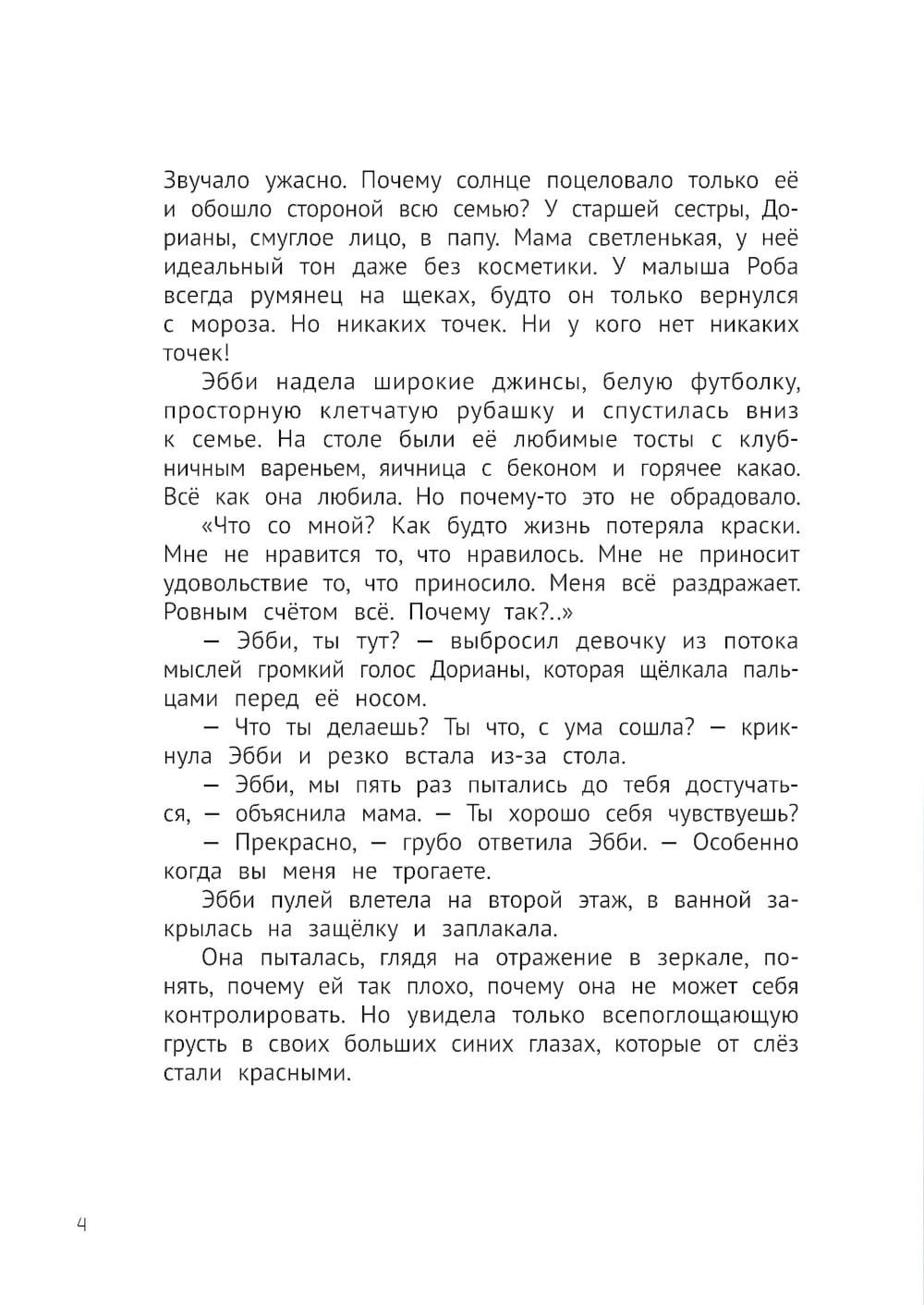 Эбби исполняется десять лет, и начинается переходный возраст, а вместе с ним в её жизнь приходит множество изменений. Она всё чаще задаётся вопросами: резкие смены настроения, постоянные протесты и споры-откуда это в ней? Откуда взялась раздражительность? Почему вещи, которые нравились раньше, больше не нравятся? На сложном пути взросления Эбби находит поддержку и учится чувствовать и искать, что ей действительно интересно, старается наладить отношения с сестрой и родителями, со сверстниками и с самой собой.| Издательство | Феникс |