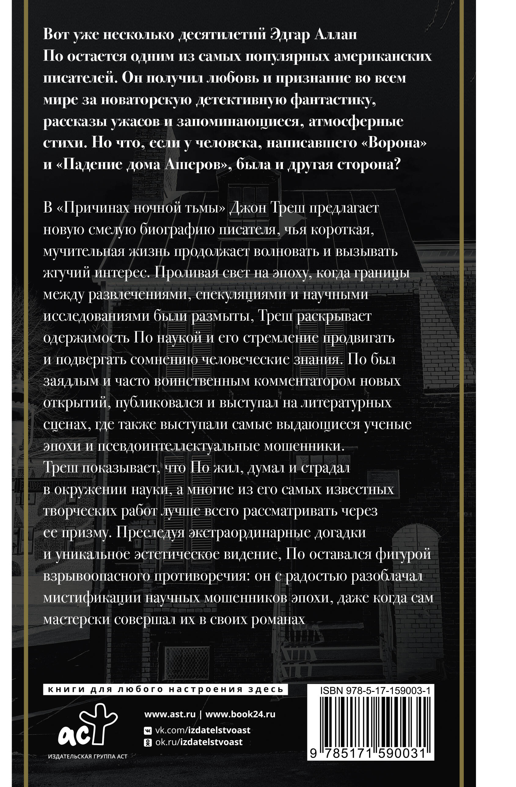 В «Причинах ночной тьмы» Джон Треш предлагает новую смелую биографию писателя, чья короткая, мучительная жизнь продолжает волновать и вызывать жгучий интерес. Проливая свет на эпоху, когда границы между развлечениями, спекуляциями и научными исследованиями были размыты, Треш раскрывает одержимость По наукой и его стремление продвигать и подвергать сомнению человеческие знания.| Издательство | ИЗДАТЕЛЬСТВО "АСТ" |